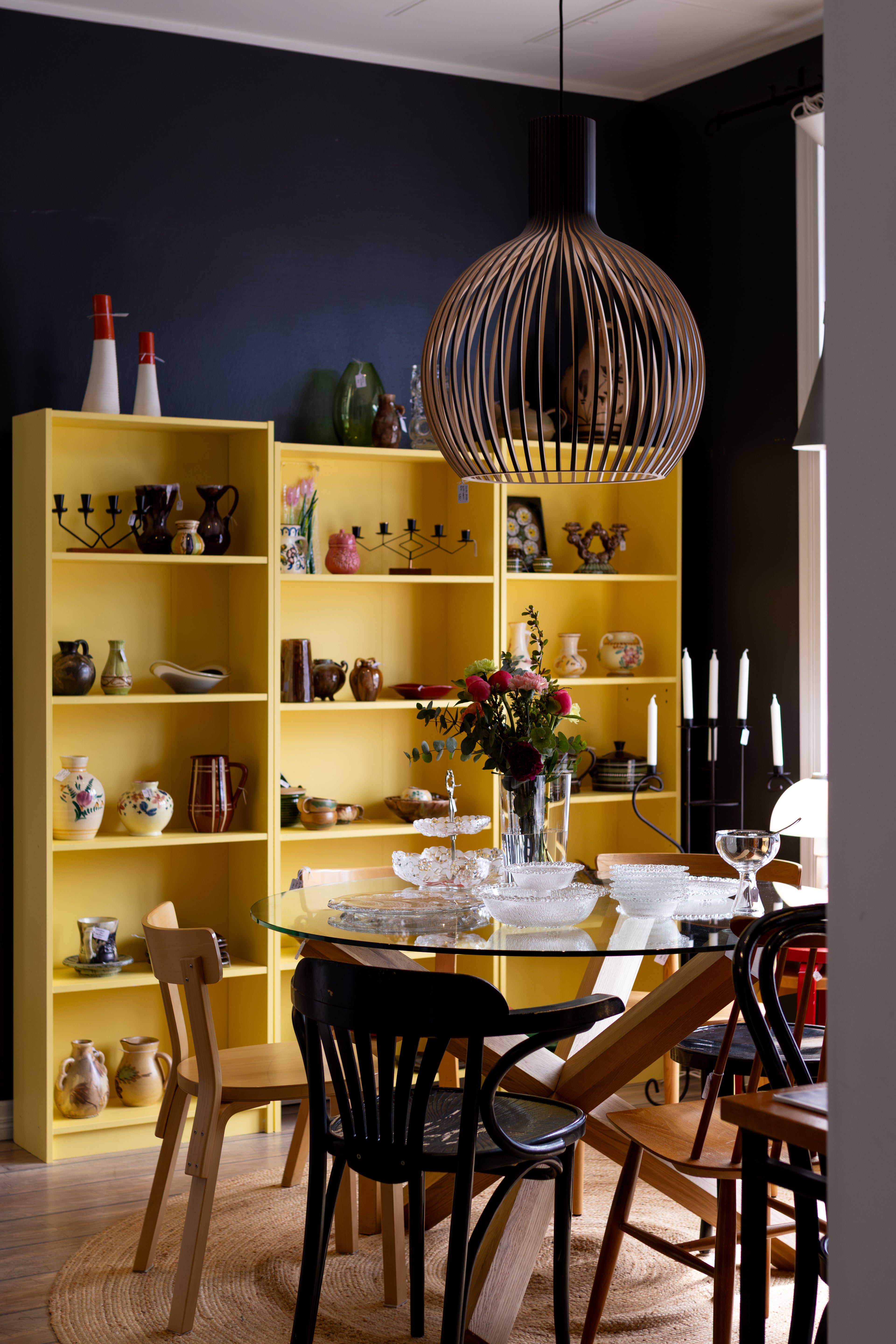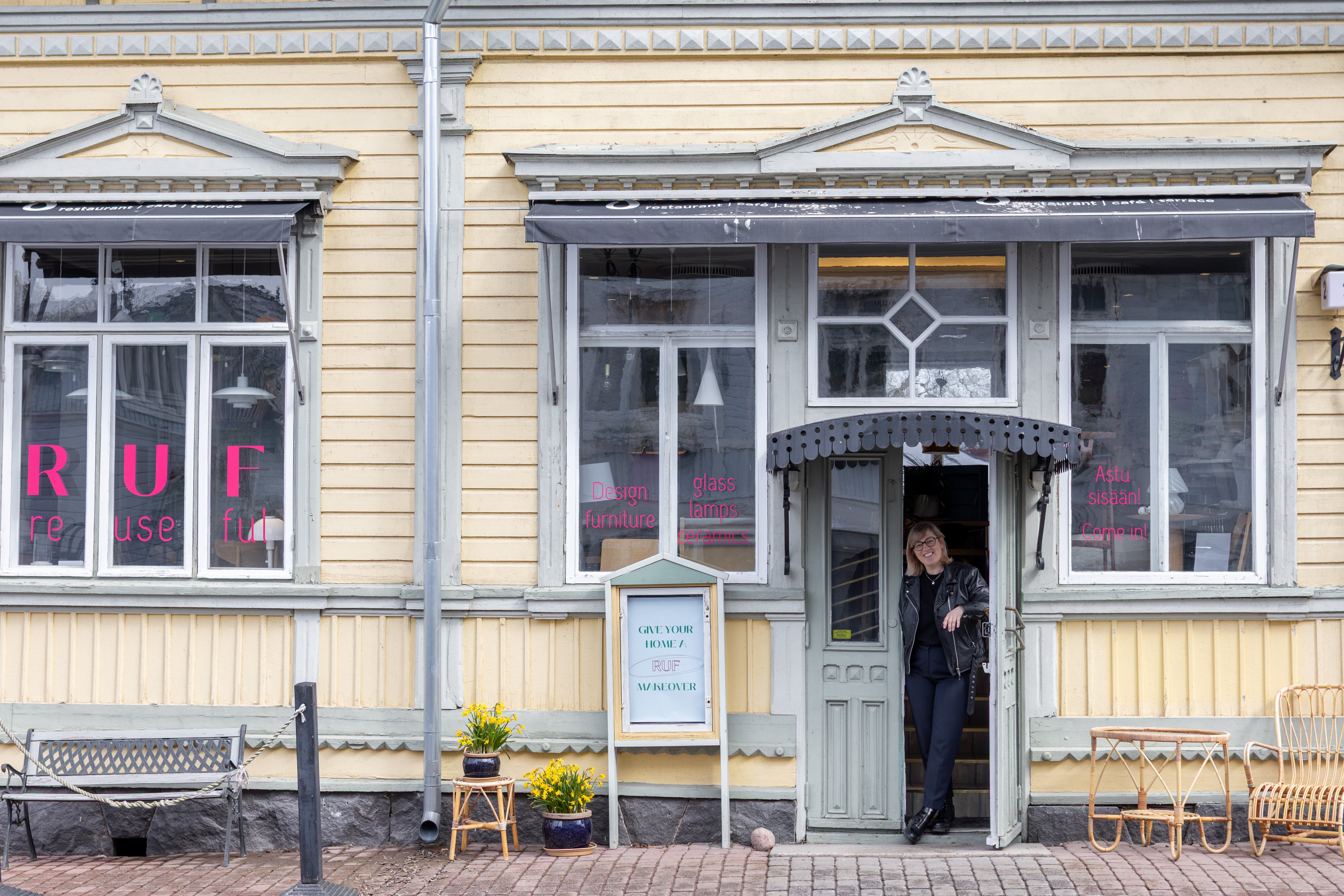 Studio Naantalissa, kalustettuna RUF second handin valikoimalla. Tila, jossa kalusteet ja esineet saavat näkyä ja olla käytössä.
