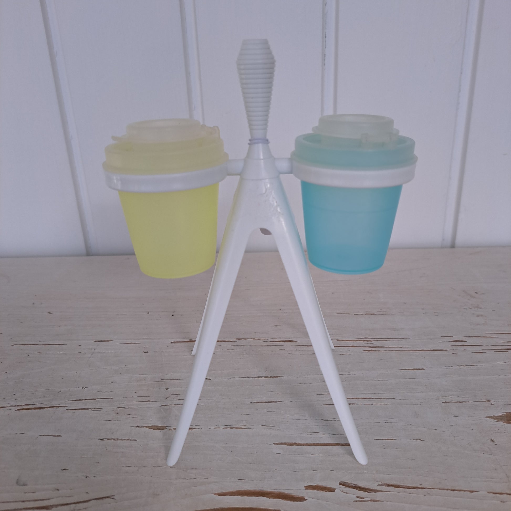 Vintage Tupperware 1960s "SpaceAge" spice rack with salt and pepper shakers. Both the shakers and the white rack are guaranteed Tupperware quality!