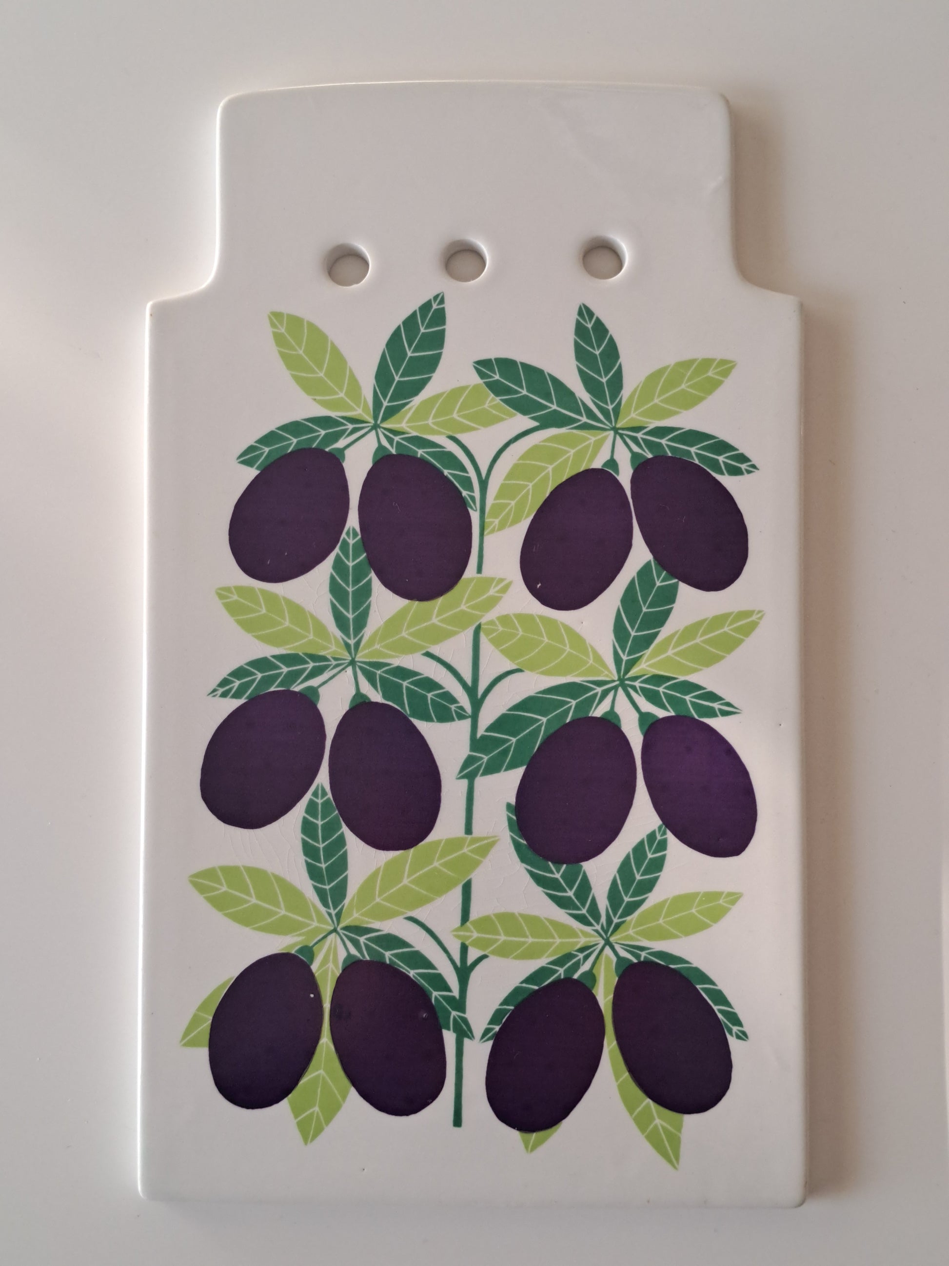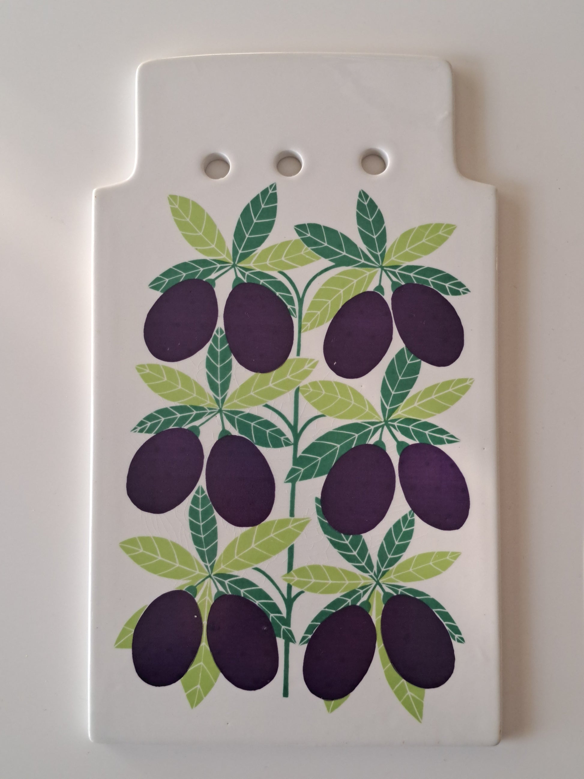 Arabian valmistama luumu pomona leikkuulauta/talouslevy. Posliinisen leikkuulaudan on suunnitellut Raija Uosikkinen.