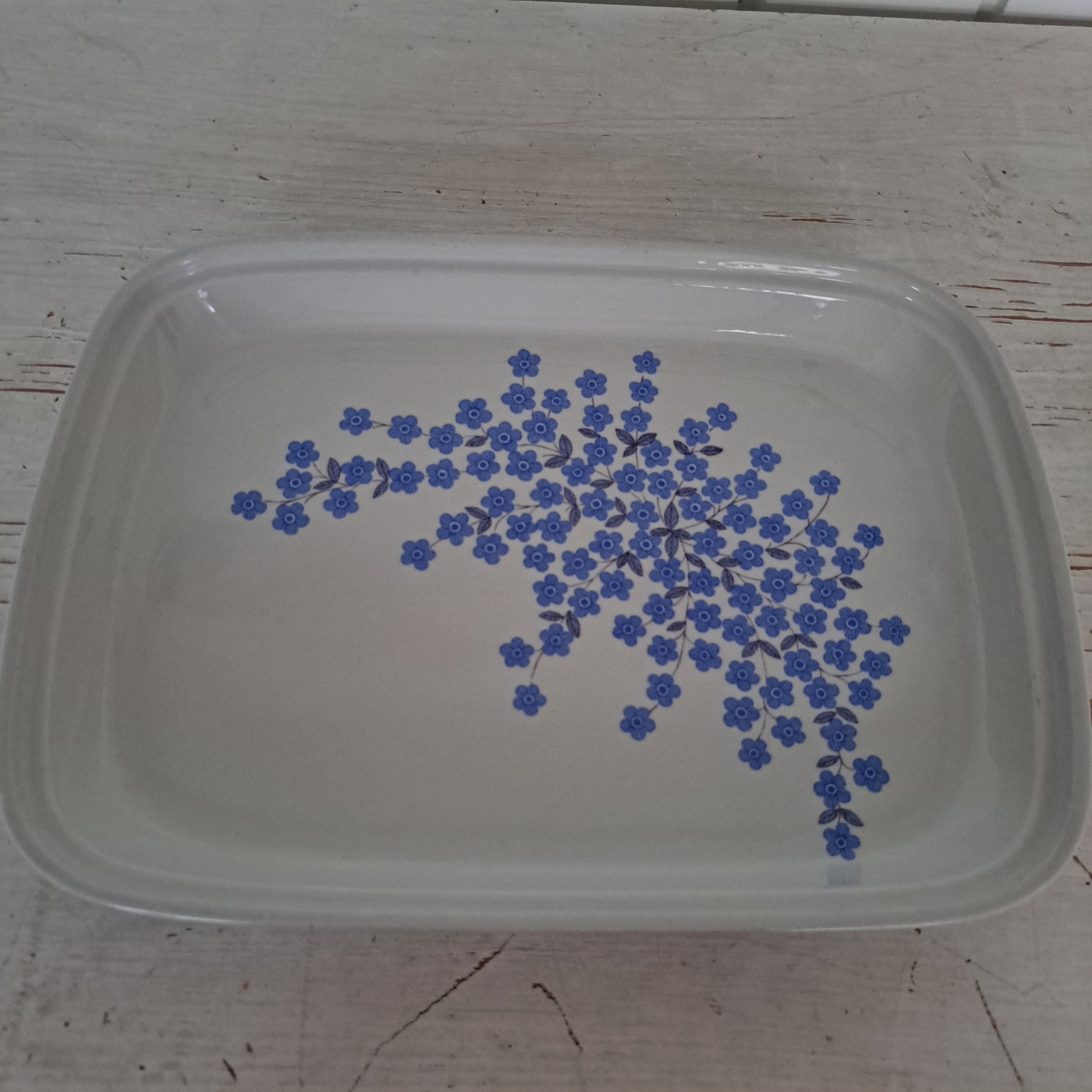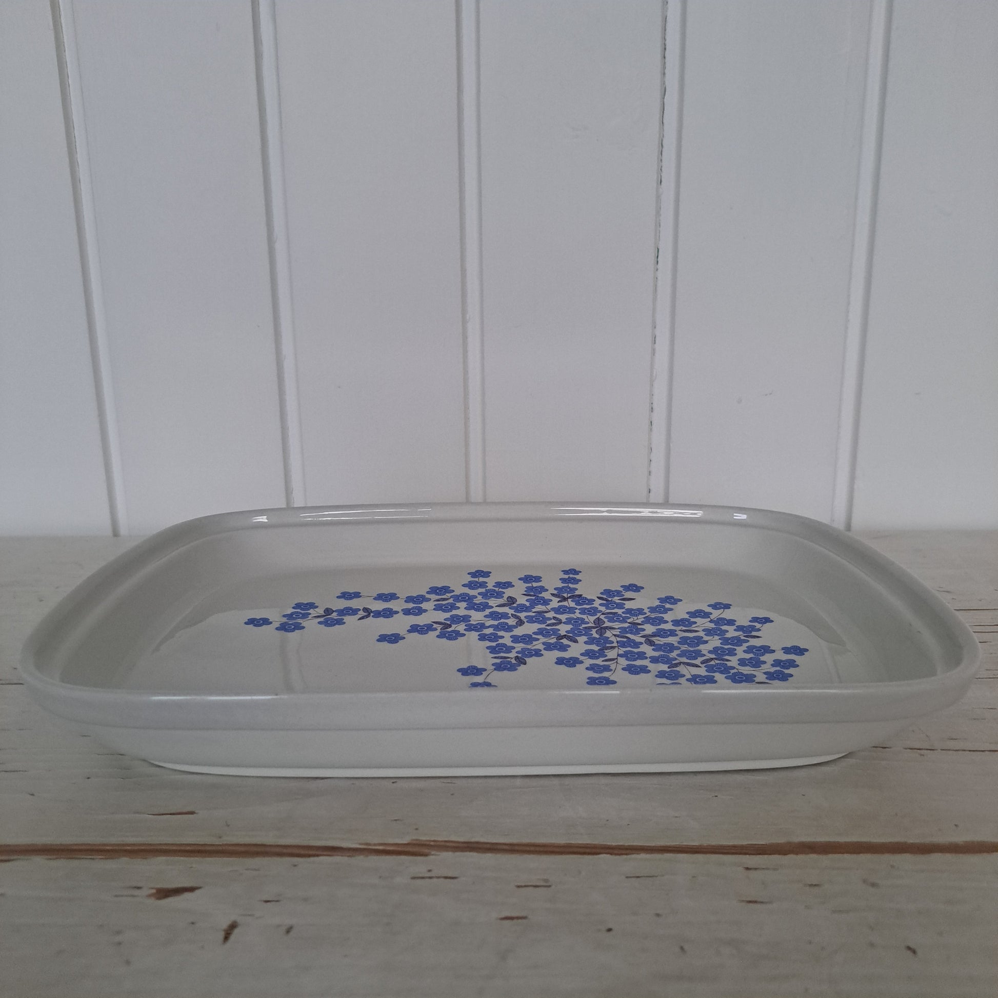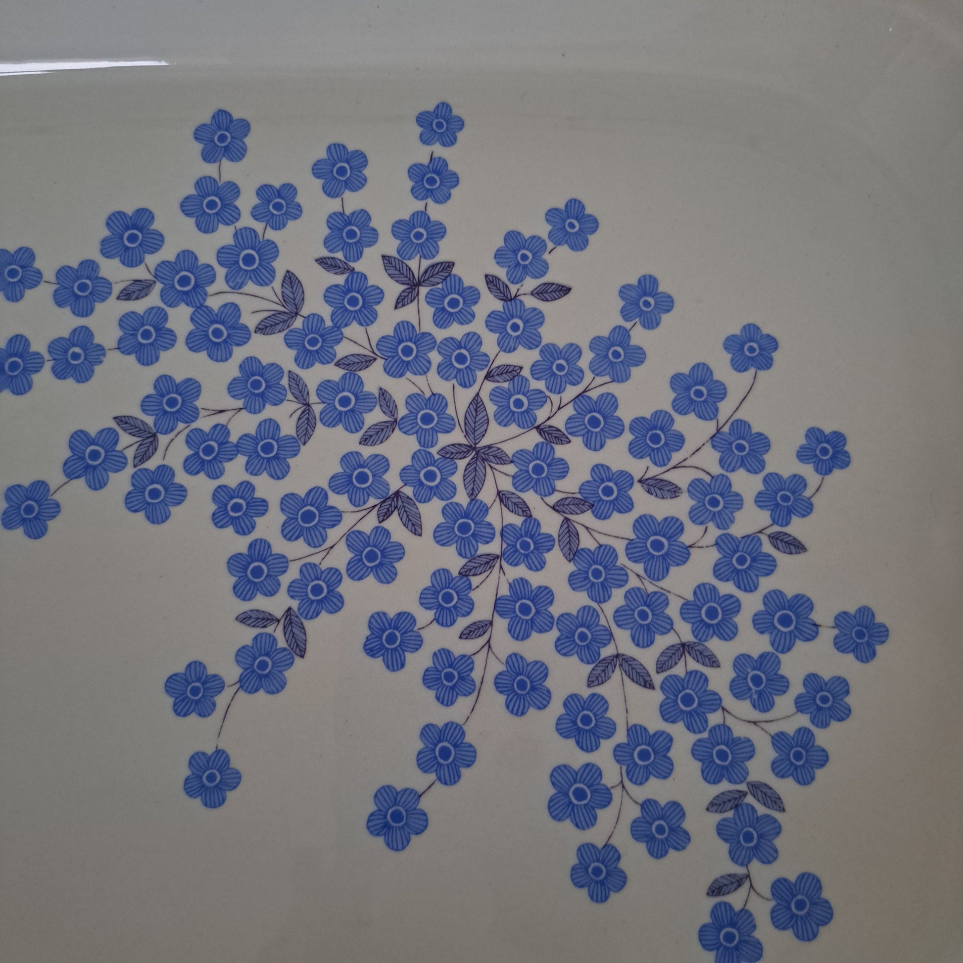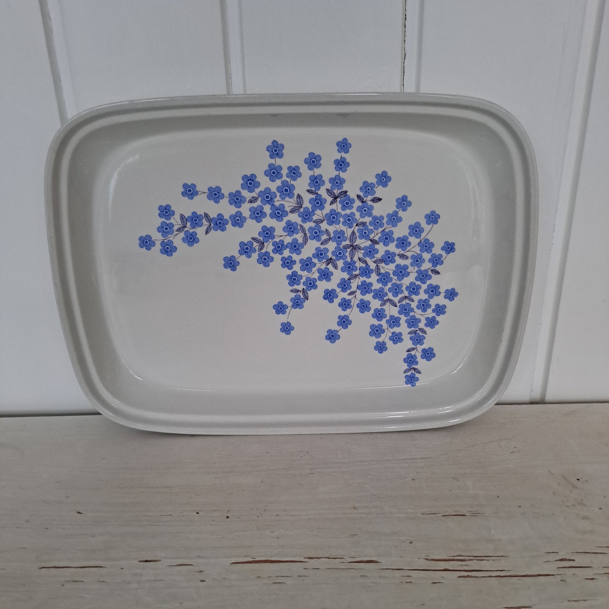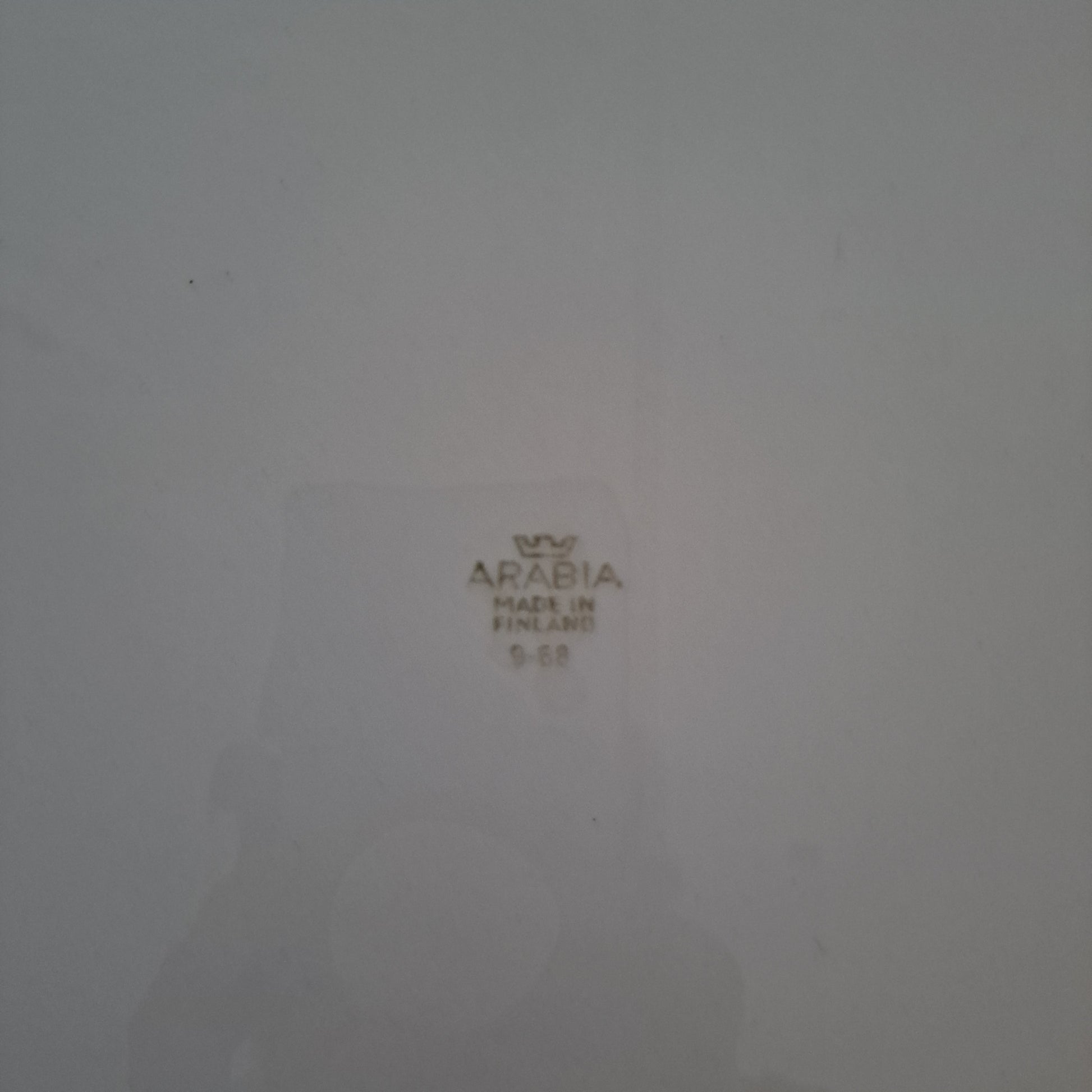 Arabian tyylikäs jaraikas Mesimarja tarjoiluvati vuodelta 1968. Kaunis kukkakuvio on Raija Uosikkisen suunnittelema.