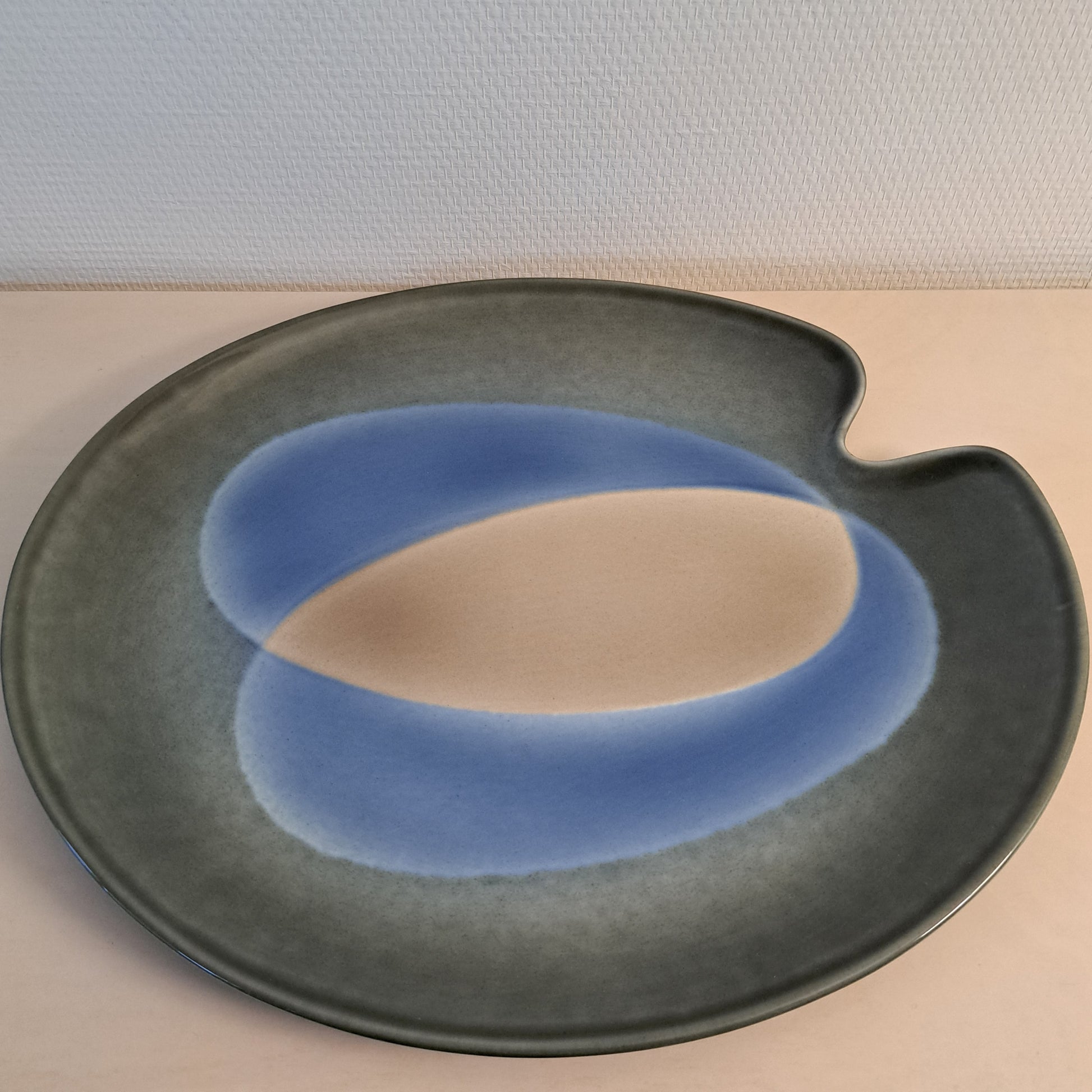 Arabian valmistama ja Heljä Liukko-Sundströmin suunnittelema upea ja näyttävä, käsinmaalattu lautanen vuodelta 1995. Tämä Paletti on värisävyltään sini-harmaa. Signeerattu.