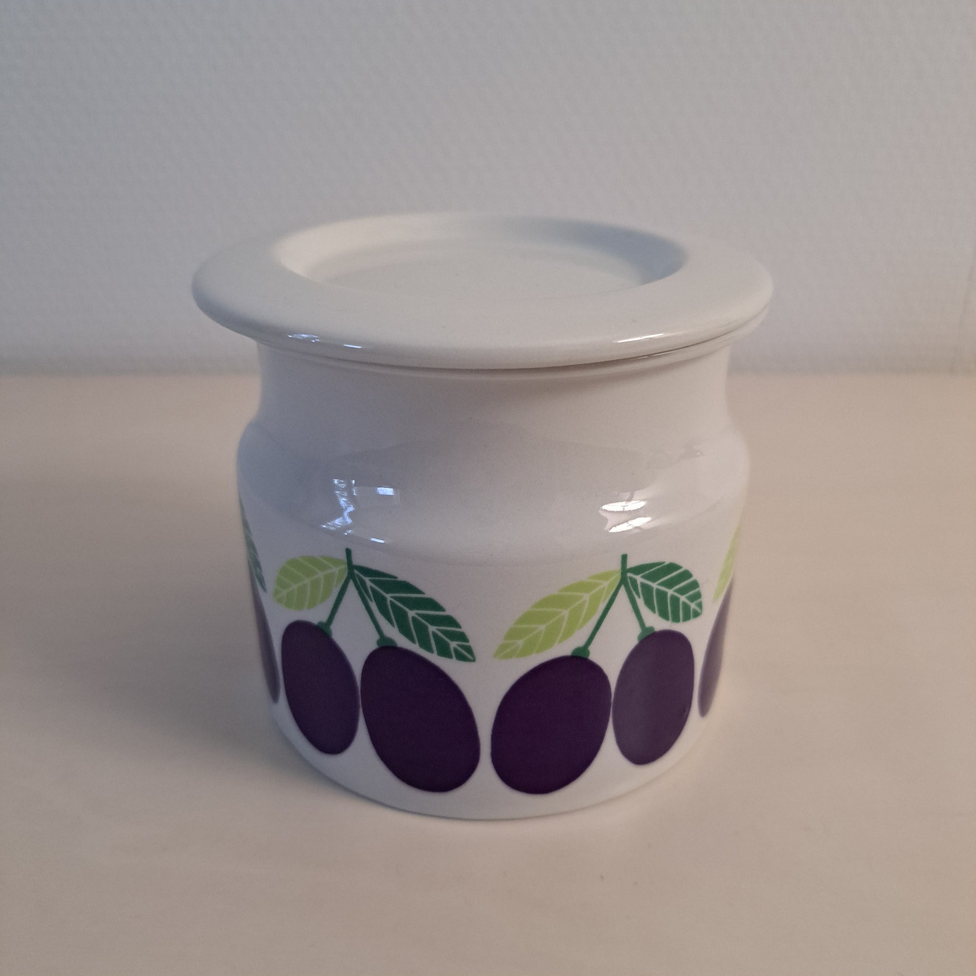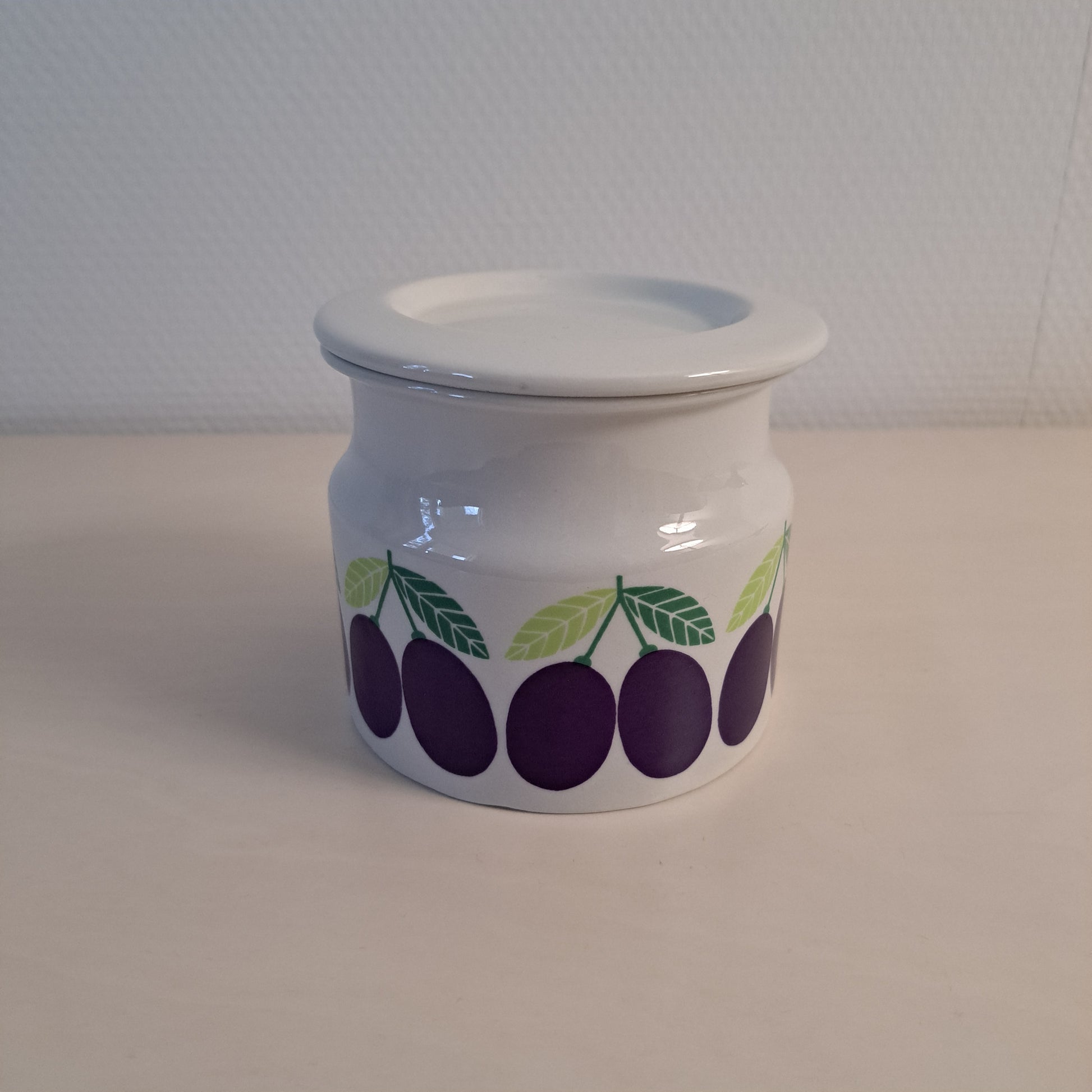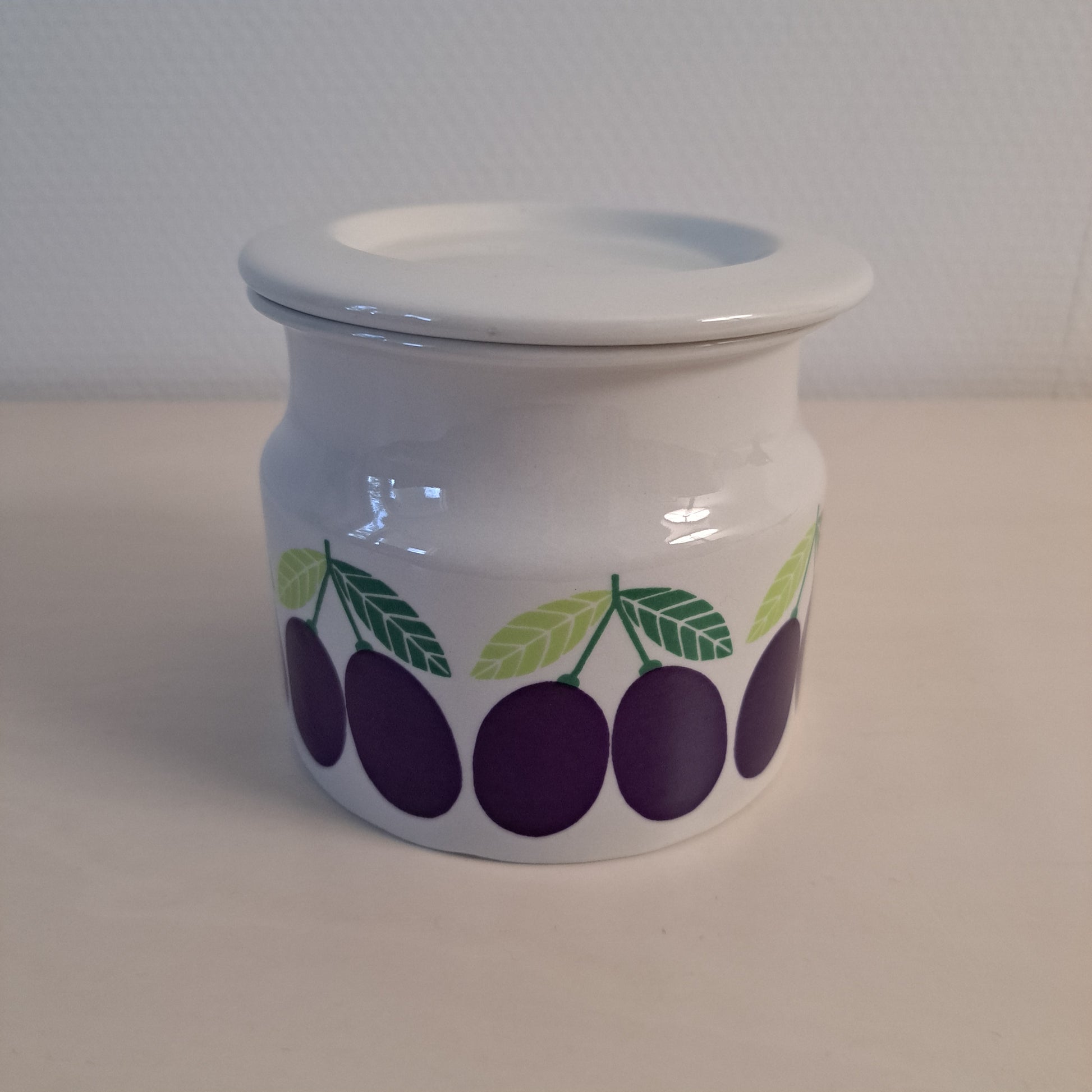 Arabian iki-ihana, kannellinen hillopurkki, jonka on suunnitellu Raija Uosikkinen. Vintage Pomona Luumu, 1970-luvun alusta.