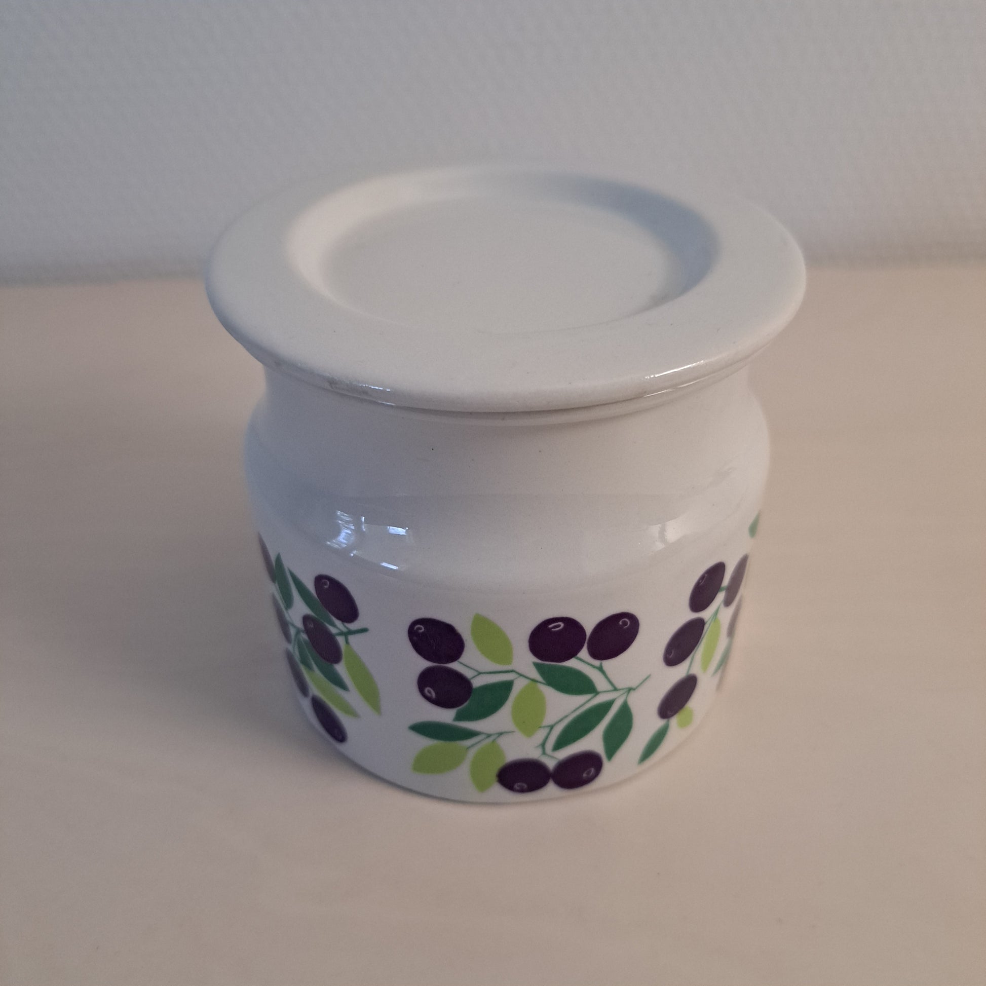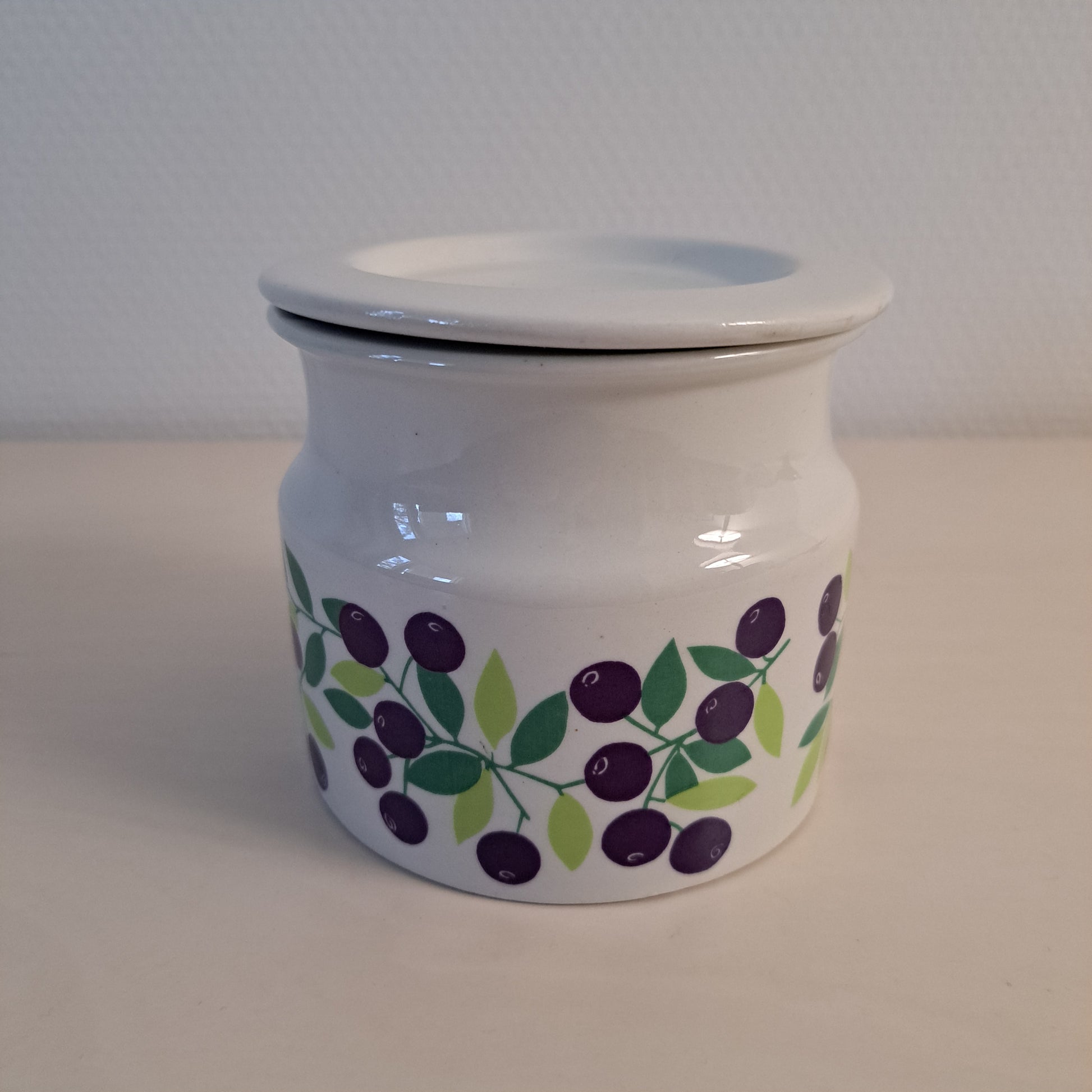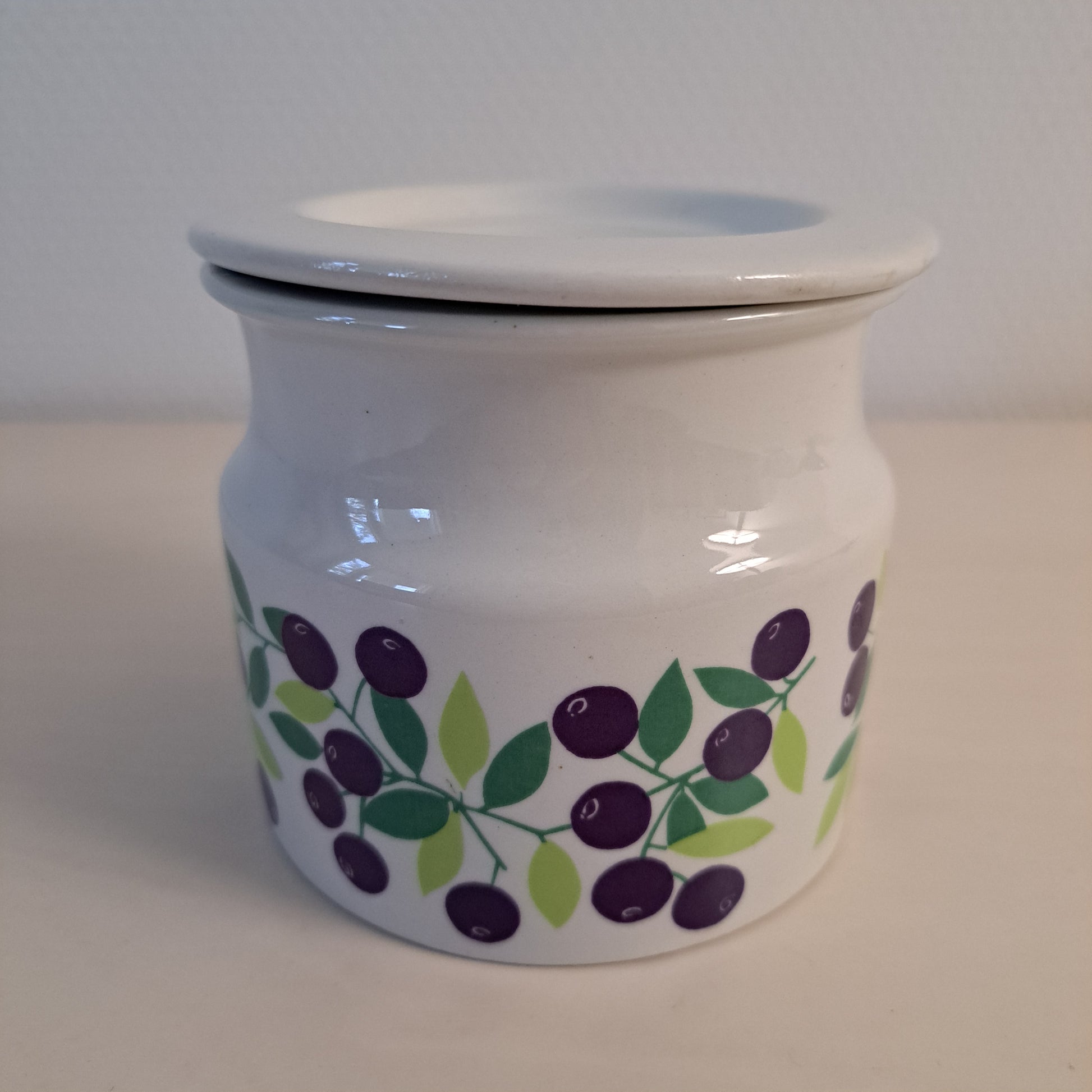Arabian iki-ihana, kannellinen hillopurkki, jonka on suunnitellu Raija Uosikkinen. Vintage Pomona Mustikka vuodelta 1968.