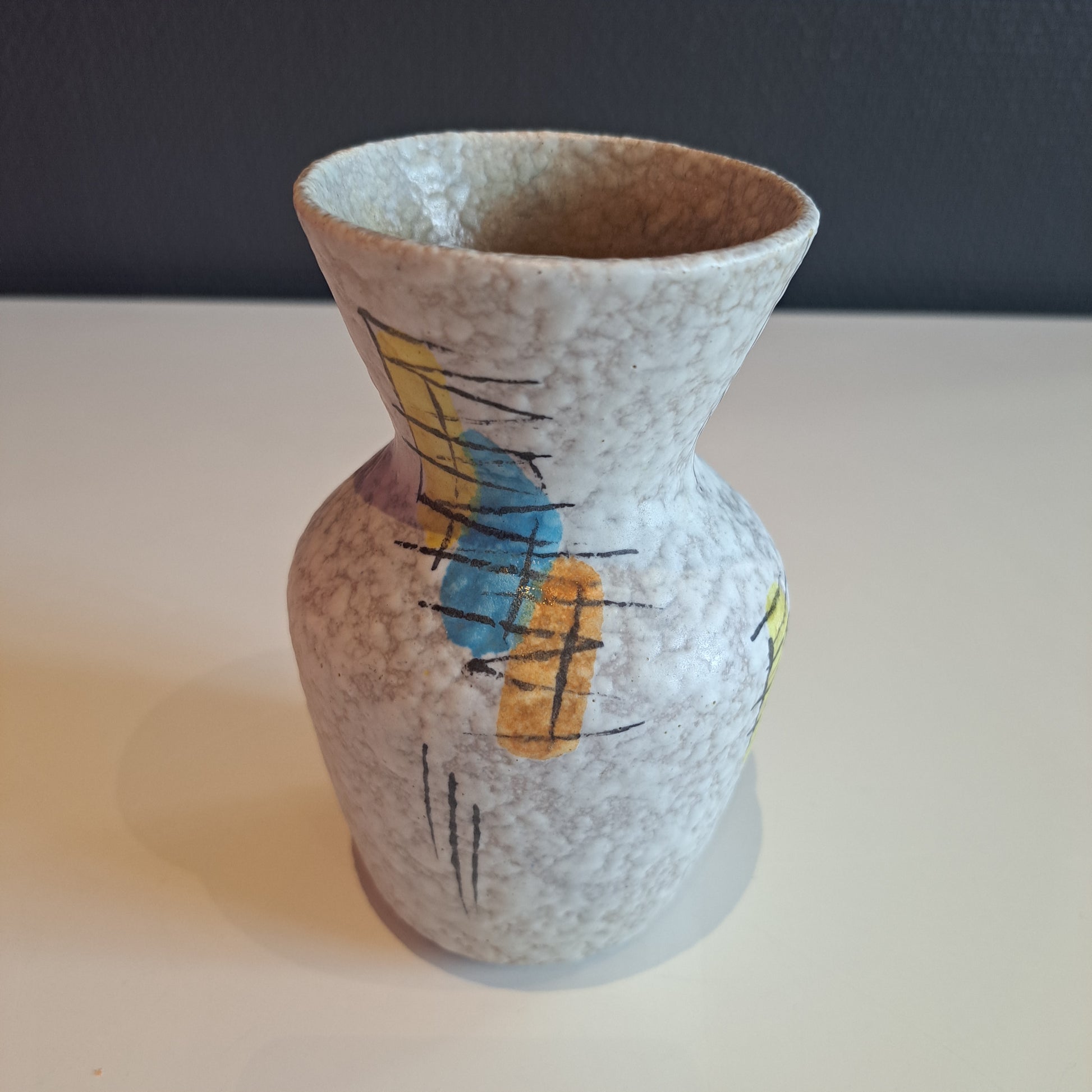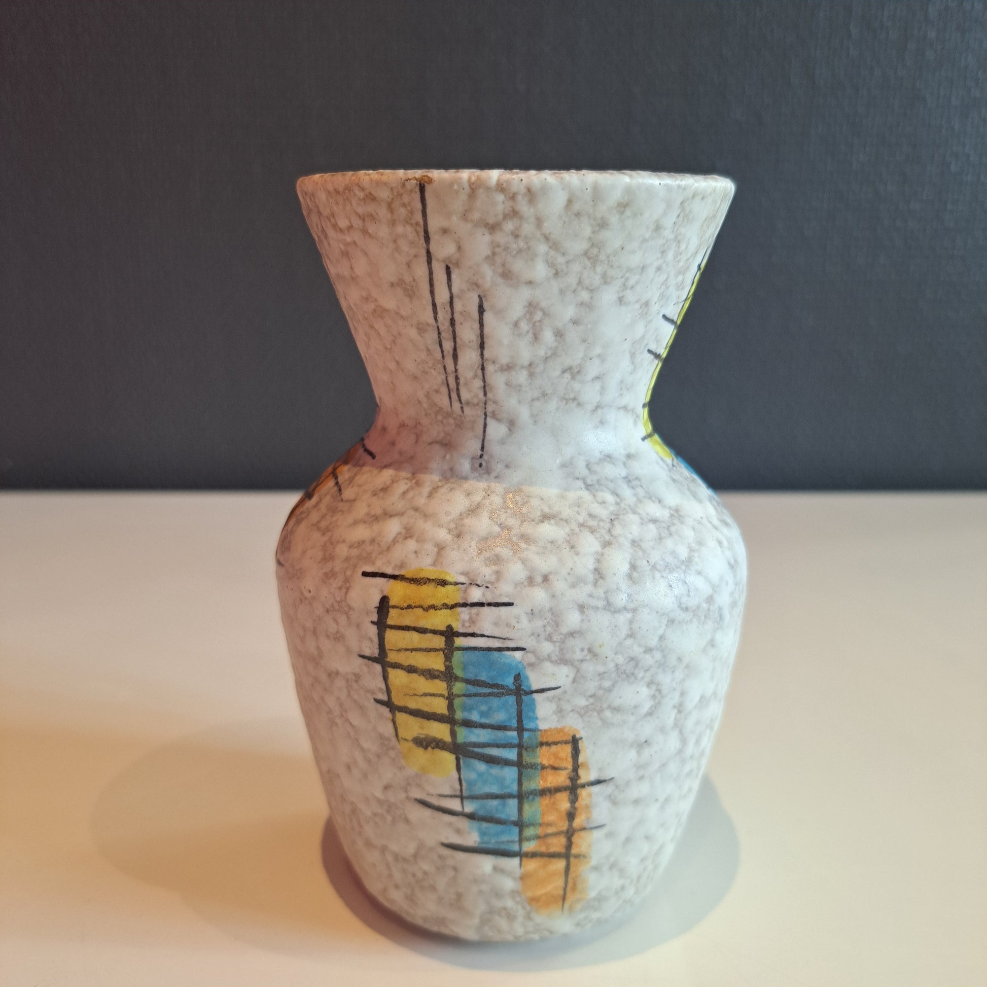 Saksalaisen Bay Keramikin valmistama ja Bodo Mansin suunnittelema maljakko 1950-luvulta. Maljakossa on käsinmaalatut keltaiset, siniset, mustat ja terrakotat graafiset kuvioinnit, pohjavärin ollessa kermanvalkoinen. Maljakko on lasitettu, mattapintainen.