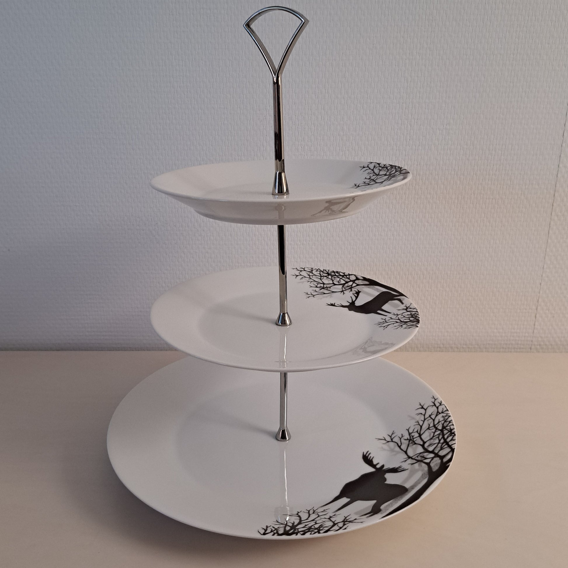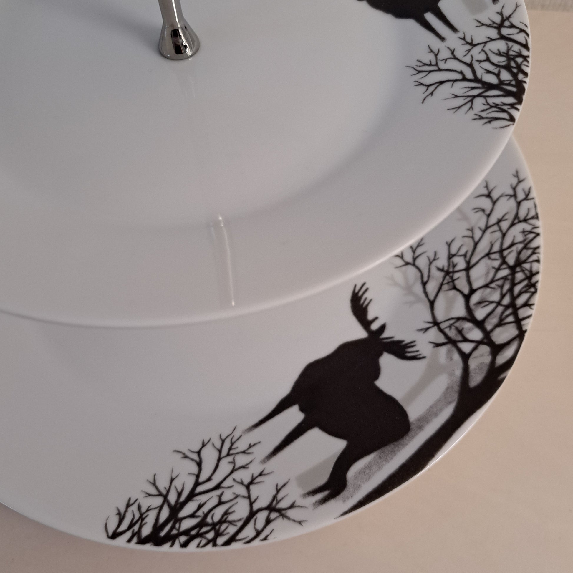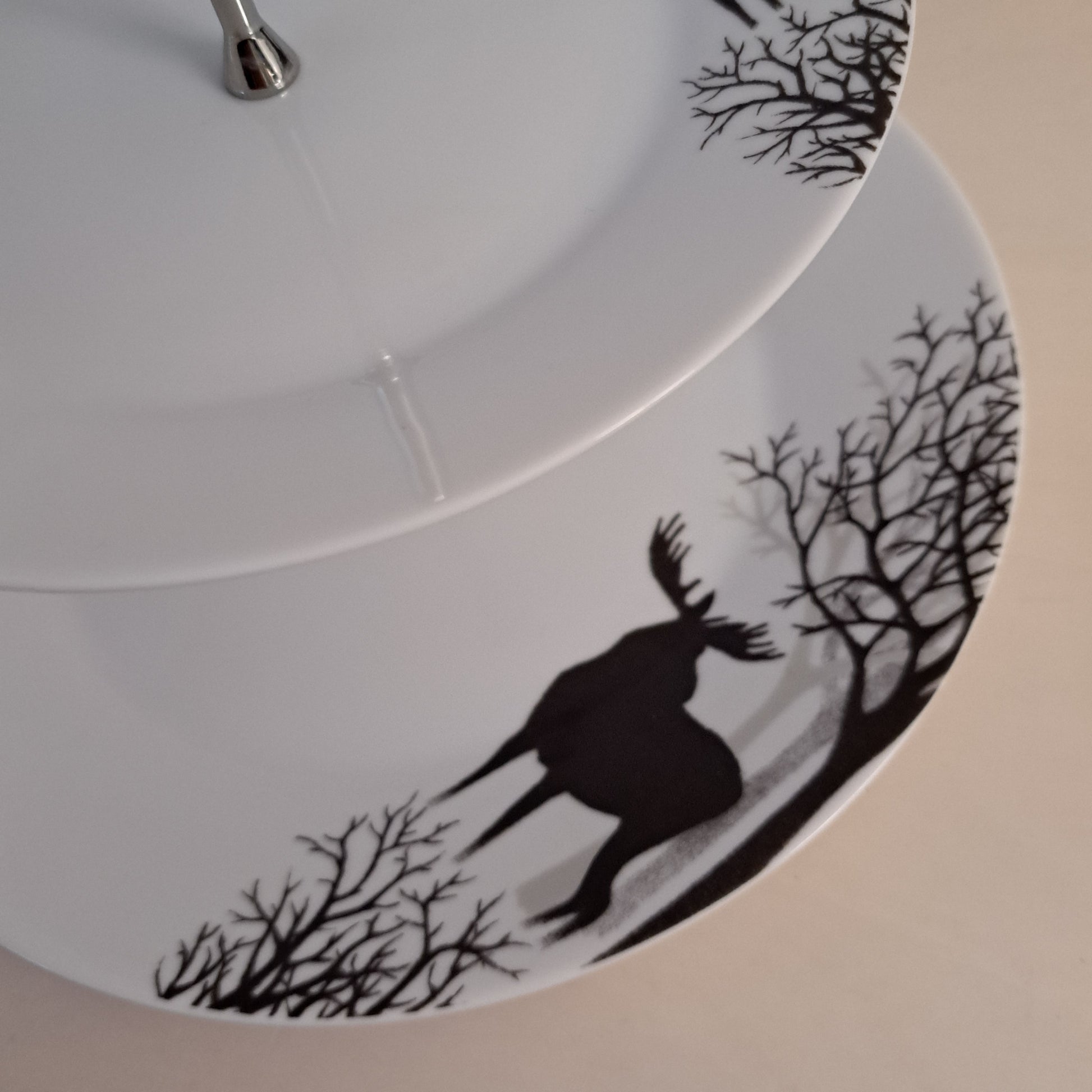 Ruotsalaisen Fyrklövernin valmistama, Erämaa-sarjan 3-kerroksinen tarjoiluastia sekä kaksi tarjoilulautasta. Erämaa-sarjan astioissa on kaunis, mustan ja hopeaharmaan värinen puu- ja riistakuviointi.