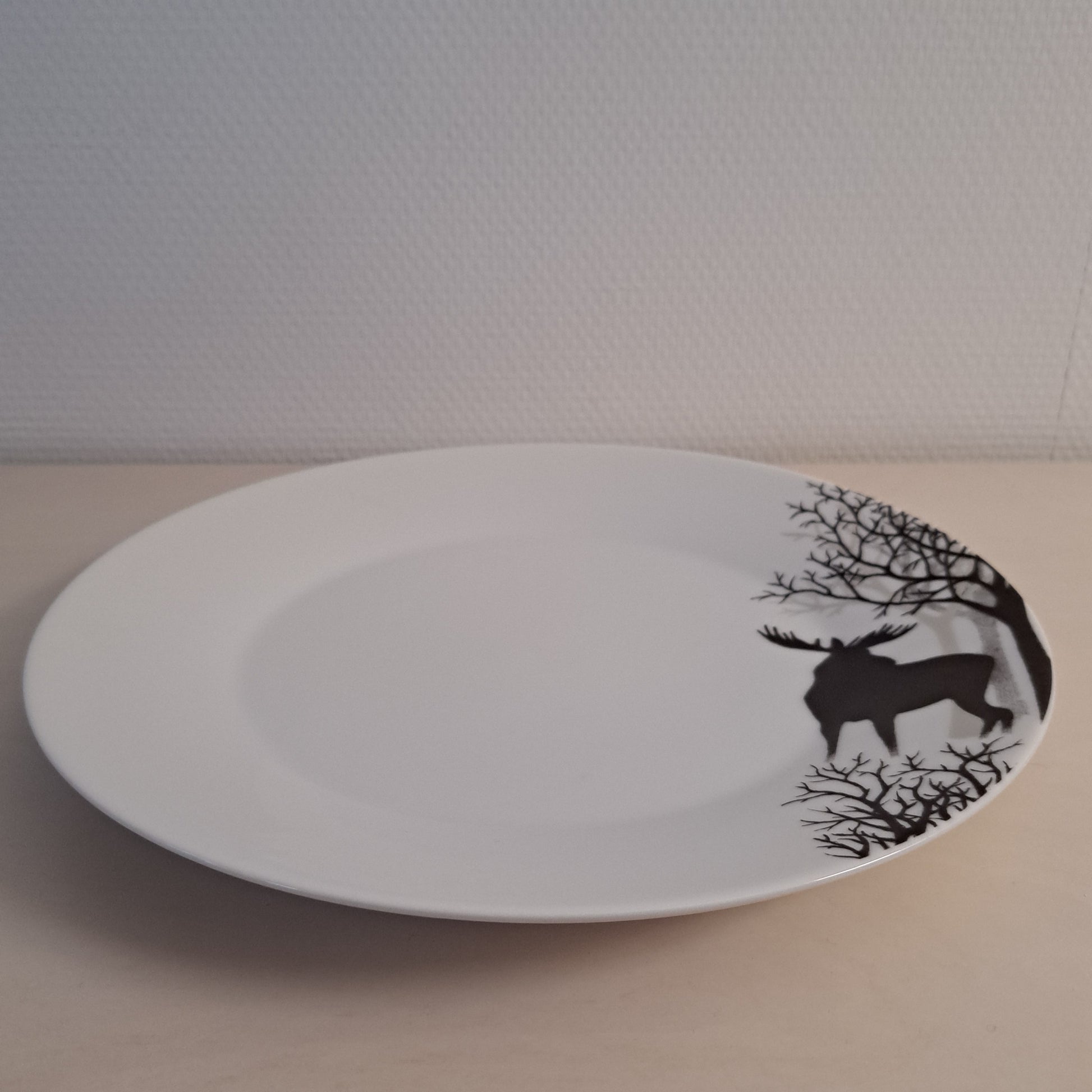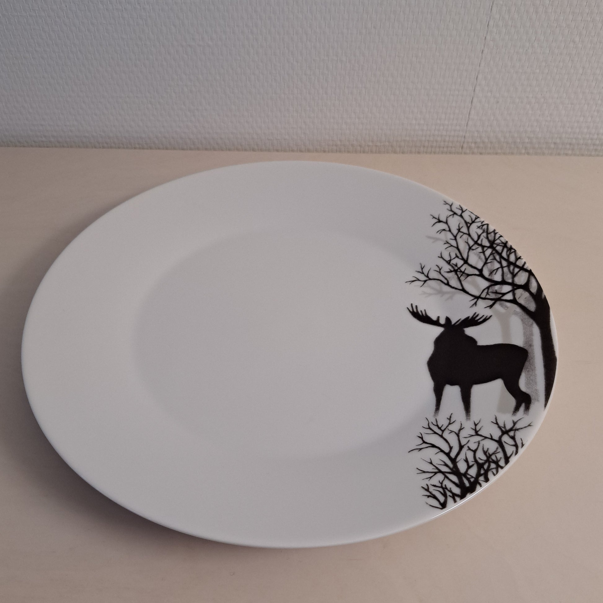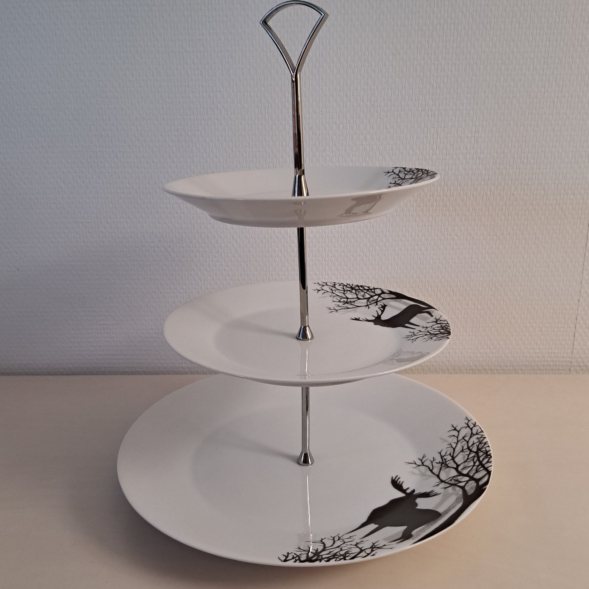 Ruotsalaisen Fyrklövernin valmistama, Erämaa-sarjan 3-kerroksinen tarjoiluastia sekä kaksi tarjoilulautasta. Erämaa-sarjan astioissa on kaunis, mustan ja hopeaharmaan värinen puu- ja riistakuviointi.