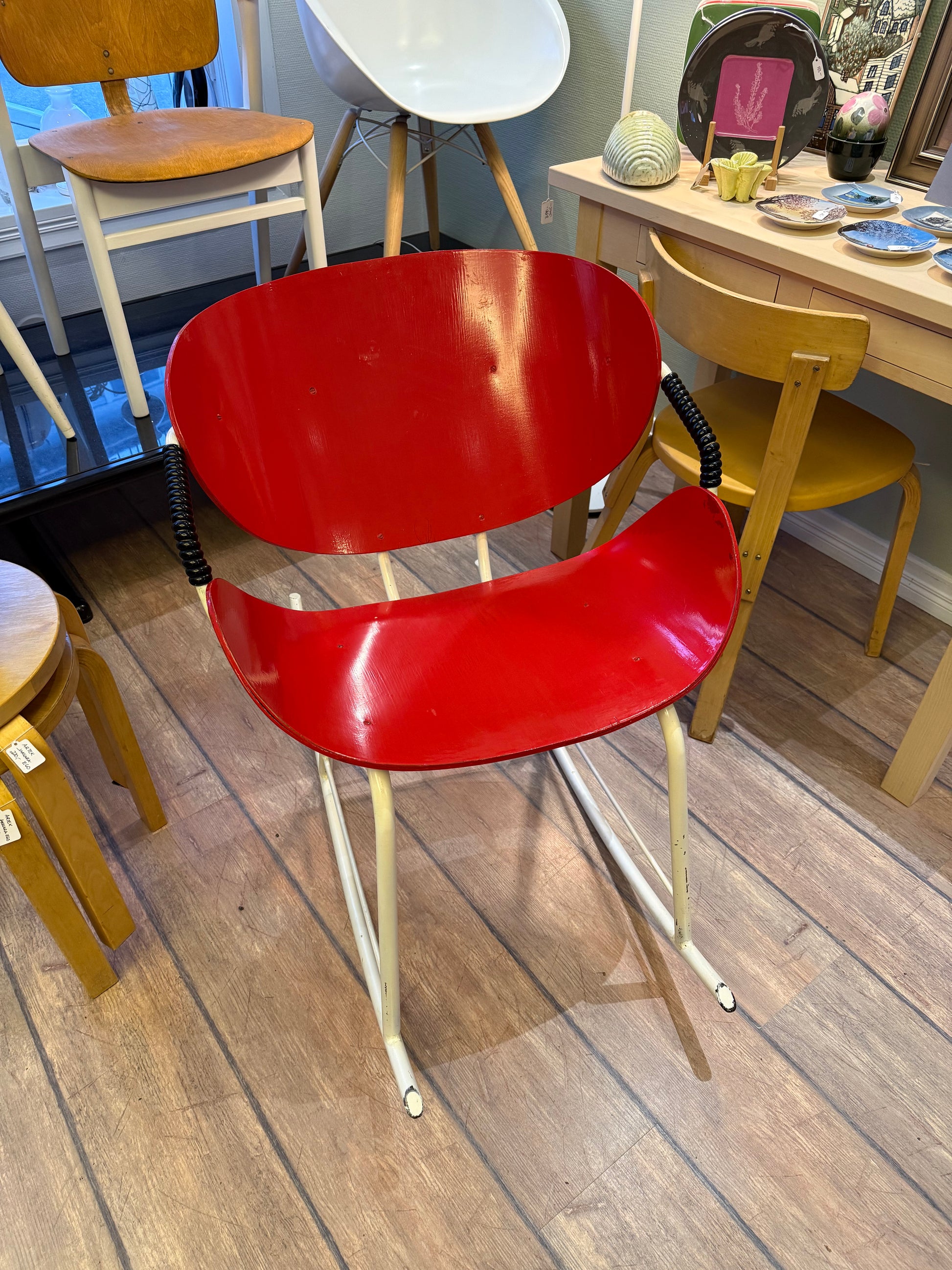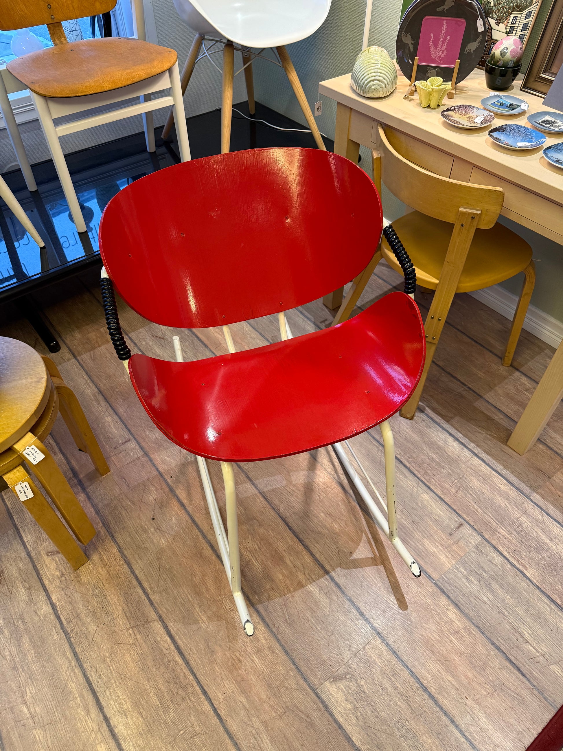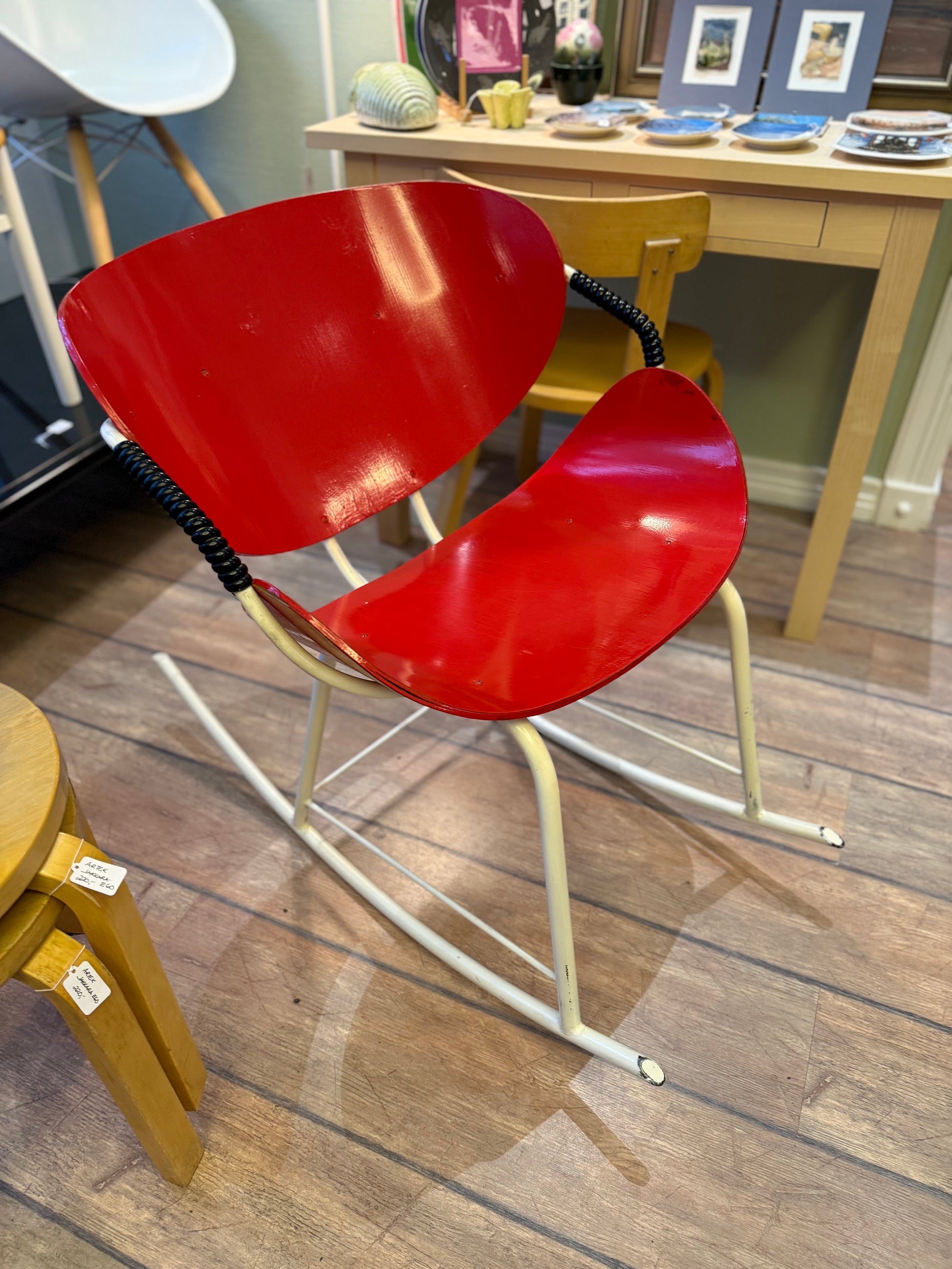 Tämä myynnissä oleva keinutuoli on 1950-luvulta ja se on Olaf, Ola, Kettusen suunnittelema. Keinutuolin istuinosa on punaista, taivutettua vaneria, runko valkoiseksi maalattua metallia ja käsinojissa on sympaattiset, mustat kierrepäällykset! Tässä keinutuolissa on hyvä ergonimia ja vaikka se on jo iäkäs, sen kunto on hyvä!