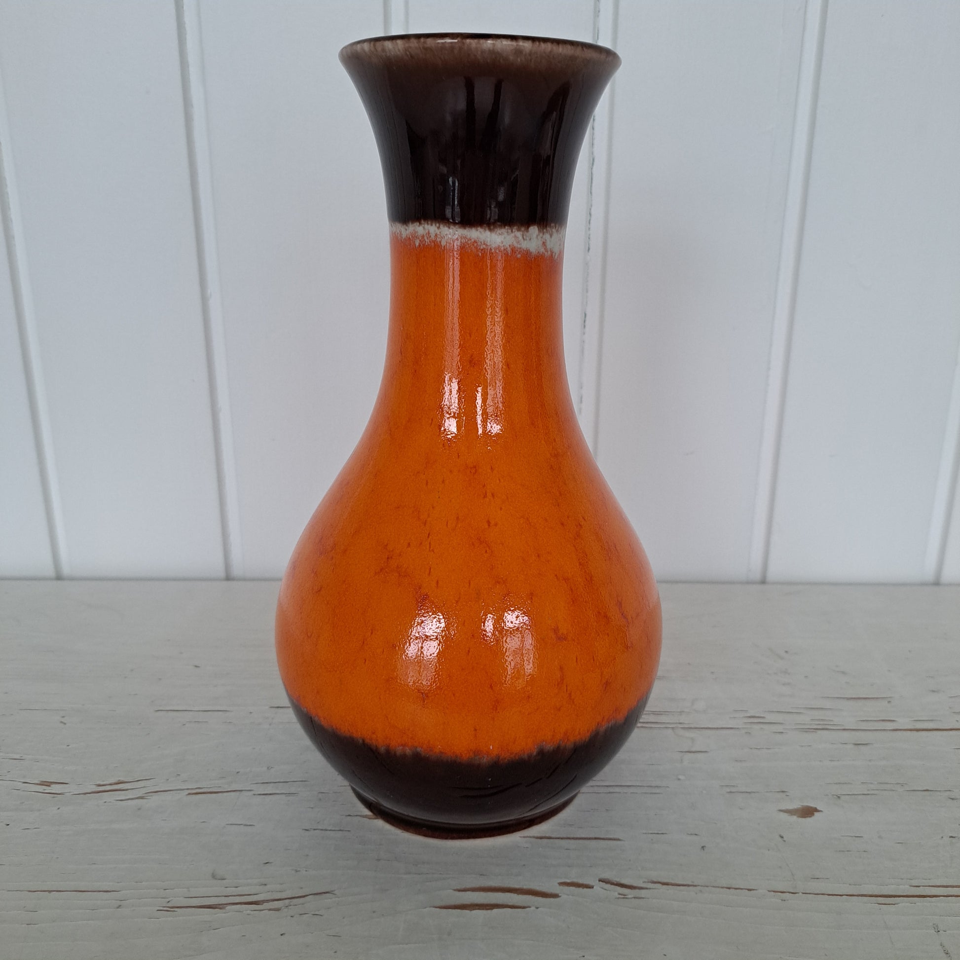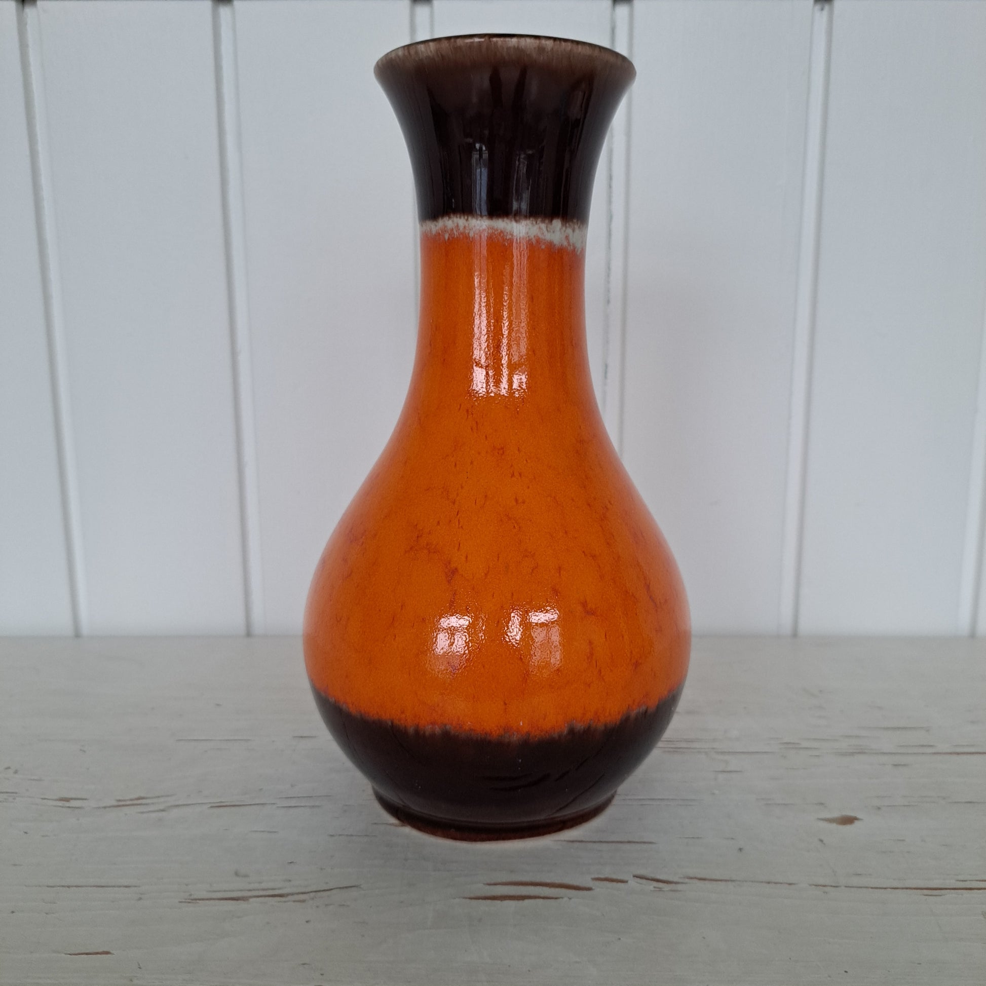 Saksalaisen Jasba Keramikin valmistama ylväs maljakko 1960-luvulta. Maljakon pääväri on pirteä, murrettu oranssi ja tehostevärinä on maljakon ylä- ja alaosaa kiertävä ruskea raita.