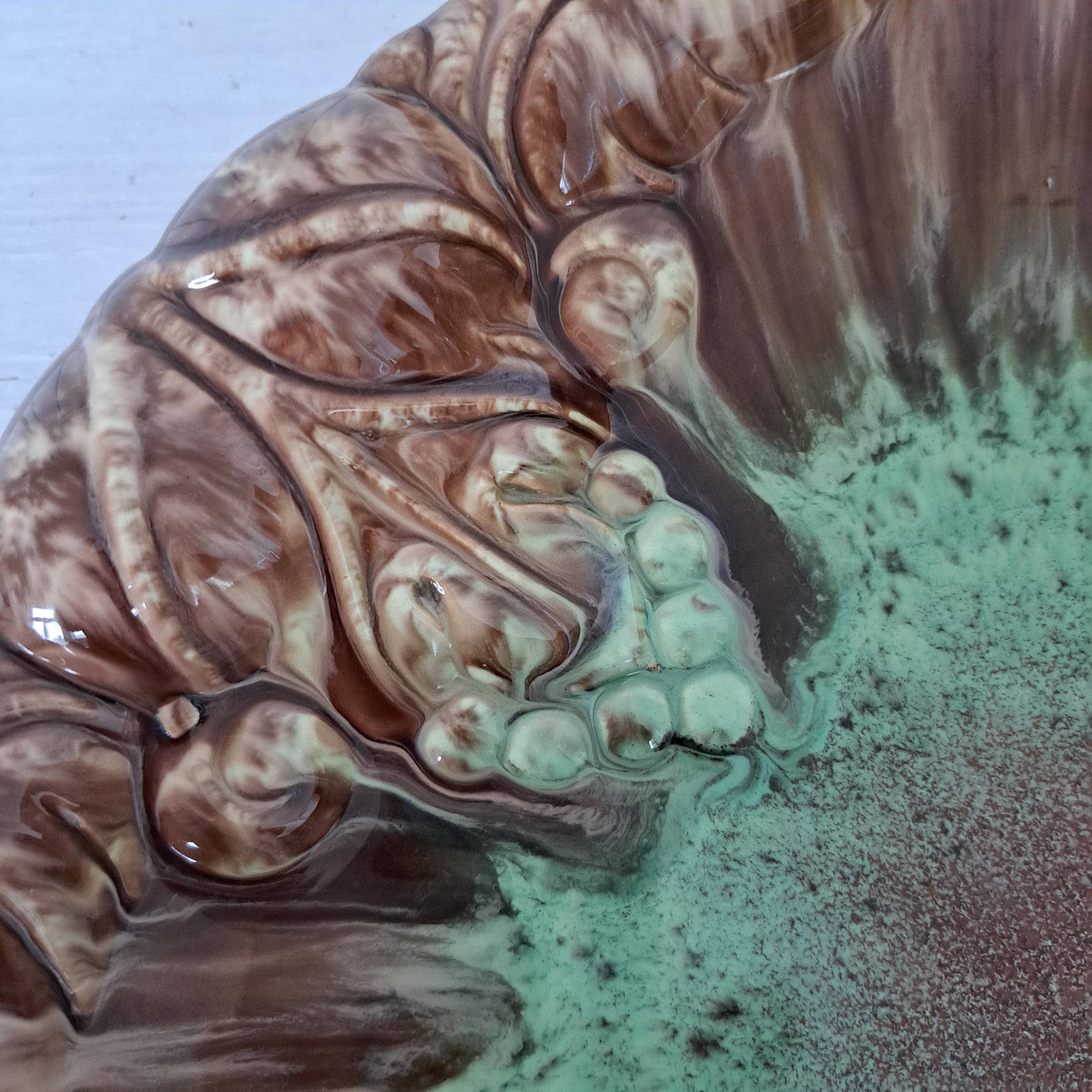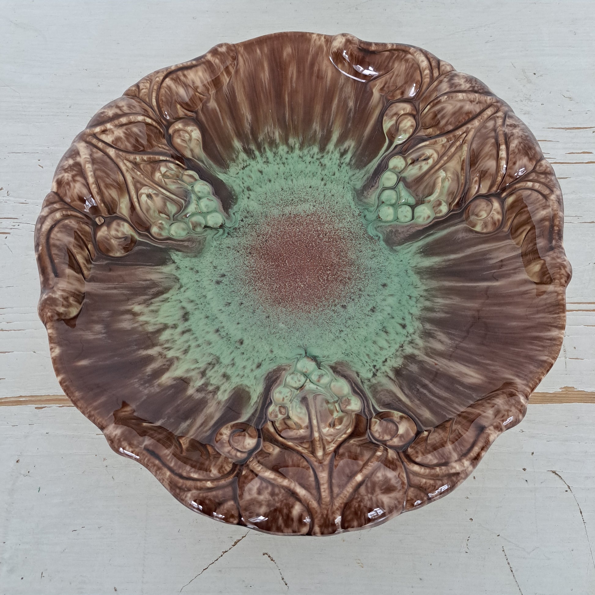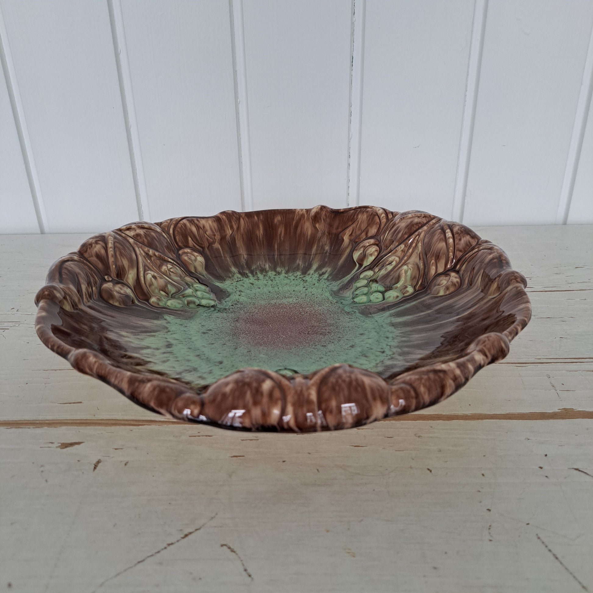 Saksalaisen Jasba Keramikin valmistama upea hedelmäkulho 1960-luvulta. Kulho kauniin eloisan värinen. Siinä on kiiltävä, ruskea lasite, jota koristaa vihreä kermalasite punaisin yksityiskohdin. Kulhon reunoilla on myös koristeelliset viinirypäletertut.
