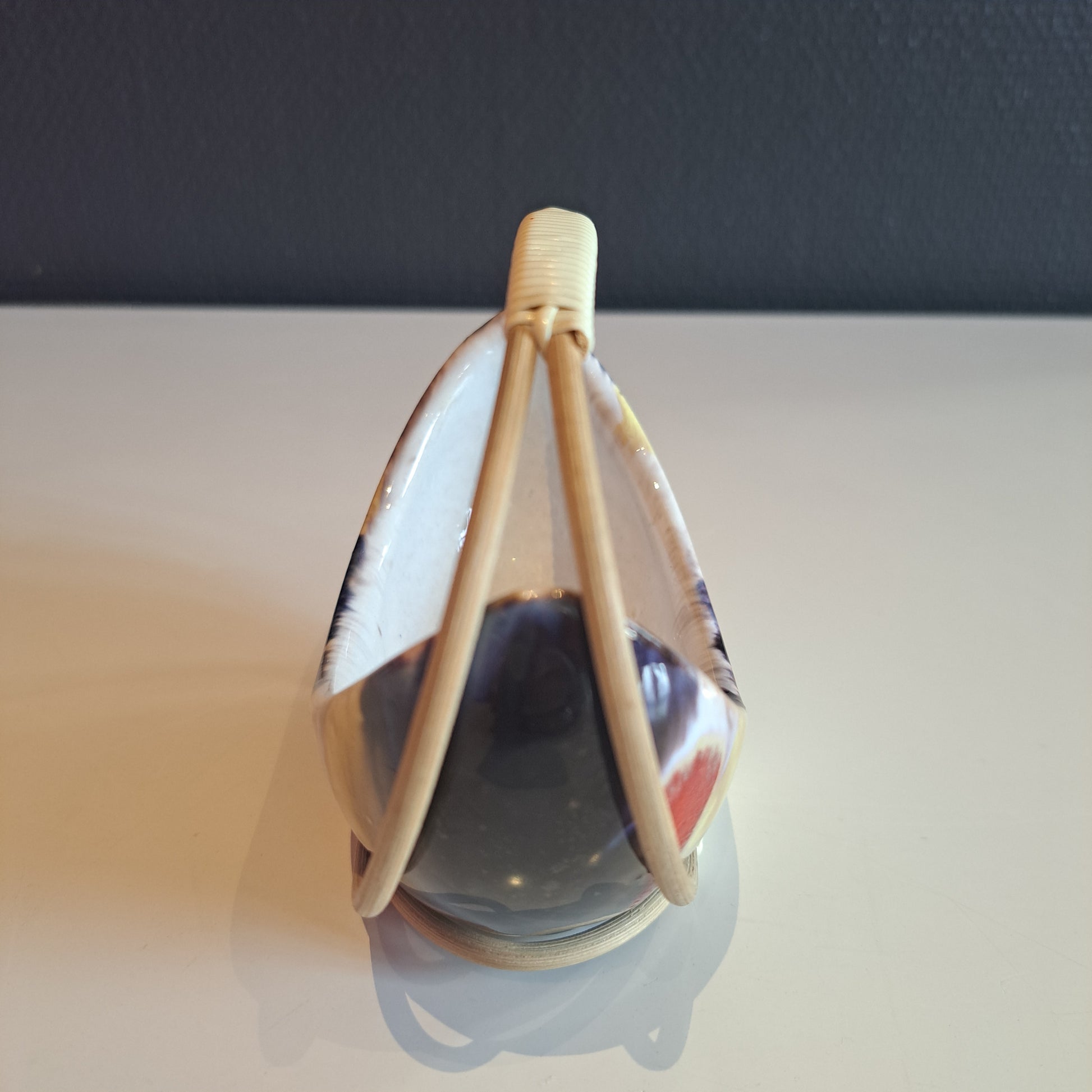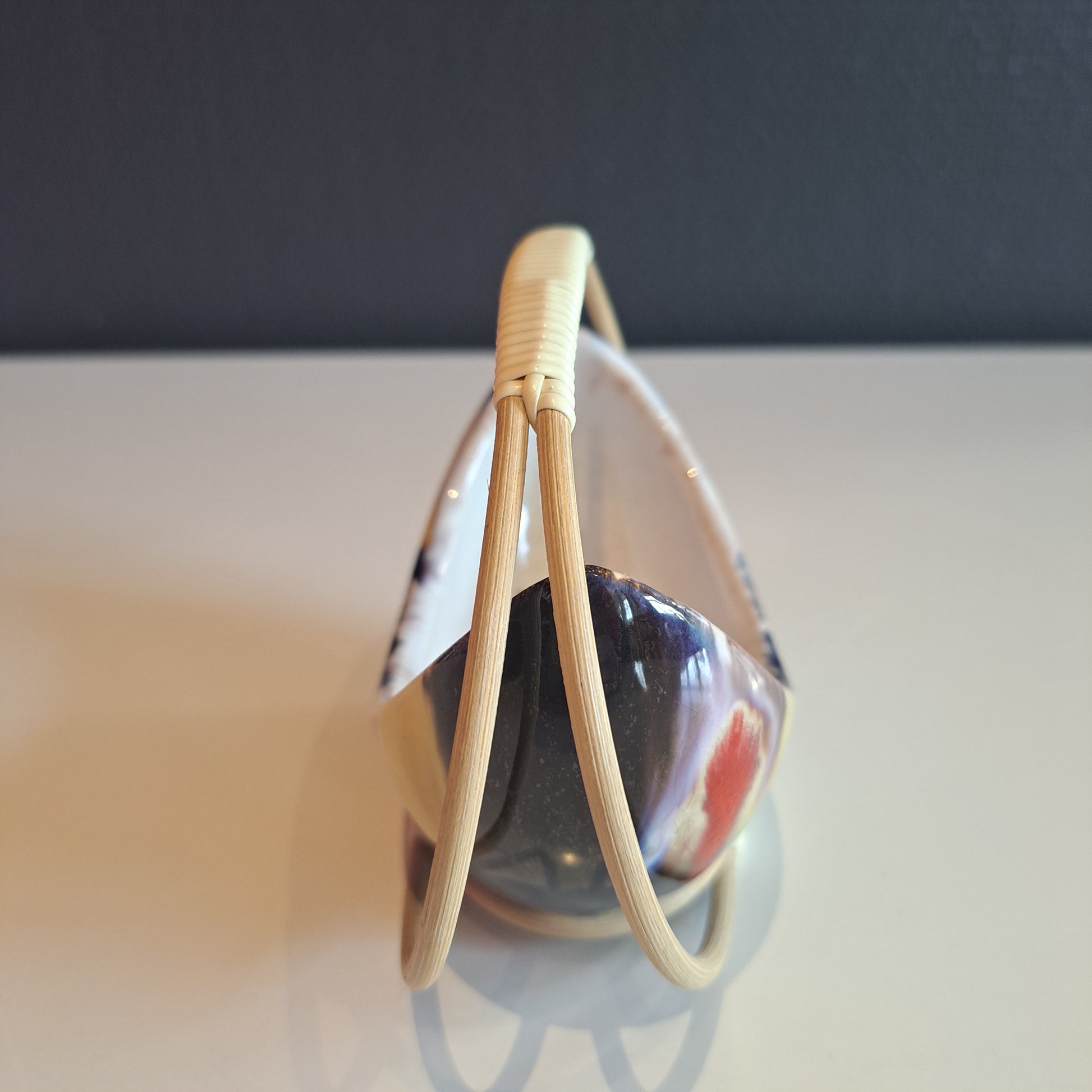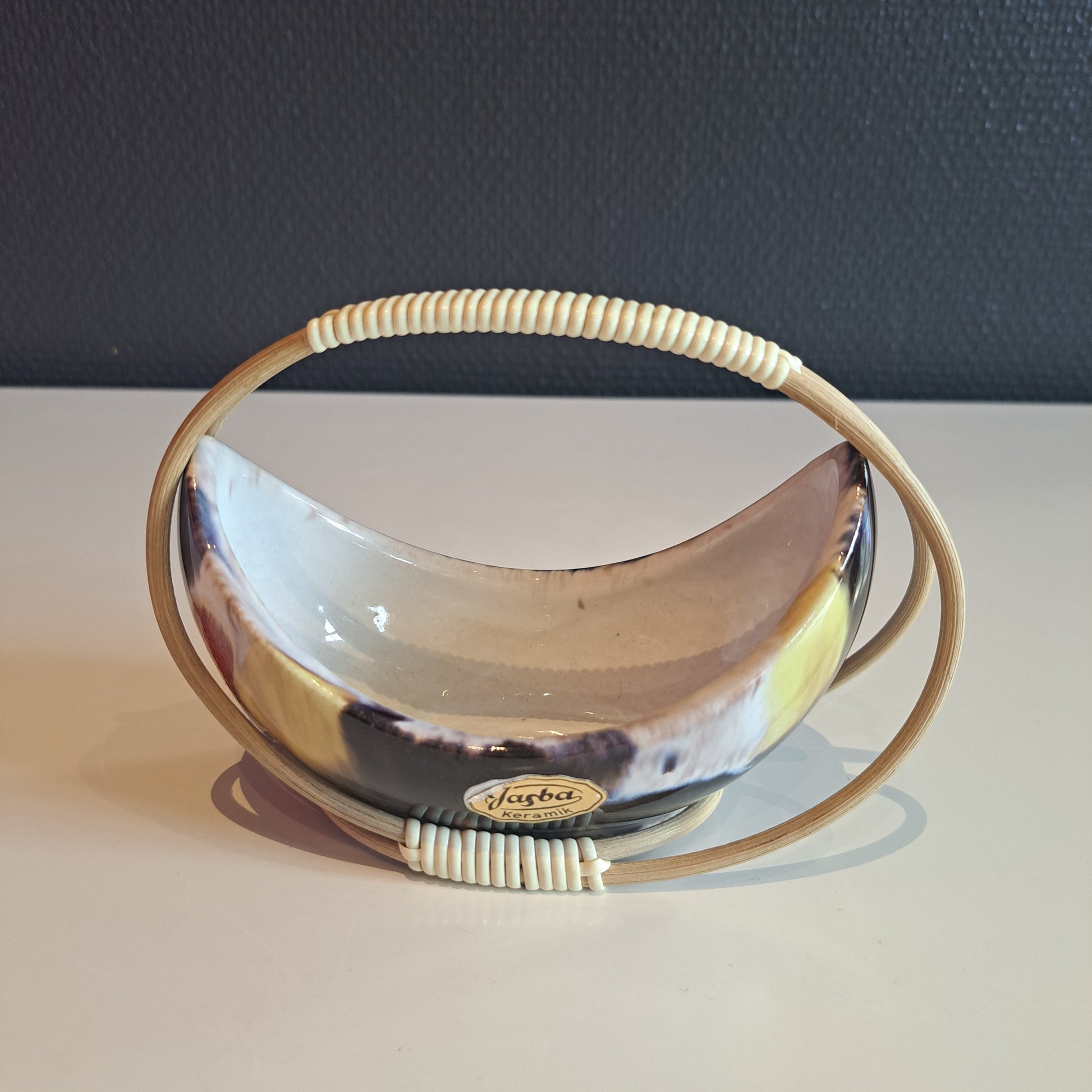 Saksalaisen Jasba Keramikin valmistama viehättävä tarjoilukulho 1950-luvulta. Kulho kauniin eloisan värinen ja siinä on tarjoilua helpottava kantokahva. Mainio, pieni kulho esim. pähkinä- tai karkkikulhoksi! Valmistajan tarra on jäljellä.