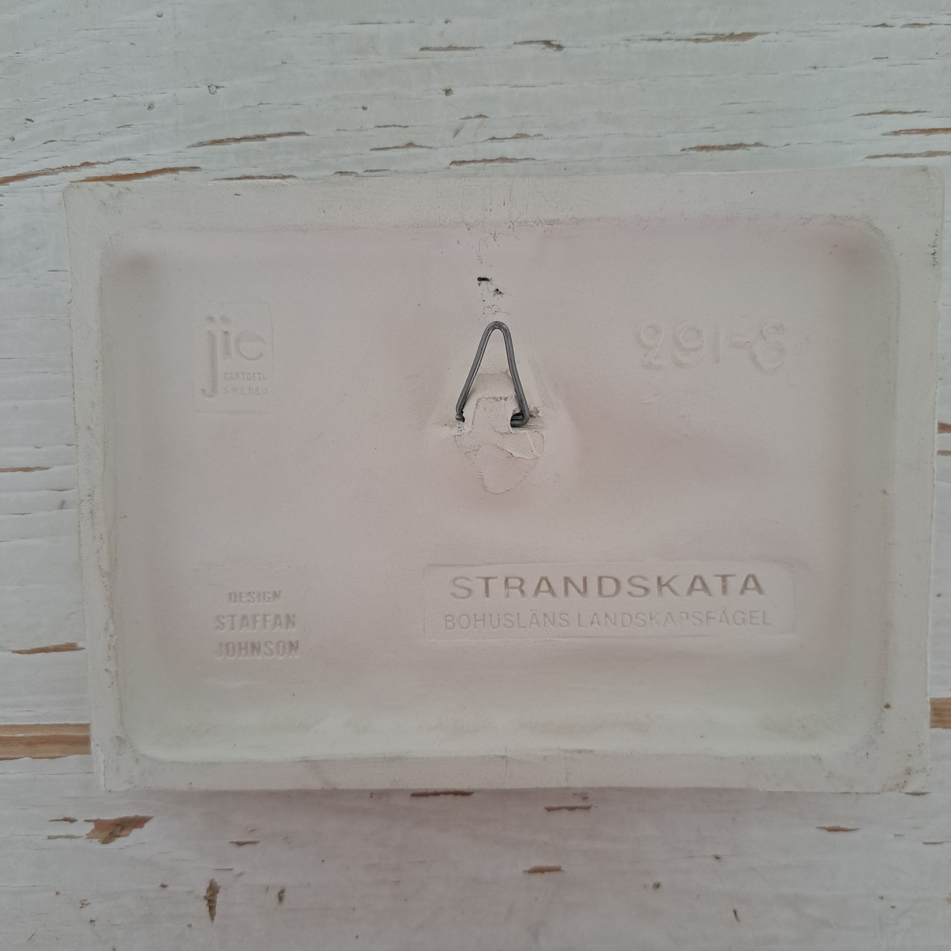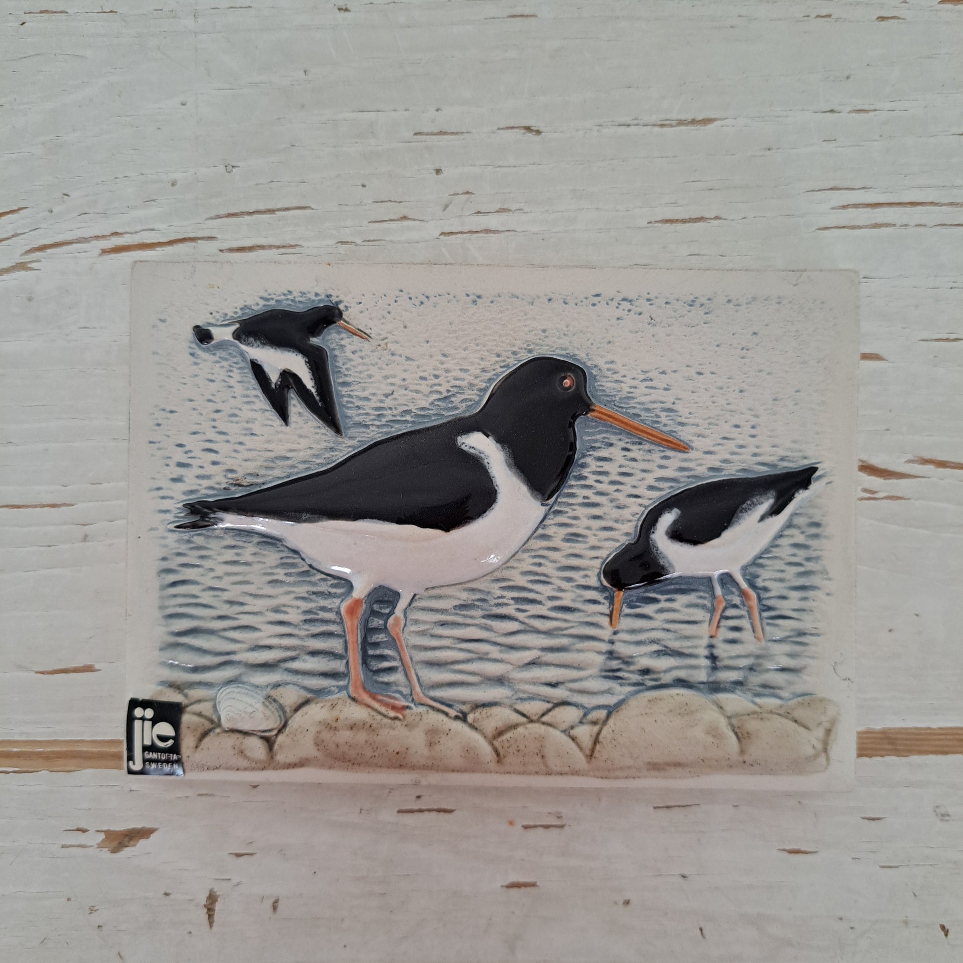 Ruotsalaisen Jie Gantoftan valmistama ja Staffan Johnsonin suunnittelema kaunis ja merihenkinen lintutaulu "Meriharakka", (Stranskata). Ihastuttava keramiikka traulu 1970-luvulta !