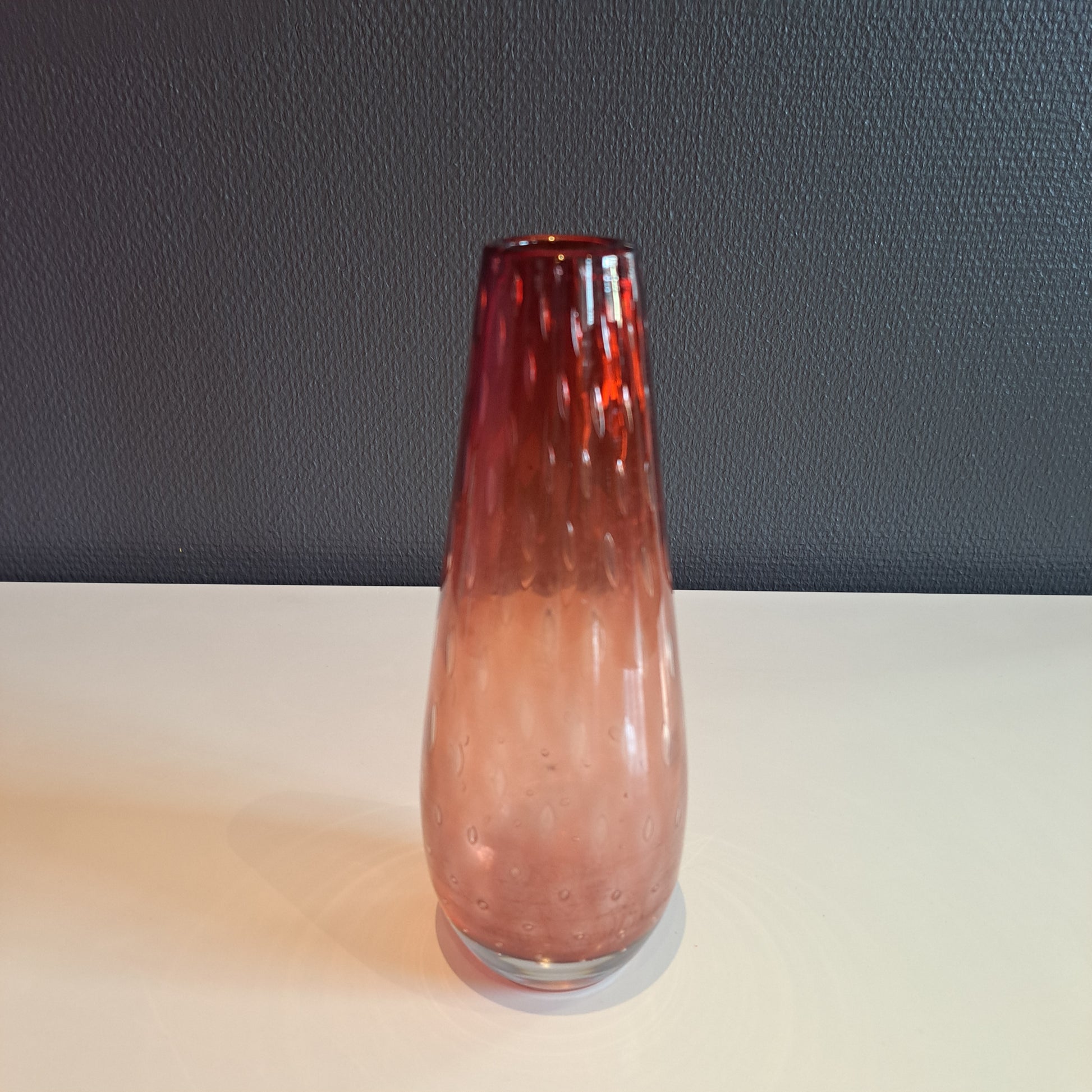 Ruotsalaisen Johanfsors Glassin valmistama upea lasimaljakko! Maljakko on rubiininpunainen ja se on puhallettu kuplamaljakko, todennäköisesti 1970-luvulta.S