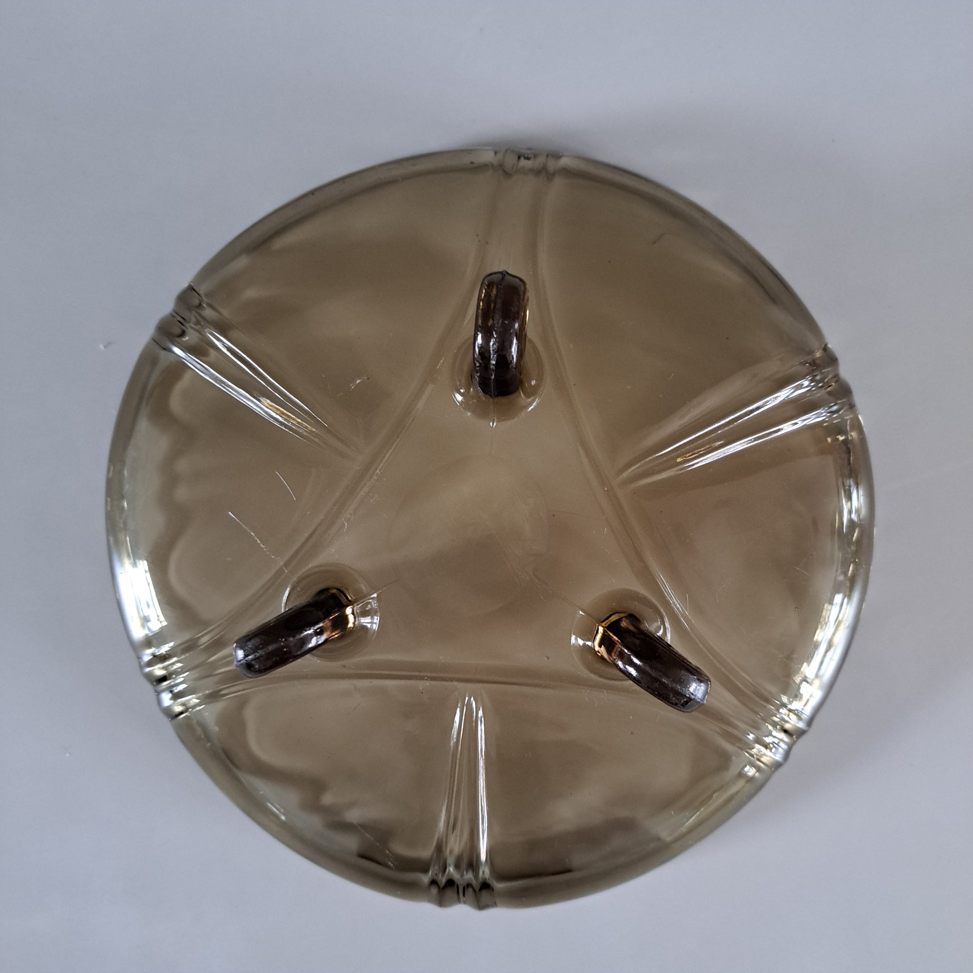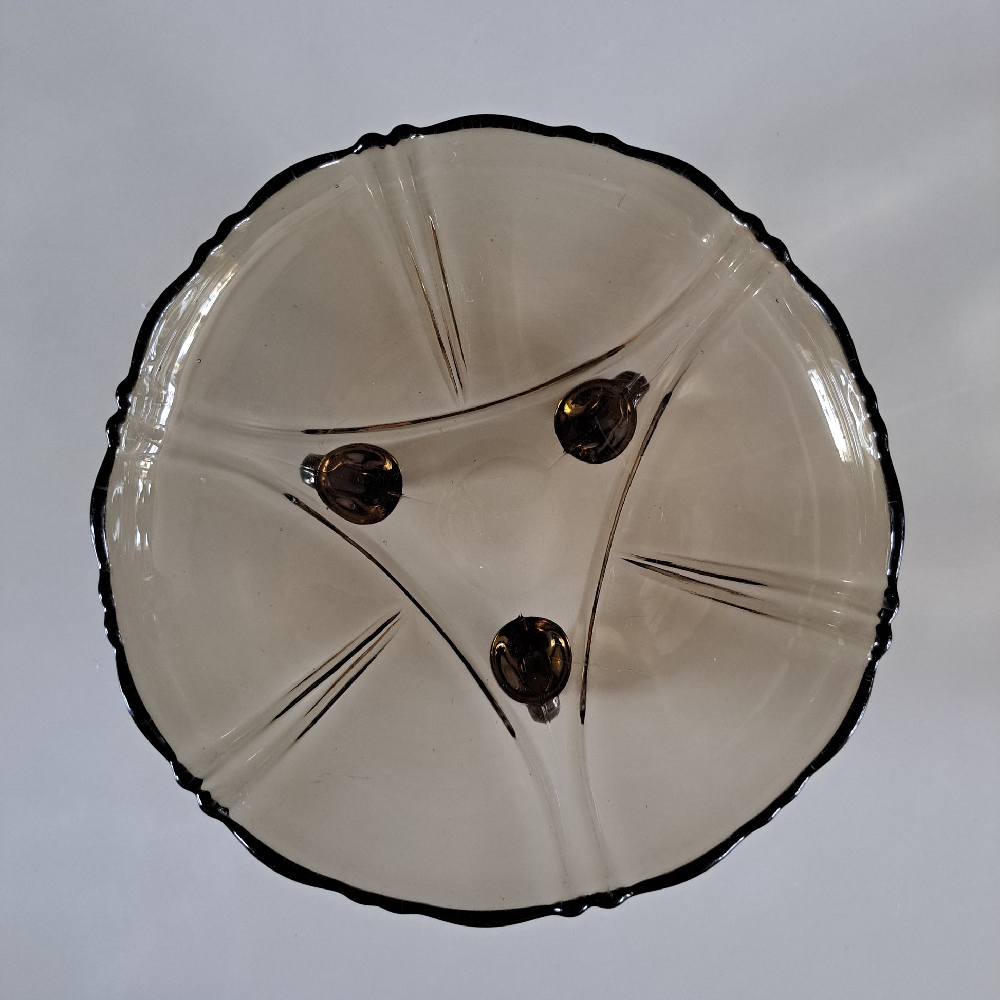 Karhulan Lasin 1930-luvulla valmistama klassisen kaunis, kolmijalkainen tarjoiluastia. Astiassa on upeasti muotoillut jalat ja reunoissa toistuvat herkät laineet. Ihastuttavan savunvihreä/-harmaan sävyinen.