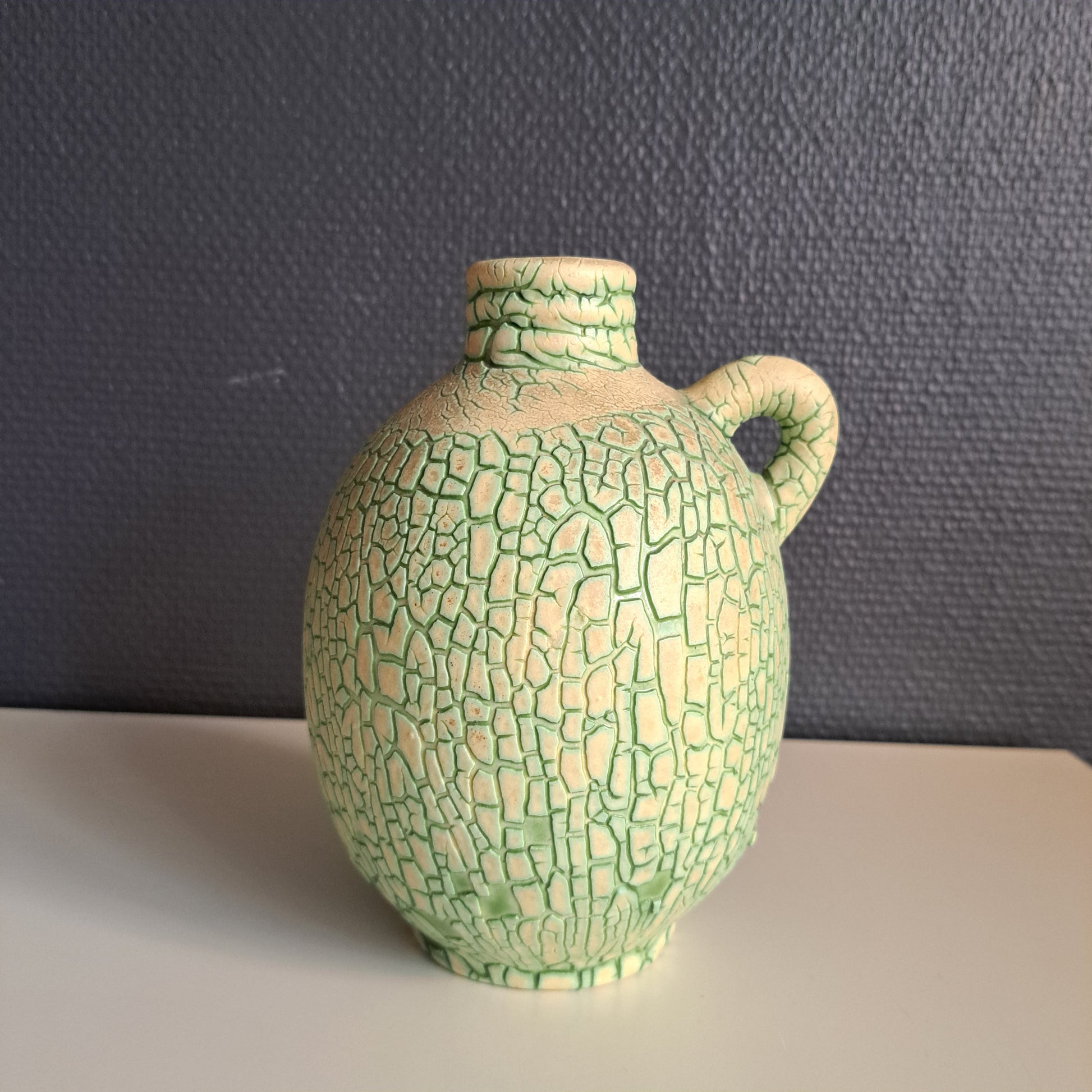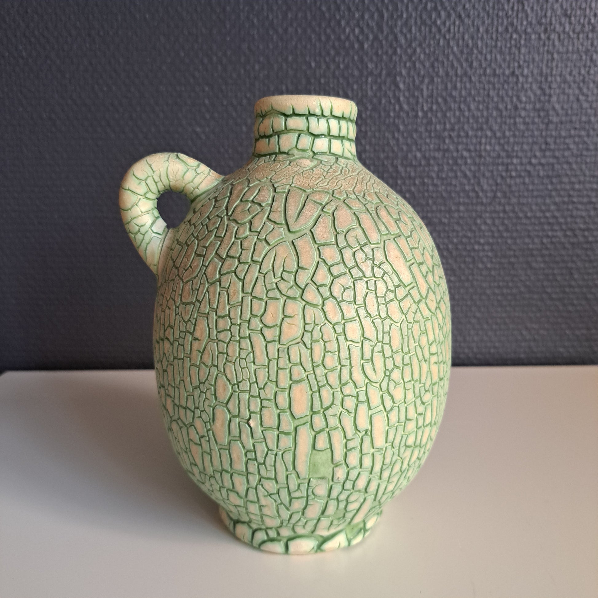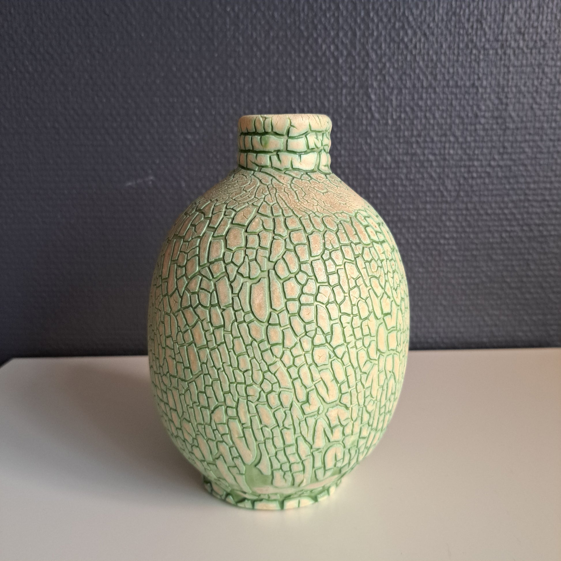 Keran poikkeuksellinen keramiikka maljakko! Maljakon pinta muistuttaan käärmeen nahkaa tai suomuja ja se on värykseltään utuisen vihreä. Suunnittelijana todennäköisesti Terttu Salonen.