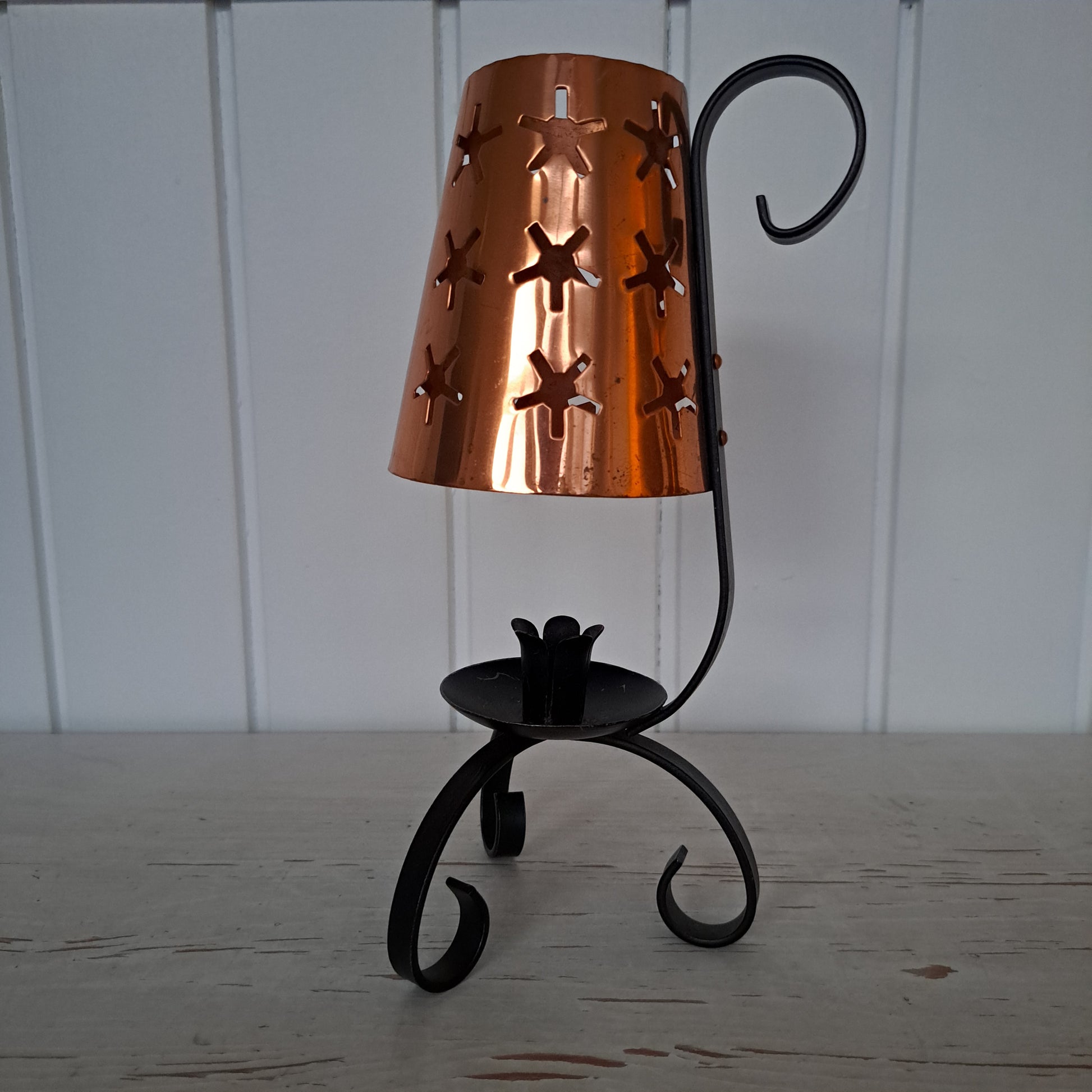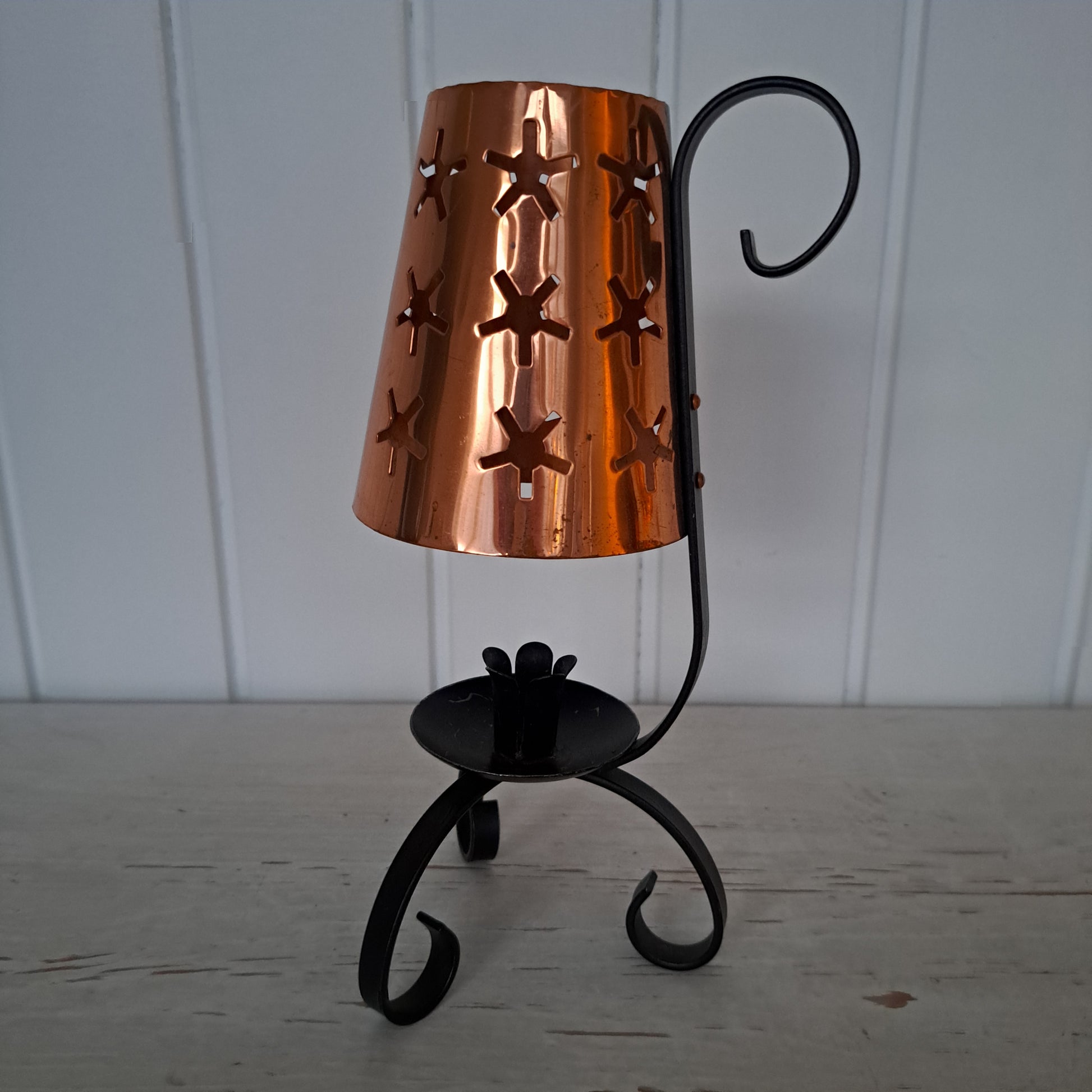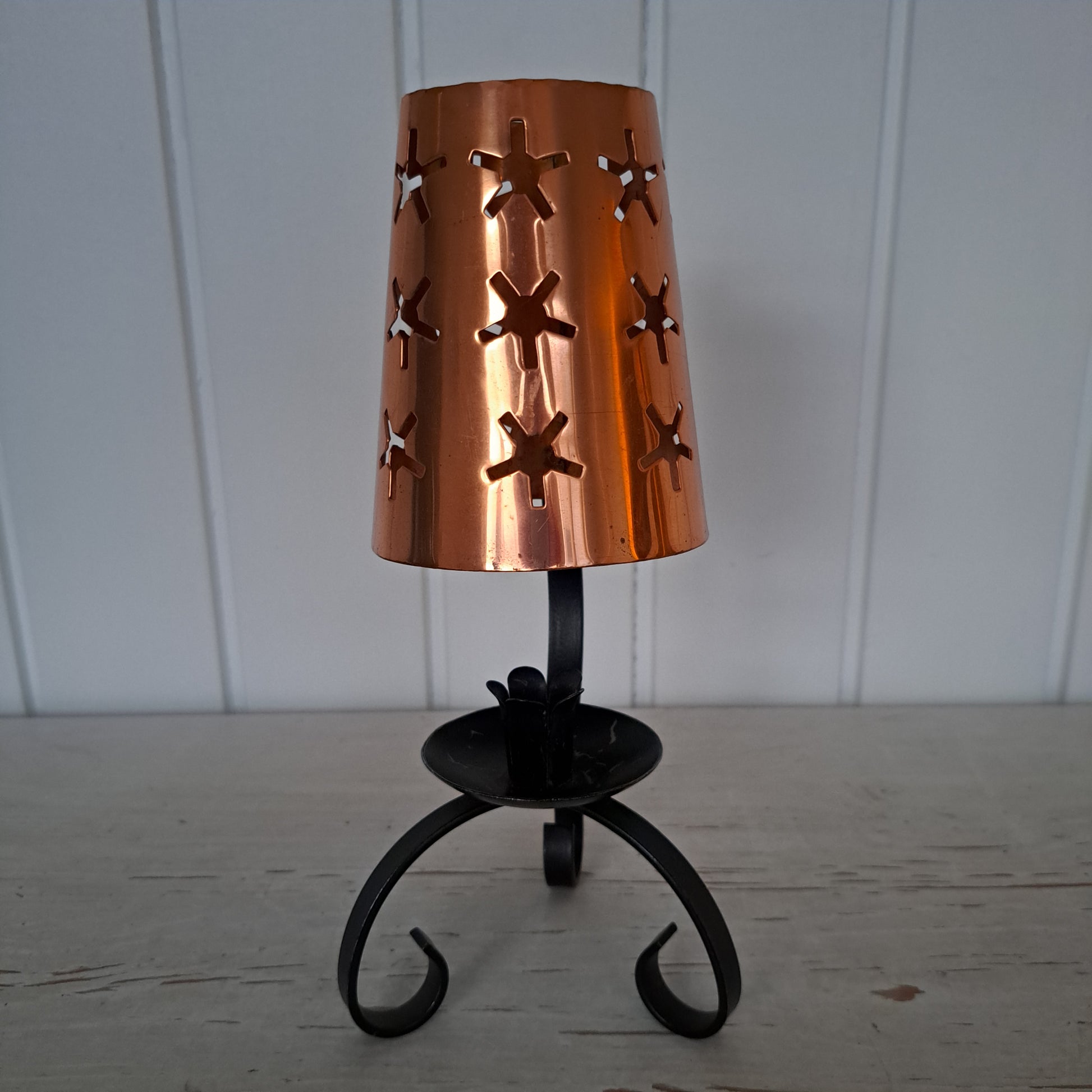 Ihana, 1960-luvun, metallinen kynttilänjalka, jossa on reikäkuvioitu, kuparinen lyhtyosa.