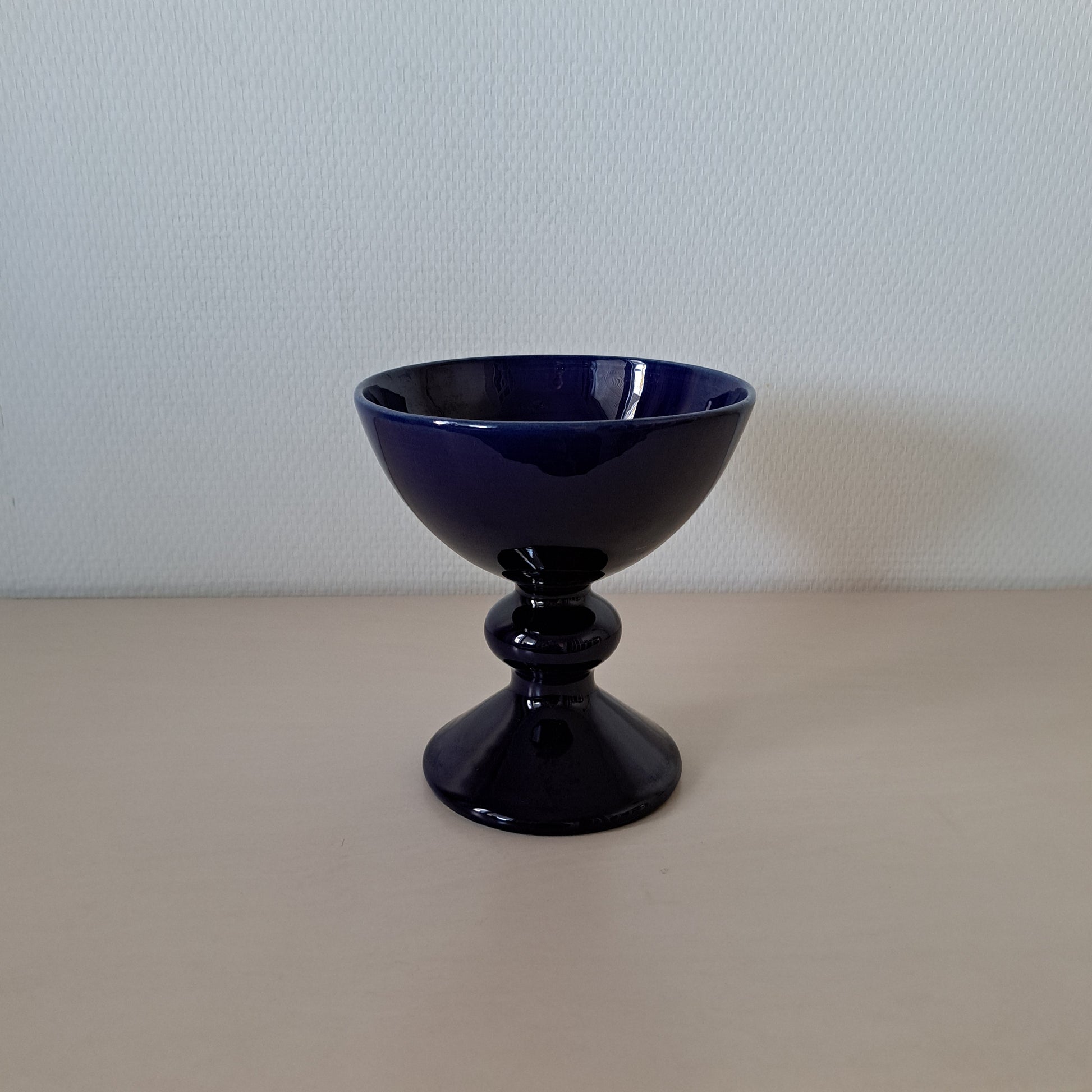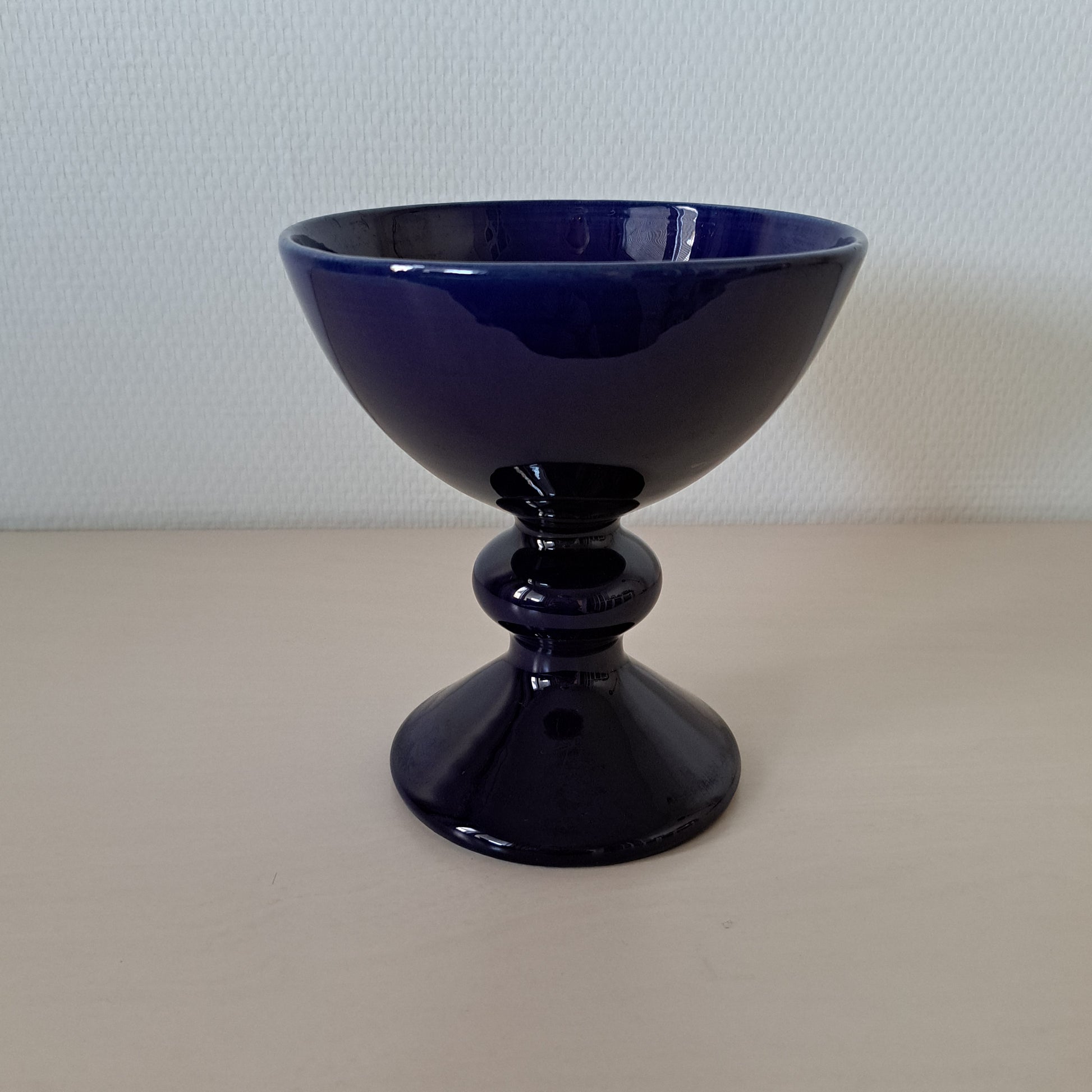Kupittaan saven kaunis jalallinen tarjoilukulho. Kulho on väriltään syvän tummansininen.elvästi