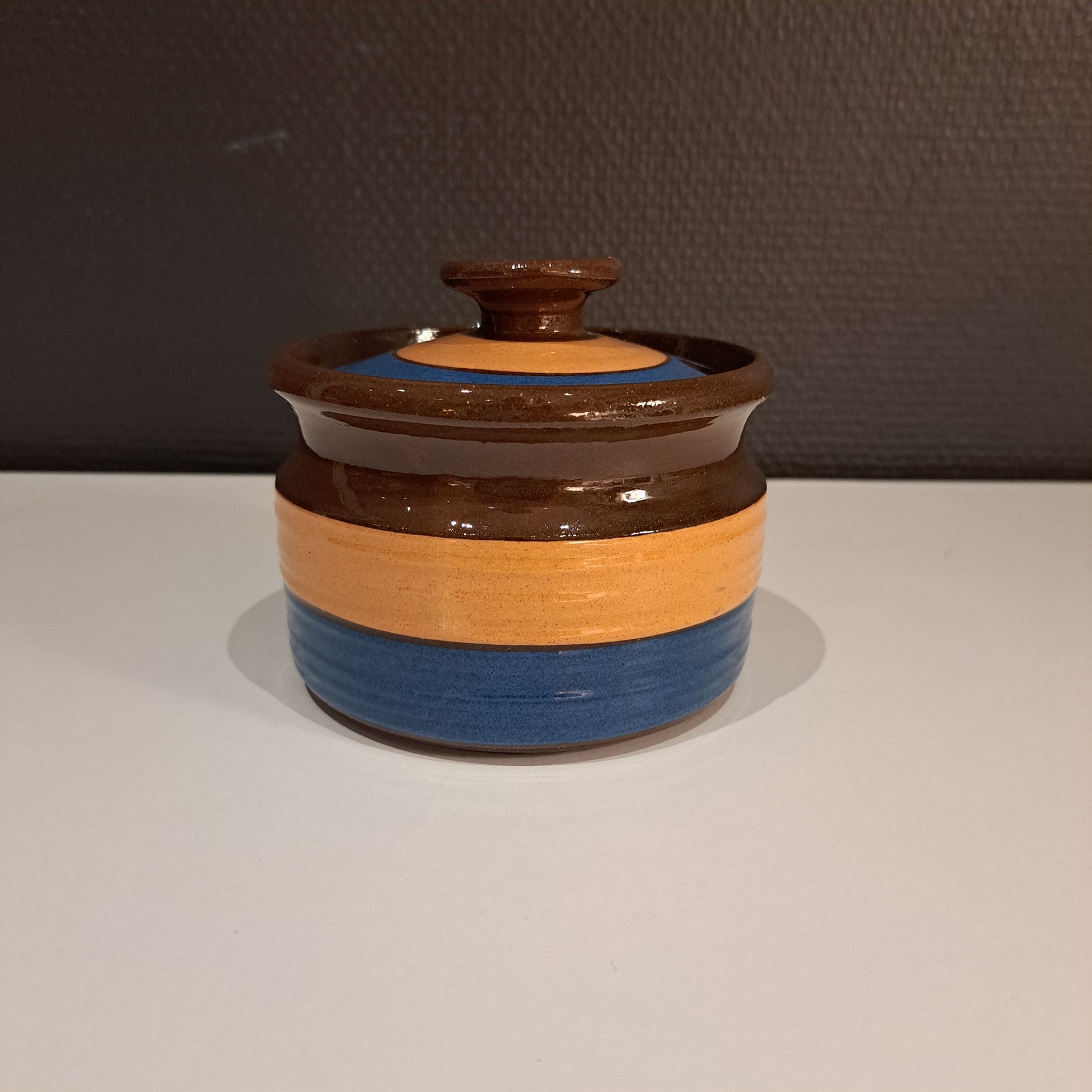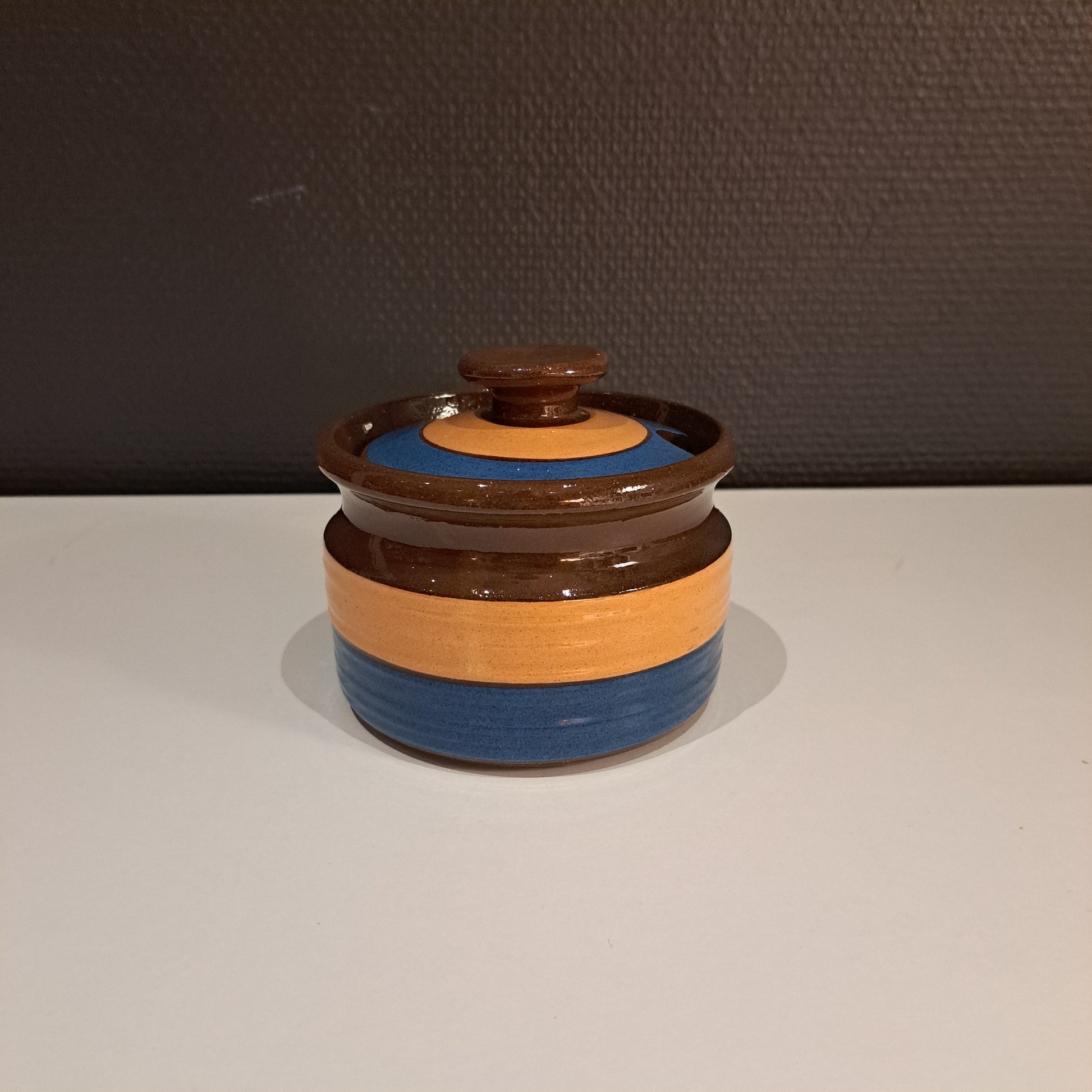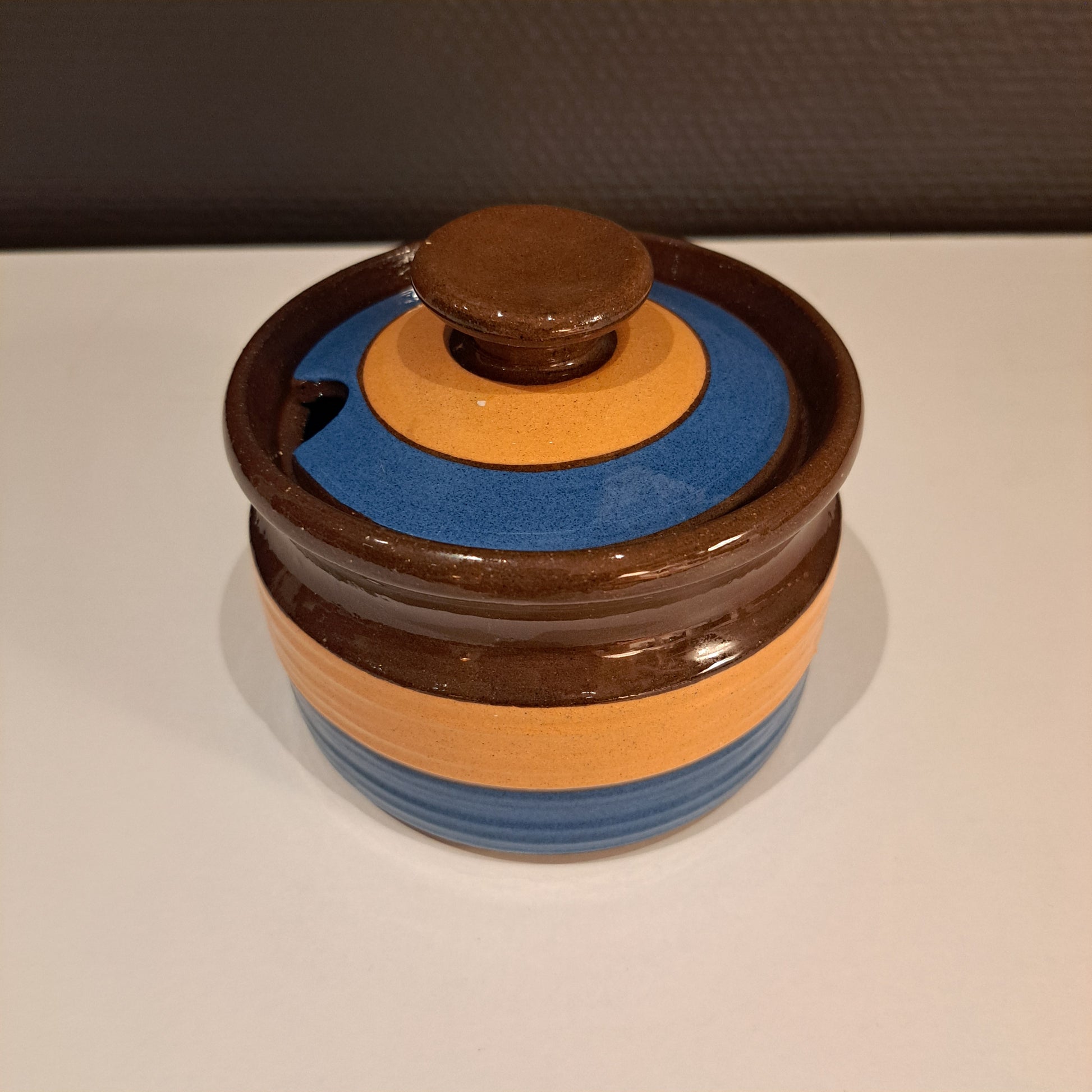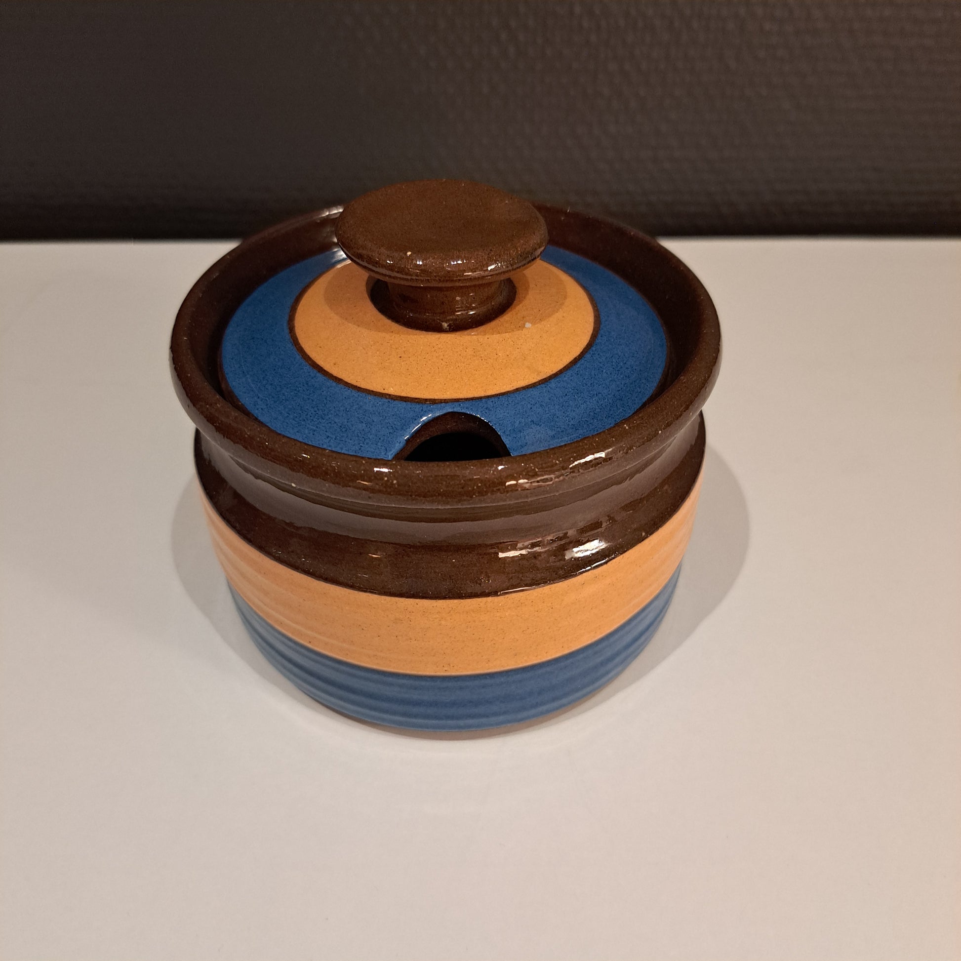 Kupittaan saven kaunis, kannellinen purnukka, jonka on suunnitellut Orvokki, "Okki" Laine. Kulhon värimaailma on muodikas sininen-oranssi-ruskea!