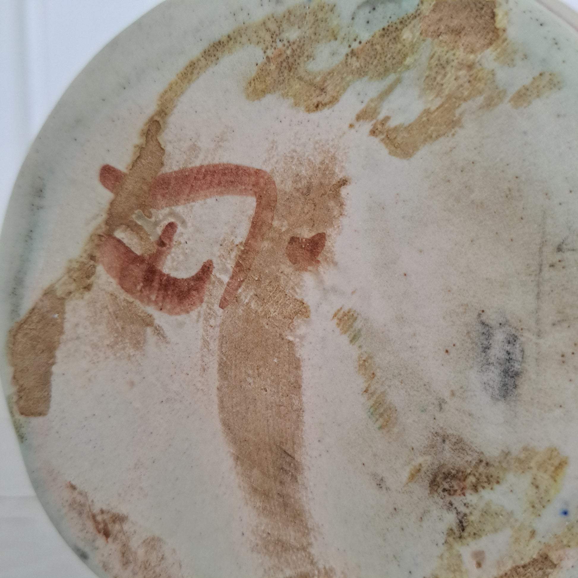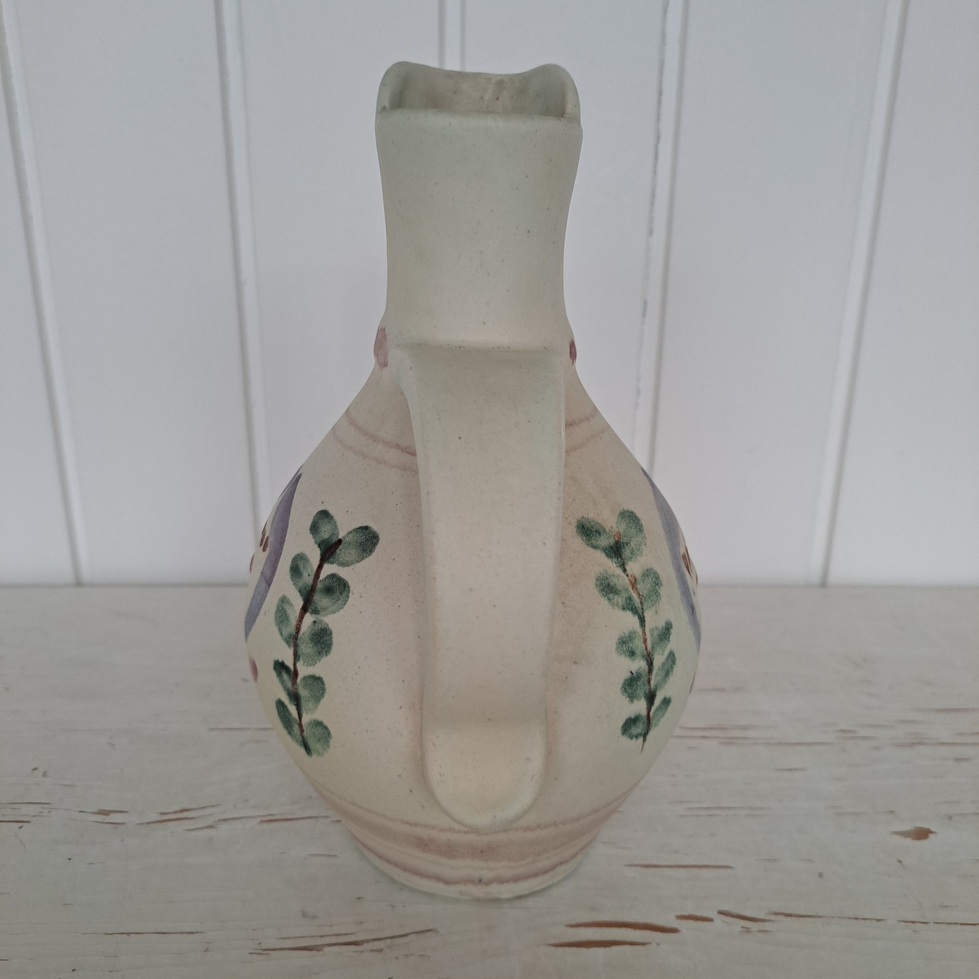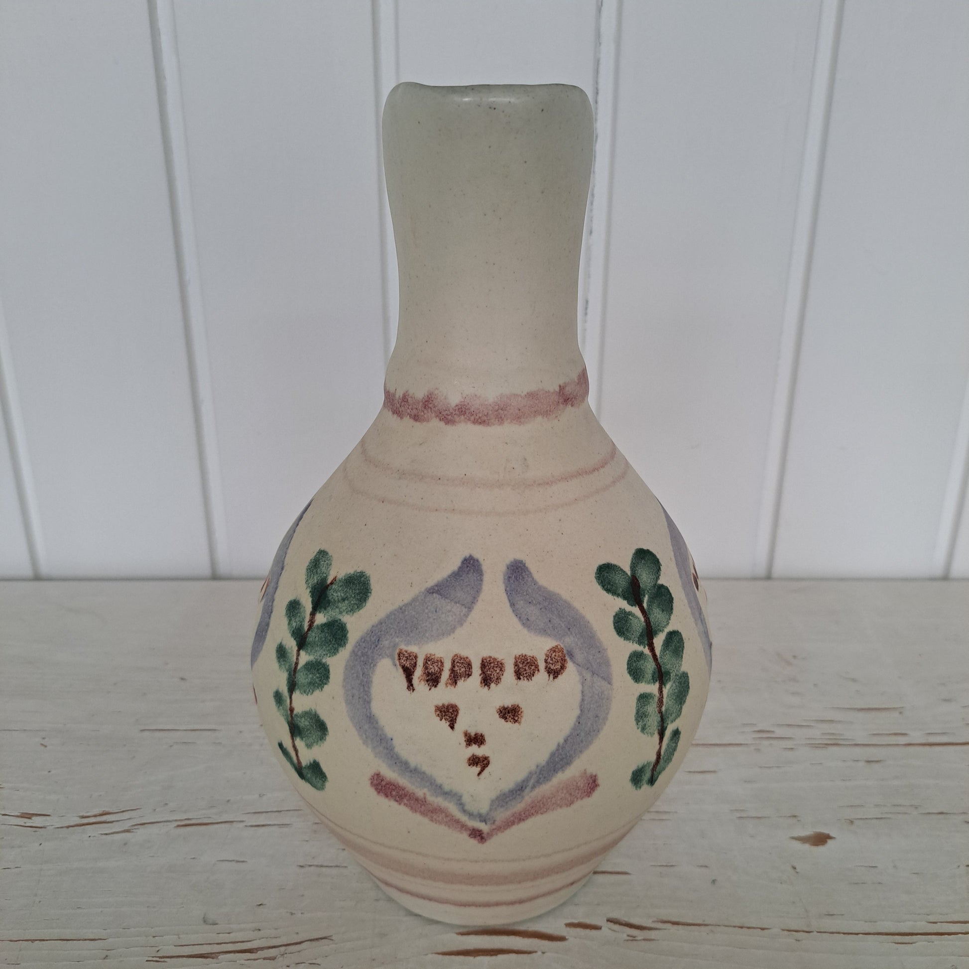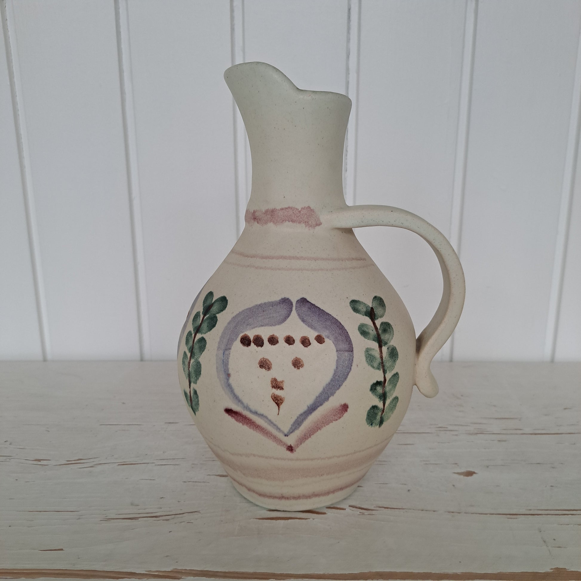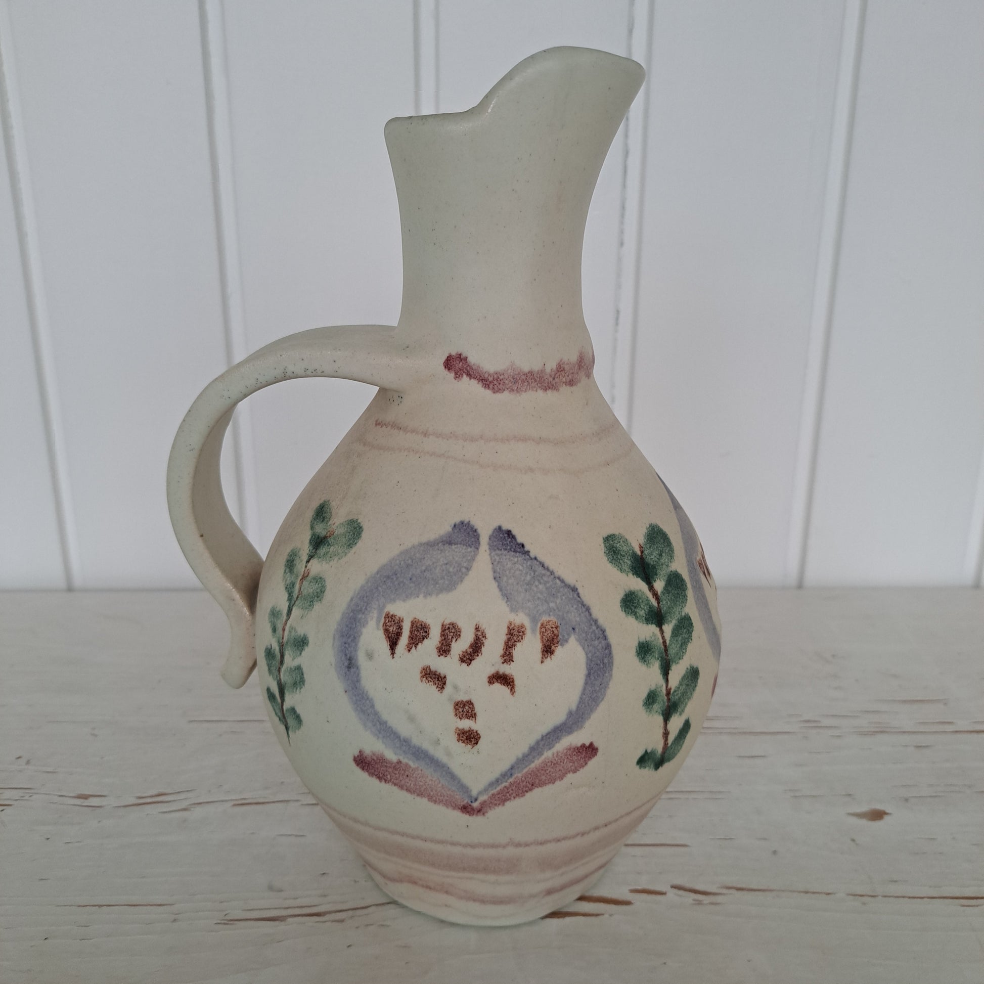 Kupittaan saven kaunis, vaalea kannu, jossa on pastellinsävyiset kuviot.