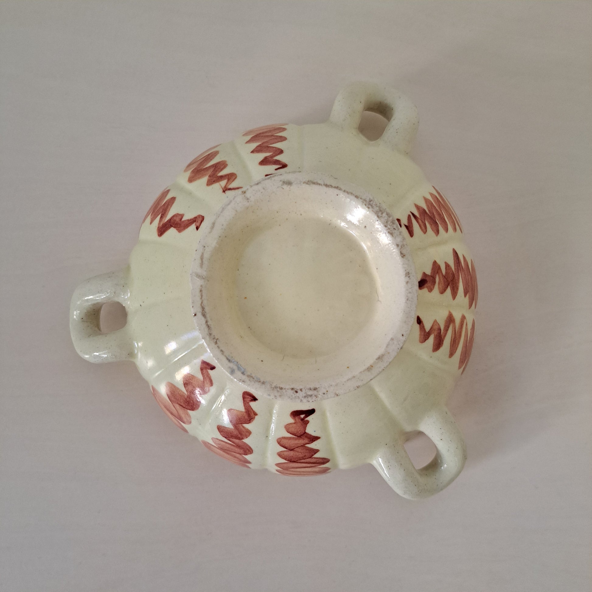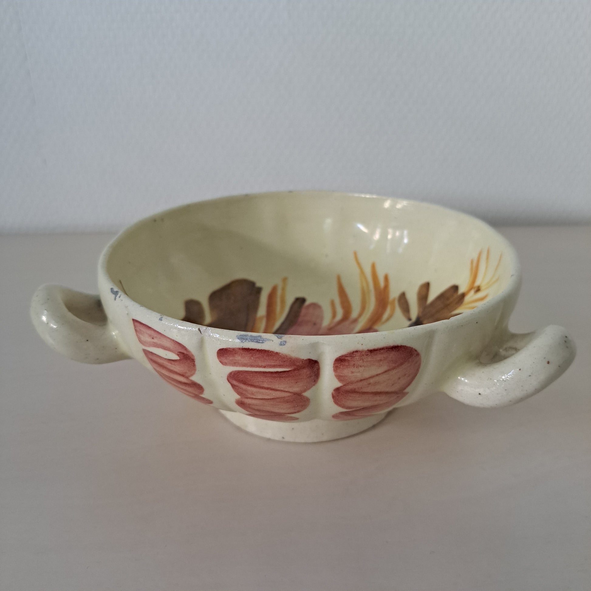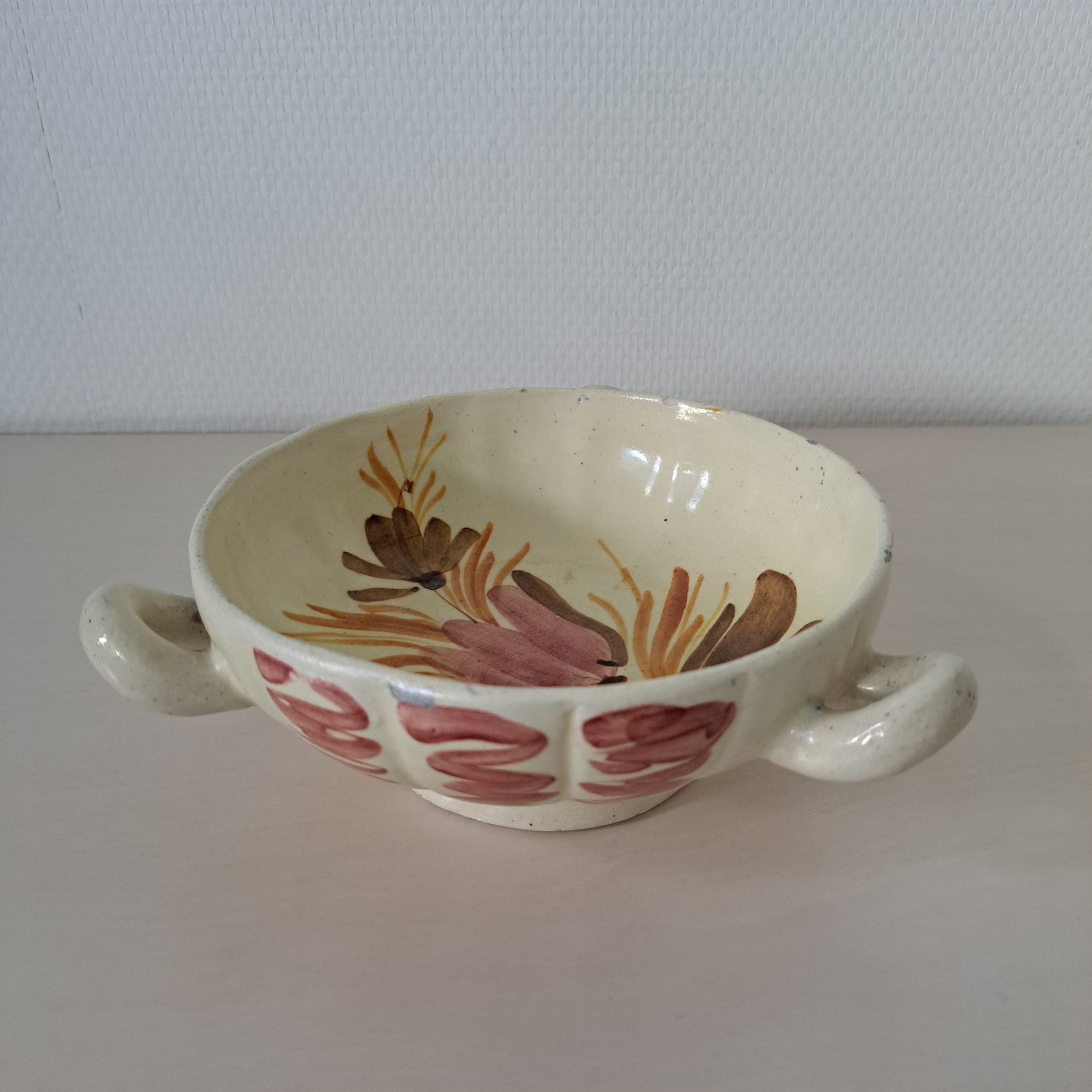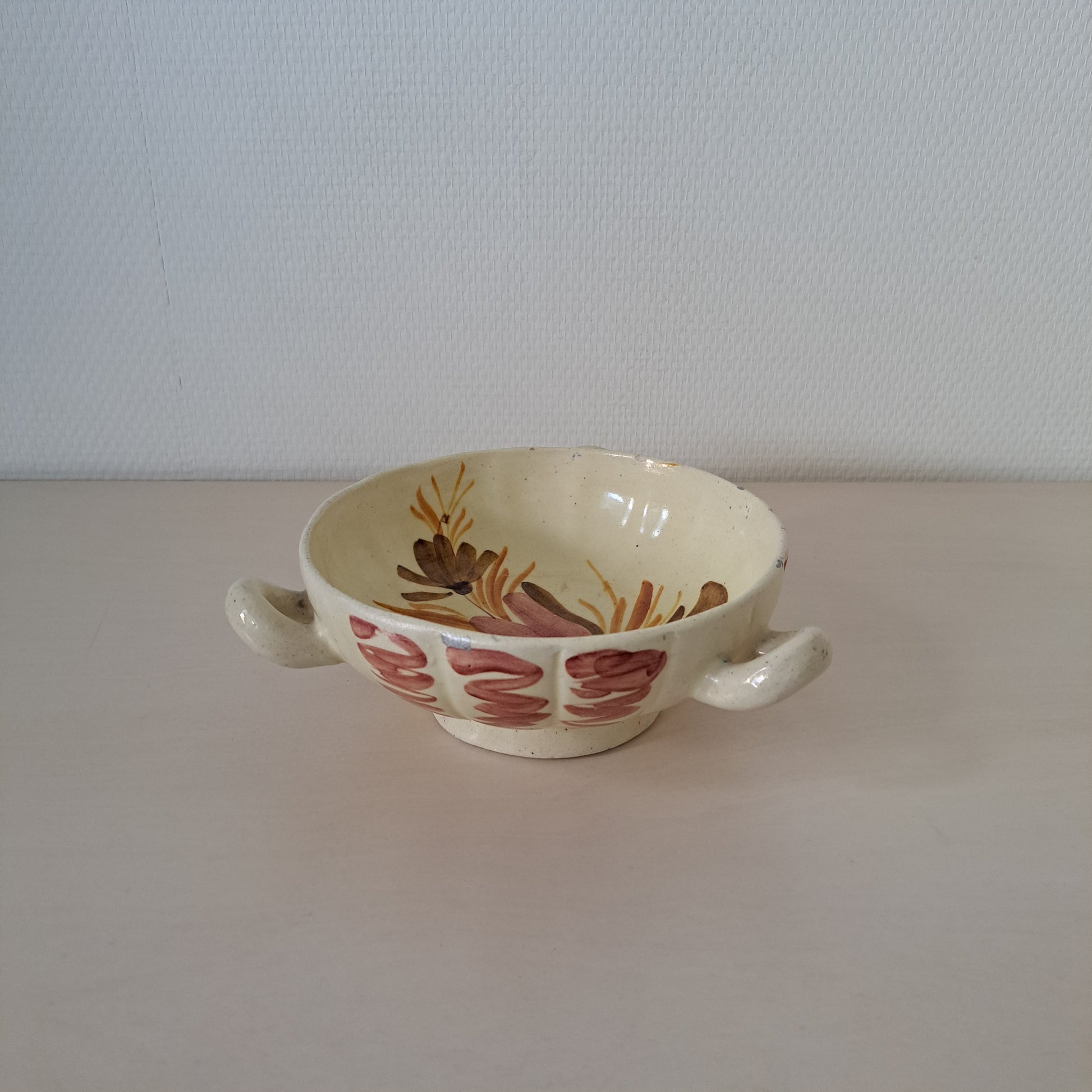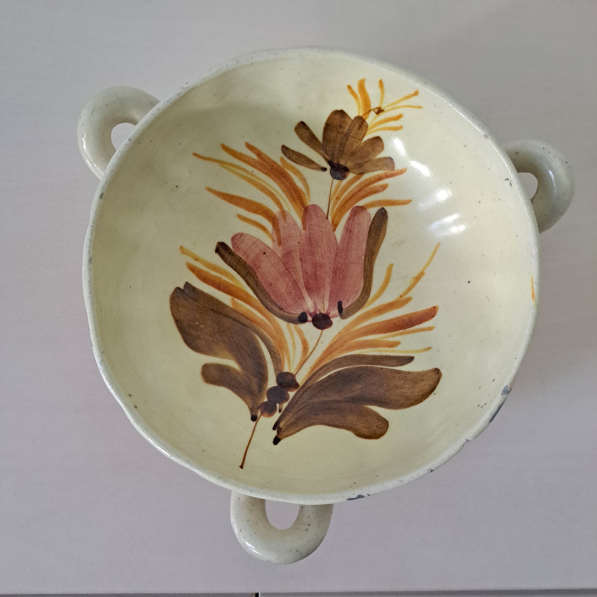 Kupittaan saven raikkaan sävyinen, vaalea kulho/tarjoiluastia, jossa on kolme "korvaa". Kulhon pohjavärinä vaalean keltainen ja käsinmaalatut kukkakuviot koristavat kulhoa.