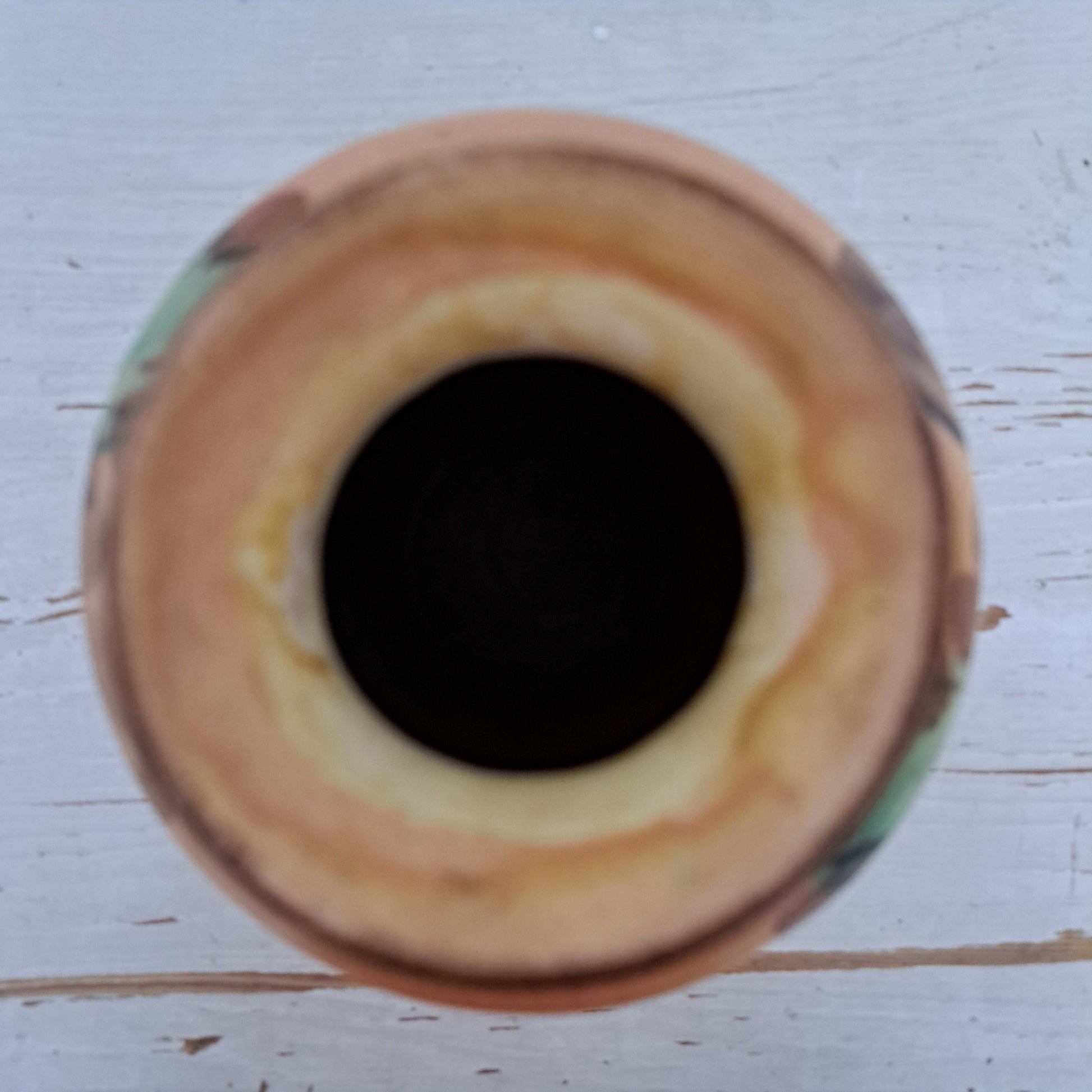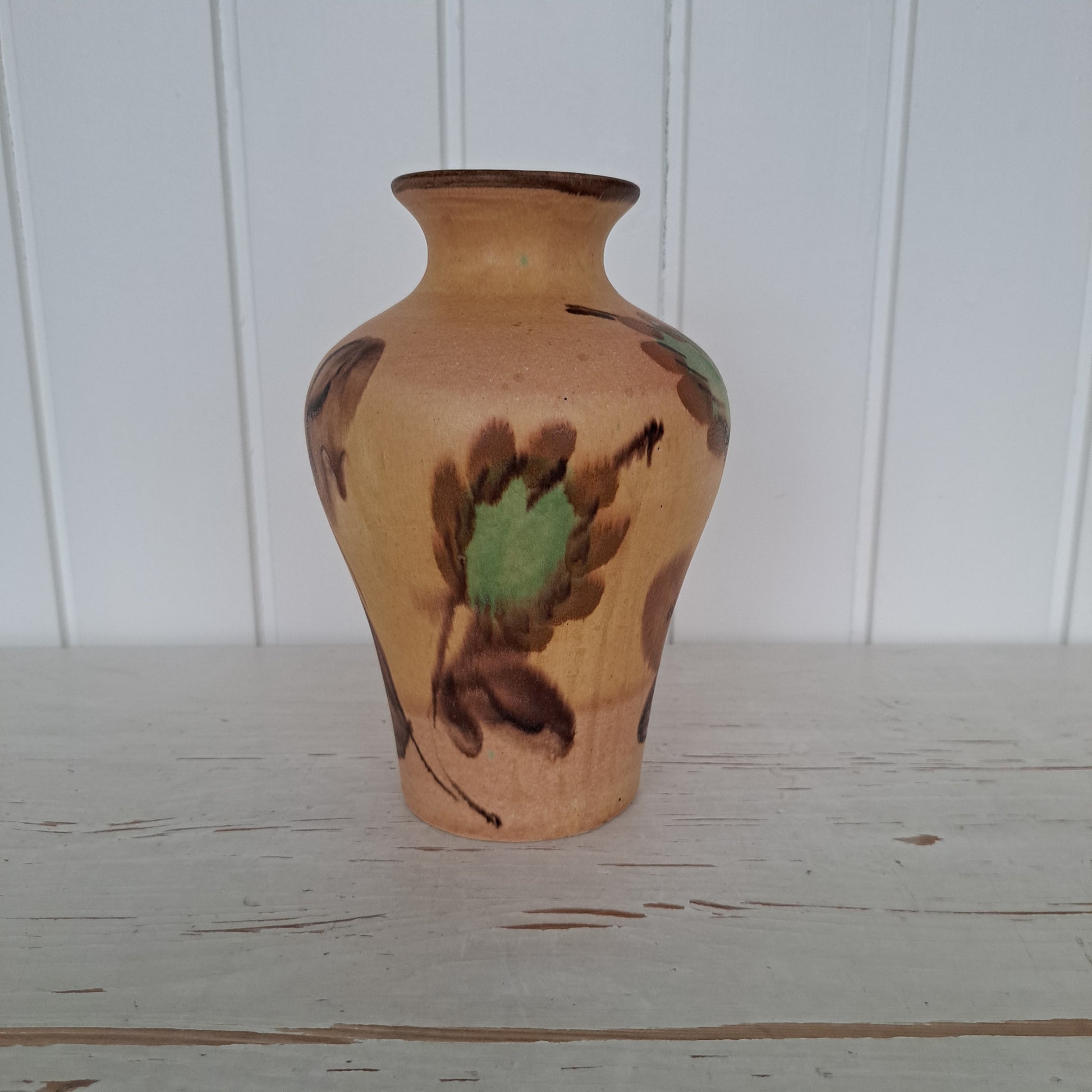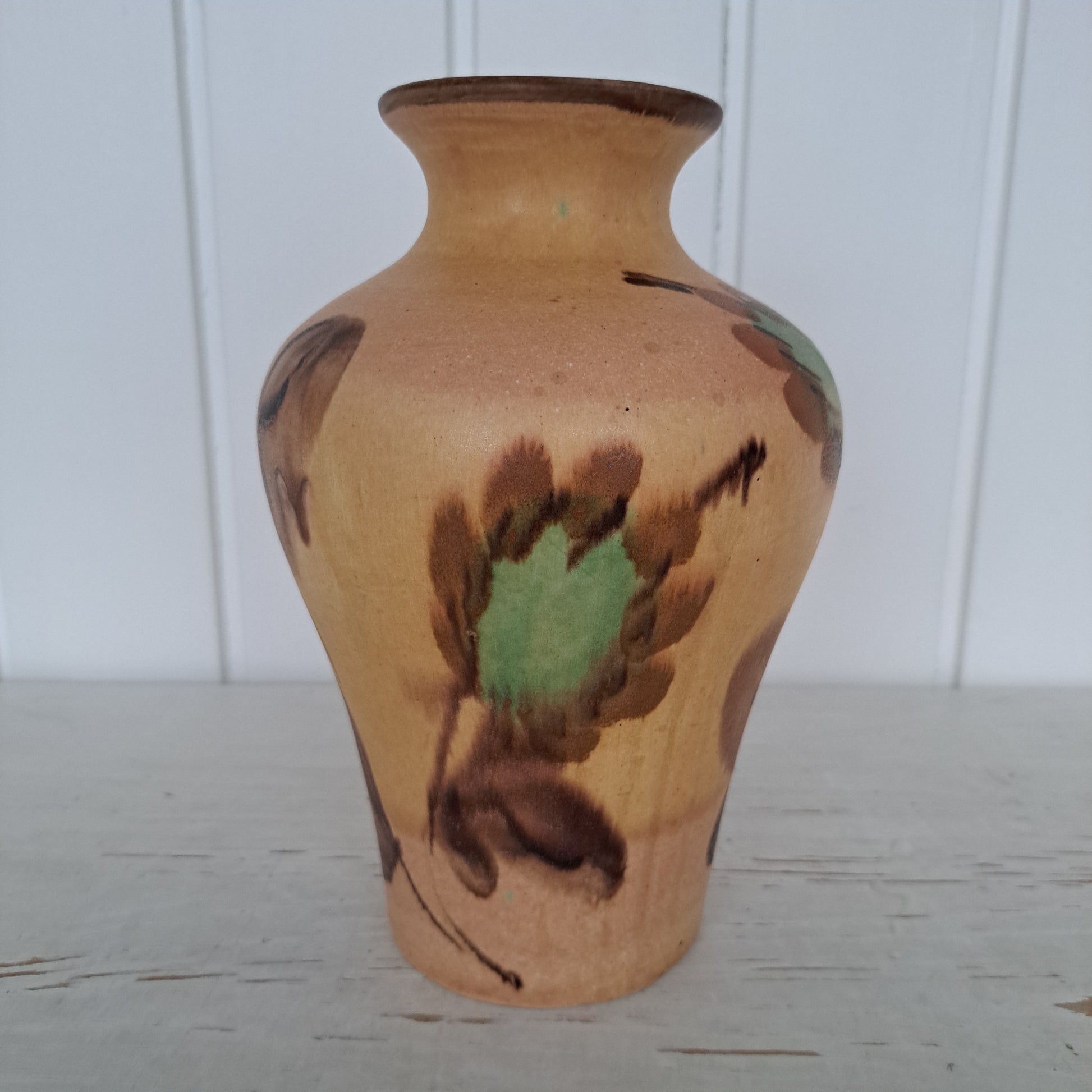 Kupittaan saven rusehtavan sävyinen, jossa on vihertävät kukkakuviot.