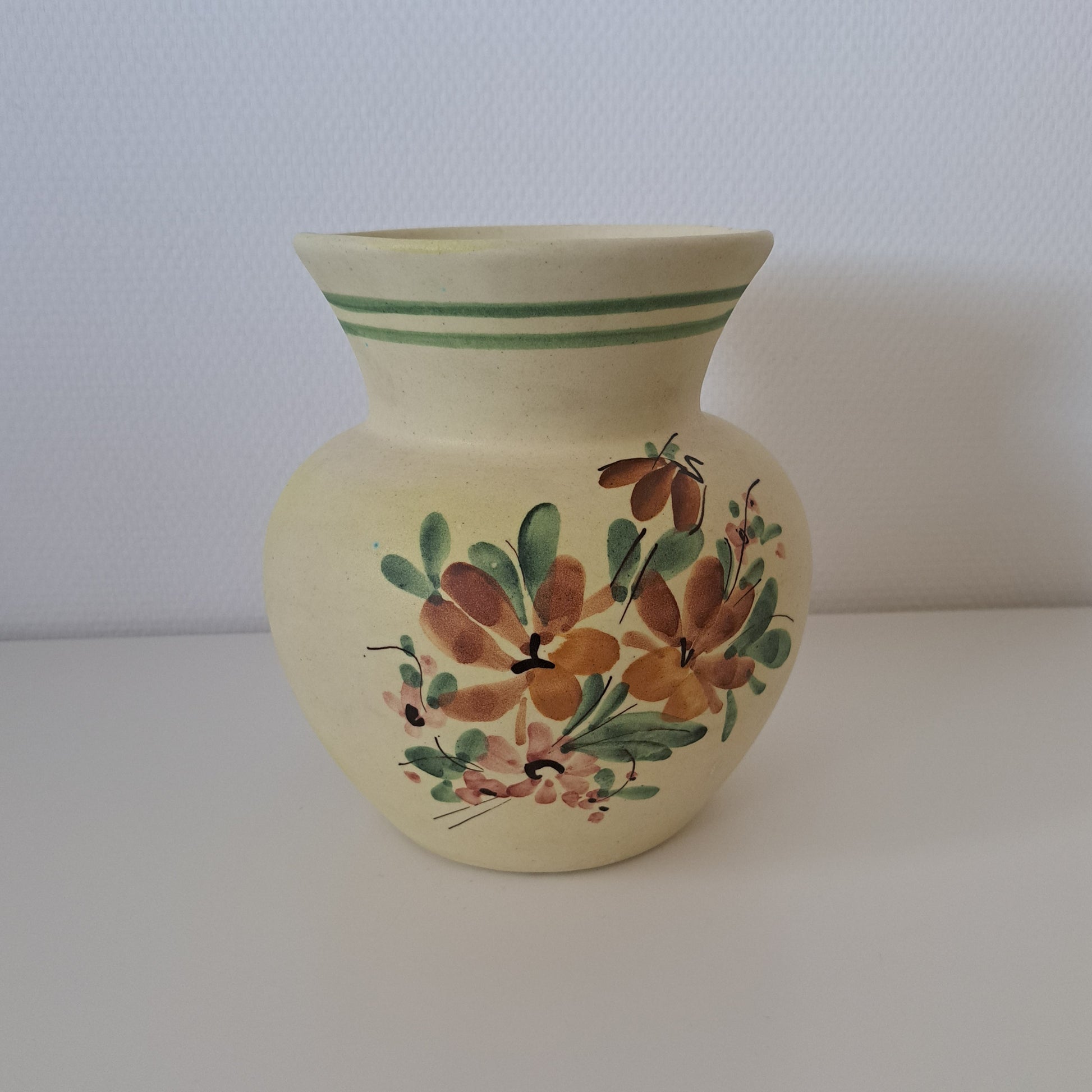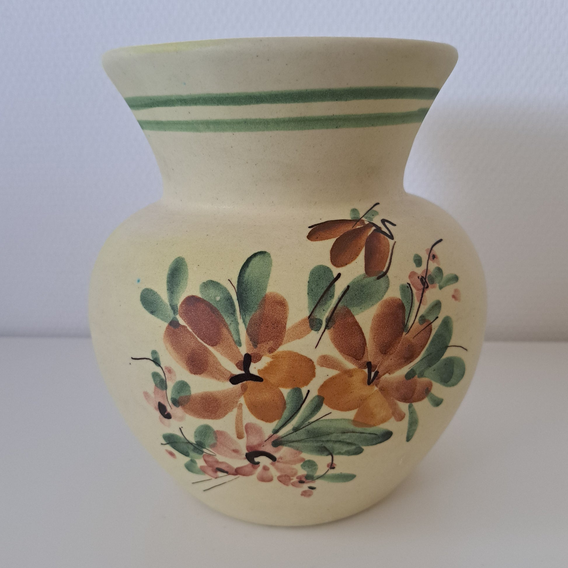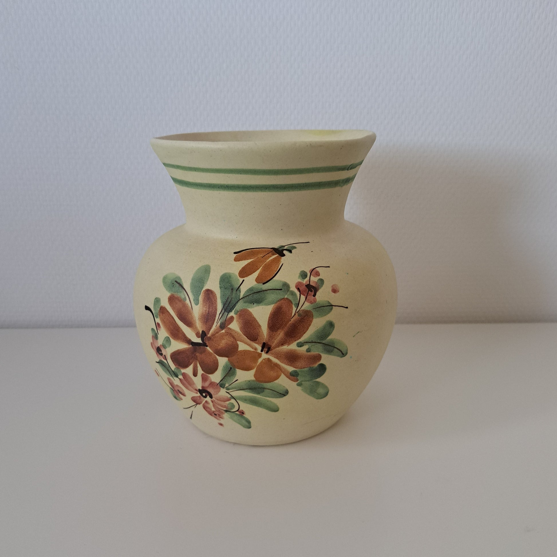 Kupittaan saven kaunis ja ihastuttava, vaaleansävyinen maljakko/ruukku. Maljakon herkkä ja viehättävä kukkakuvio on käsinmaalattu, kuten Kupittaan saven tuotannossa kuuluukin.