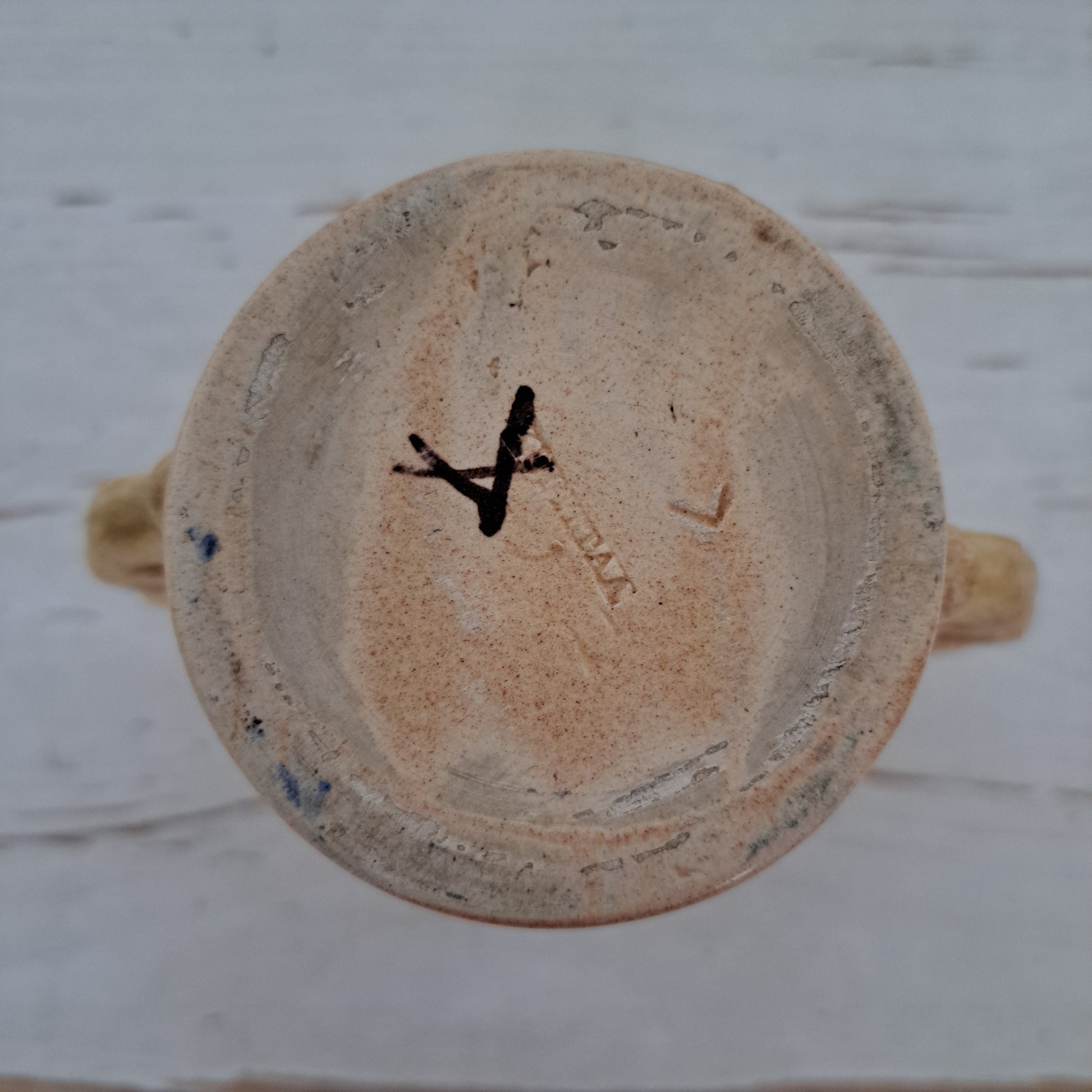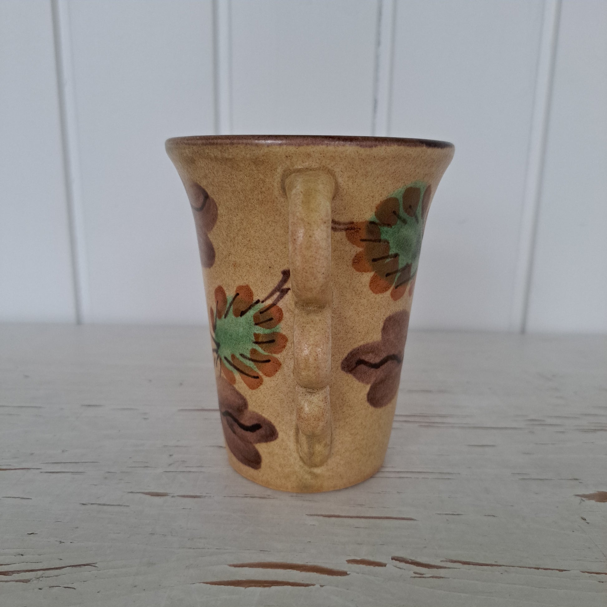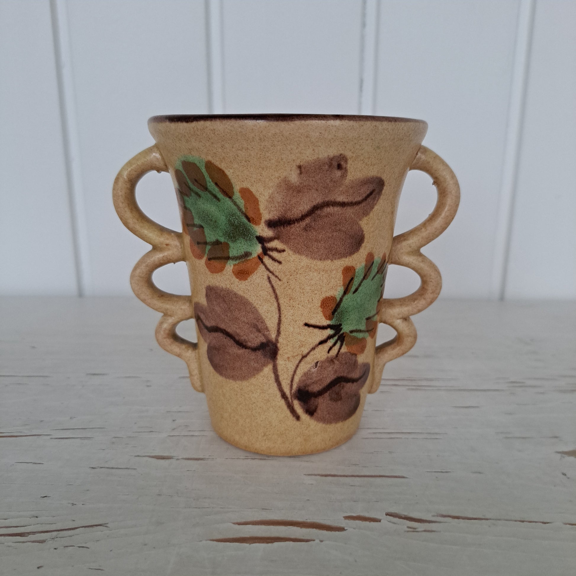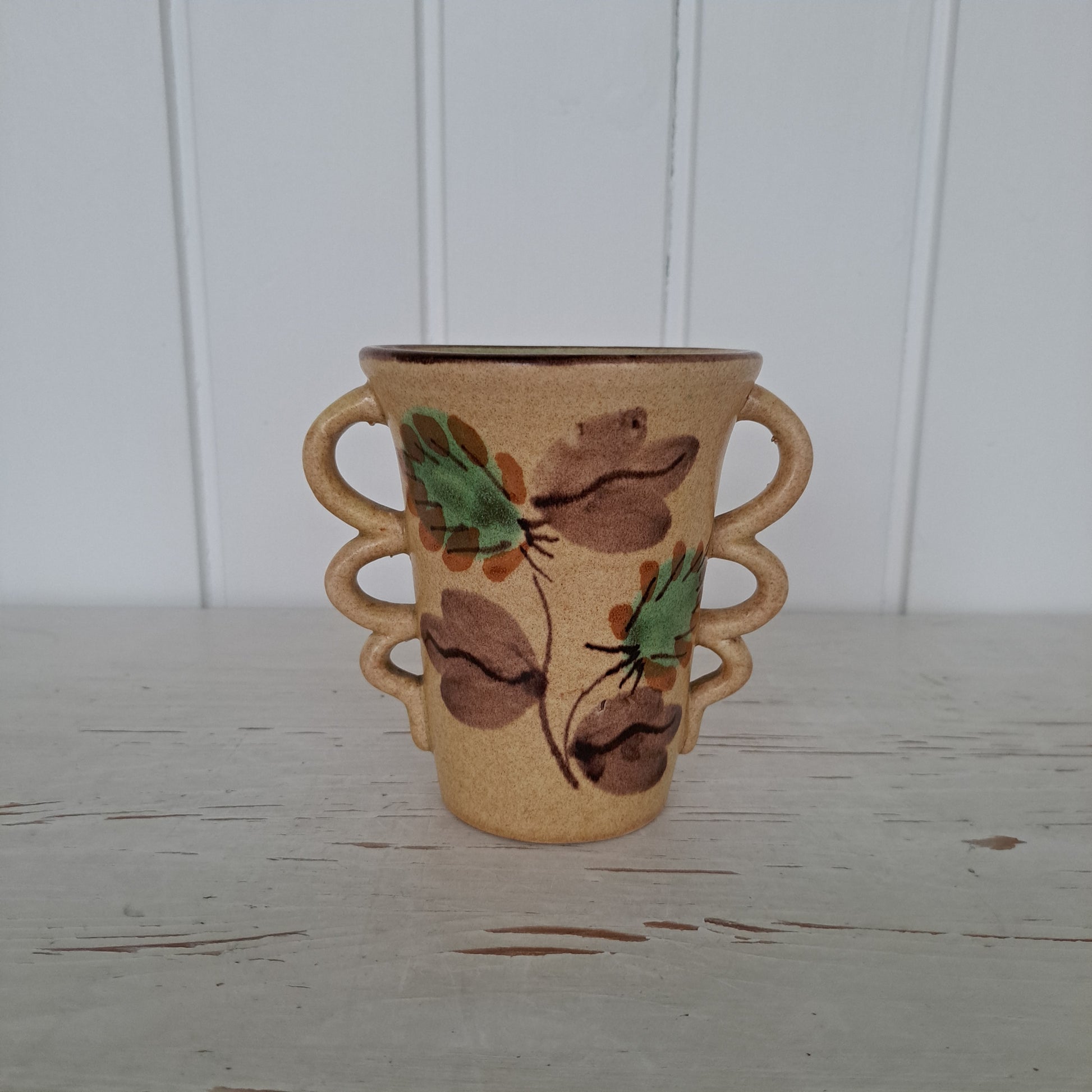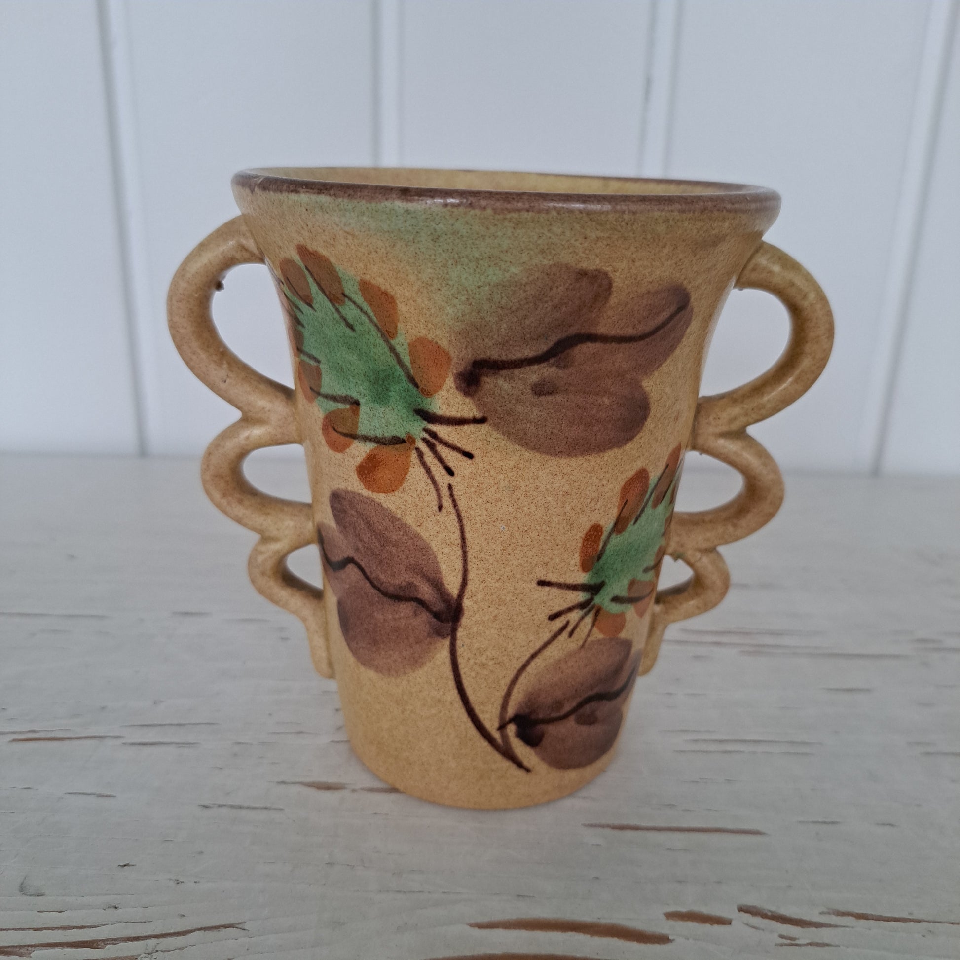Kupittaan saven rusehtavan sävyinen, jossa on vihertävät kukkakuviot. Maljakossa myös hauskat "sivukorvat"!