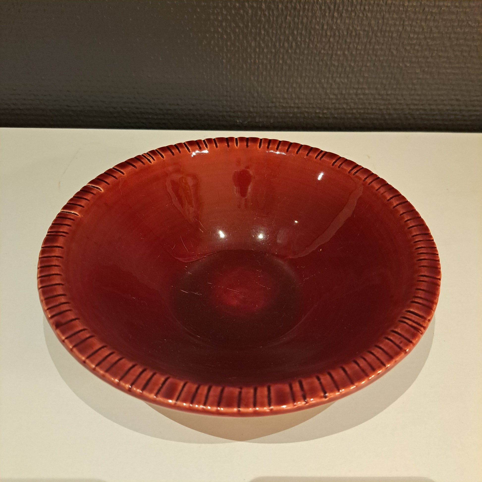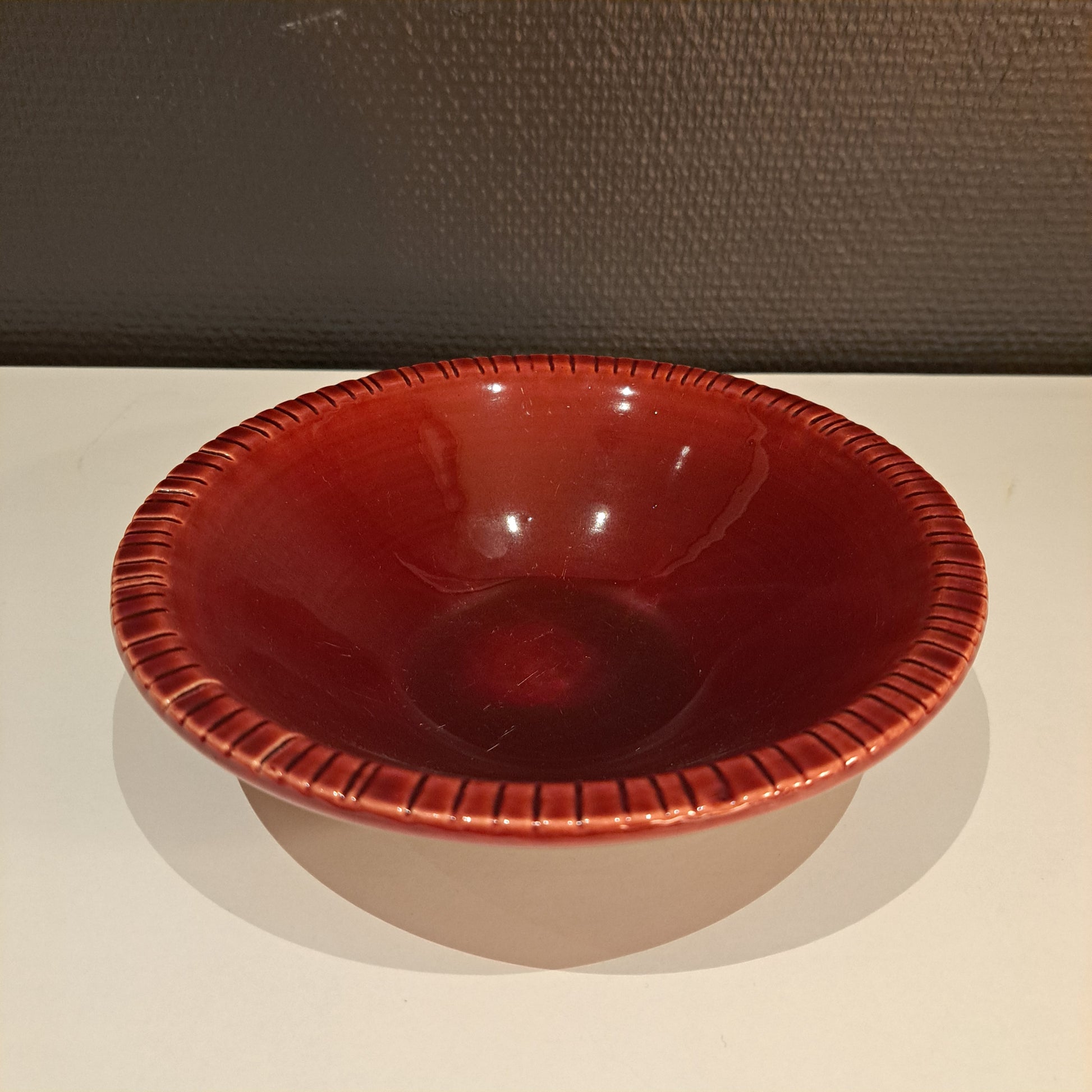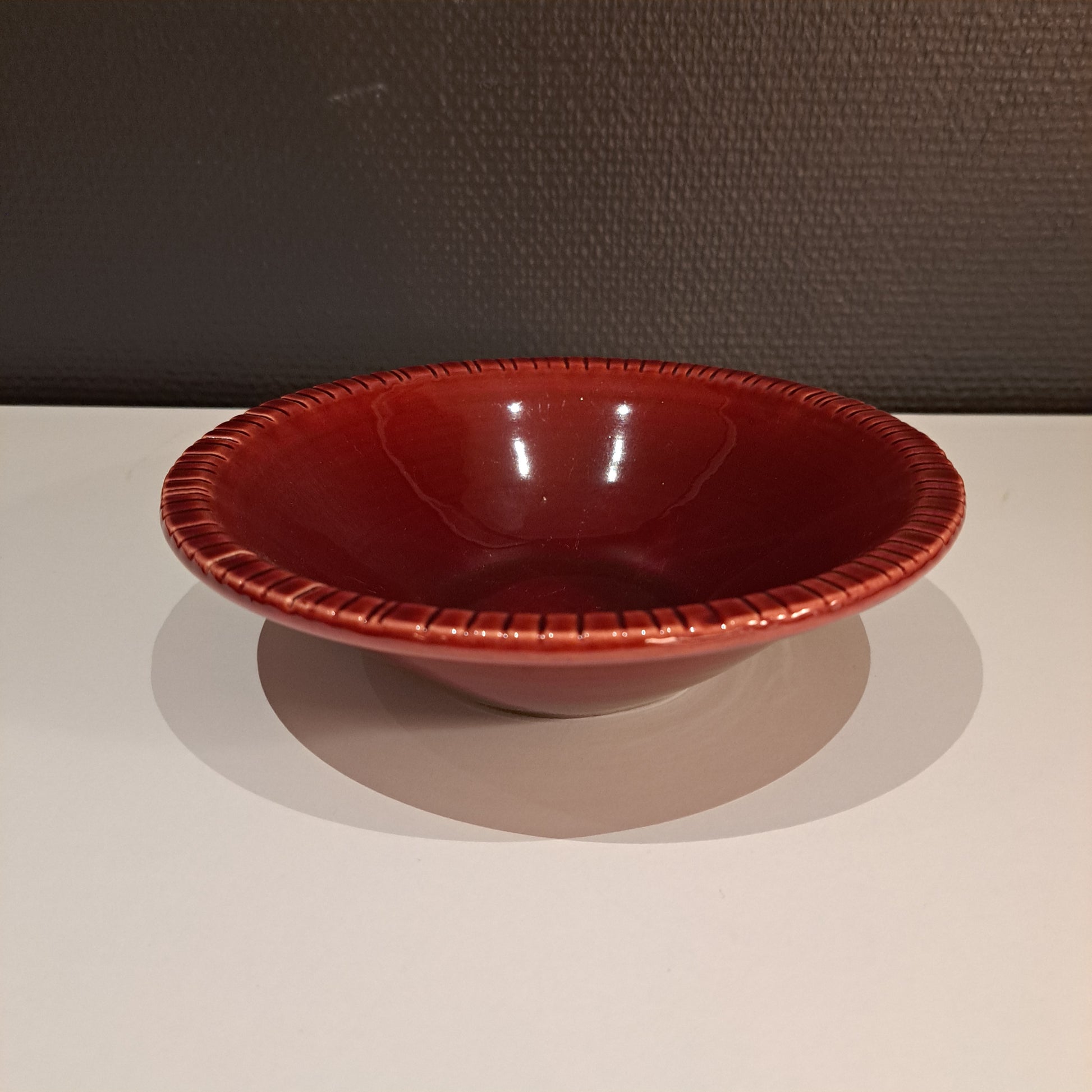 Kupittaan saven kauniin, burgundinpunainen kulho, jonka pinta on lasitettu.