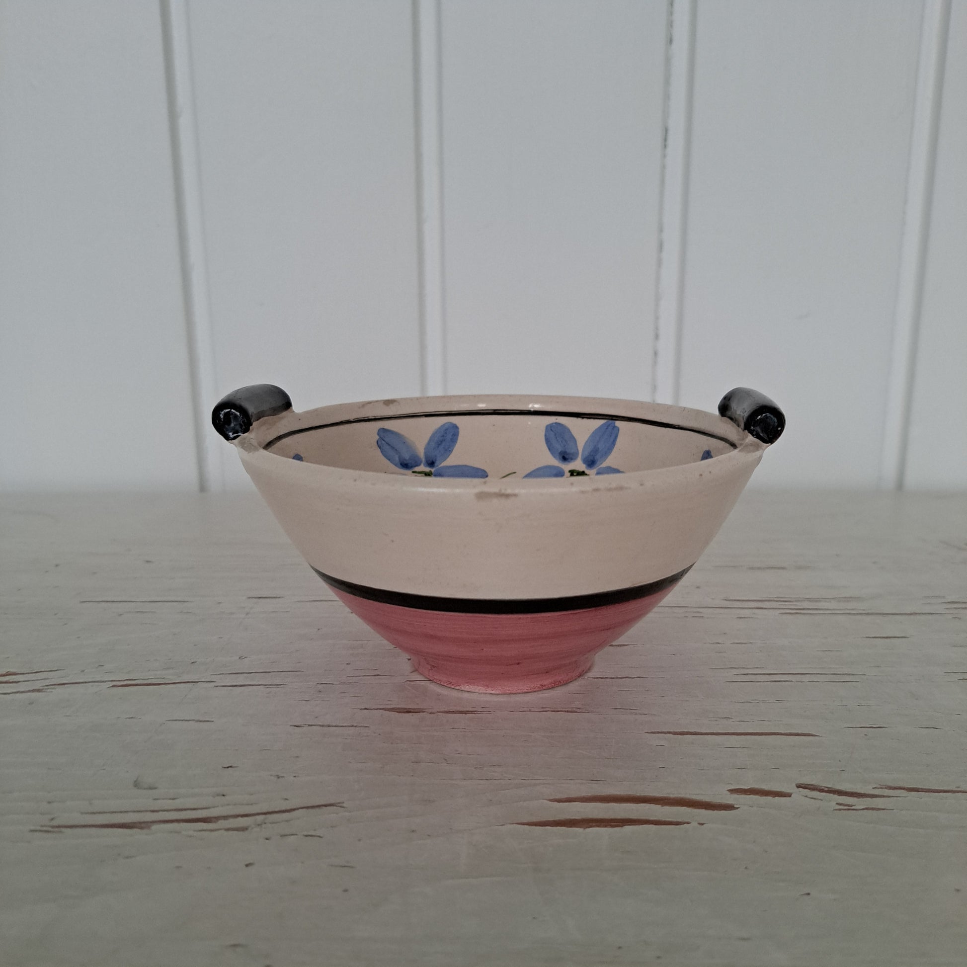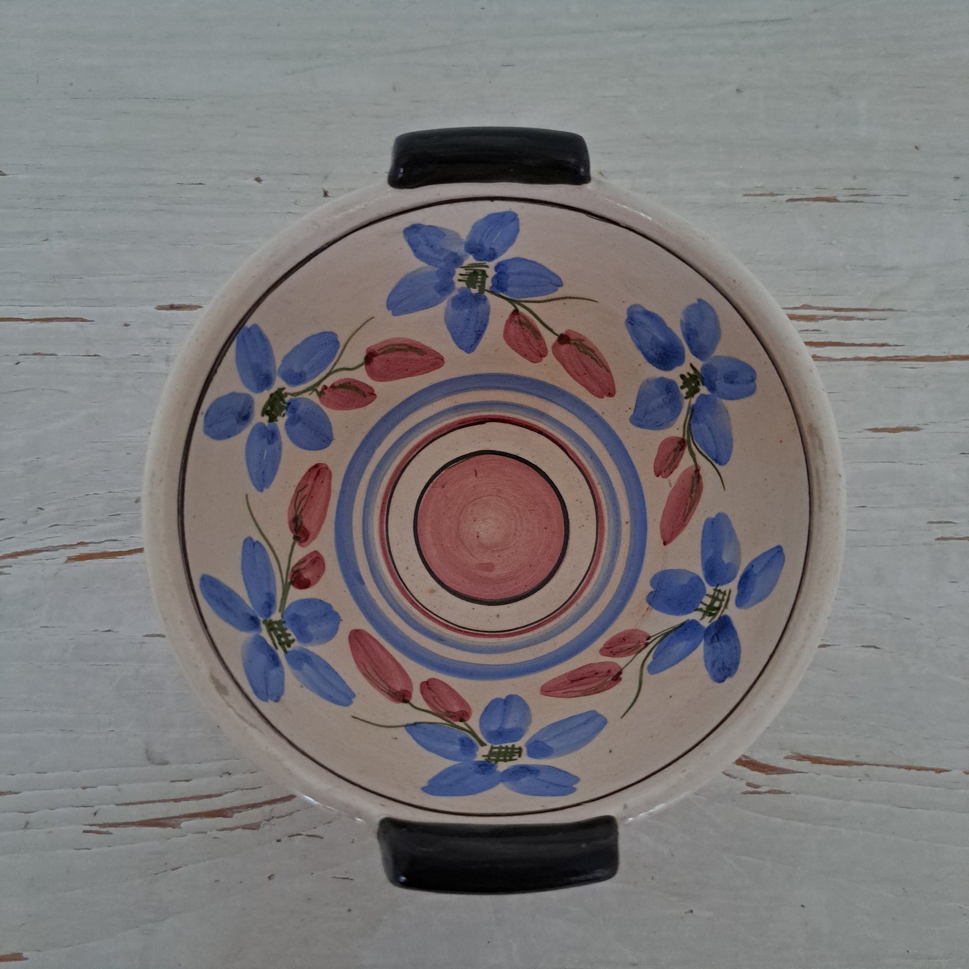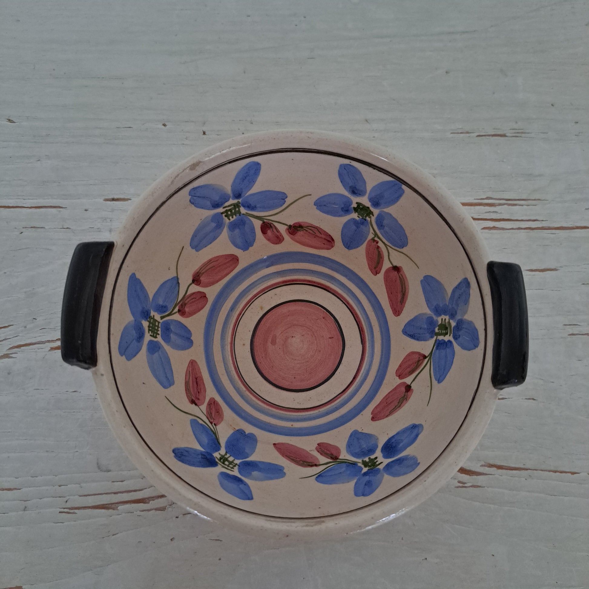 Kupittaan saven hieman erilainen kulho,"riisikupin" mallinen. Käsinmaalatut kukkakuviot koristavat kulhon sisäpuolta ja ilkopuolelta kulho on kaksivärinen. Erikoisena yksityiskohtana ovat mustat kahvat kulhon reunalla.