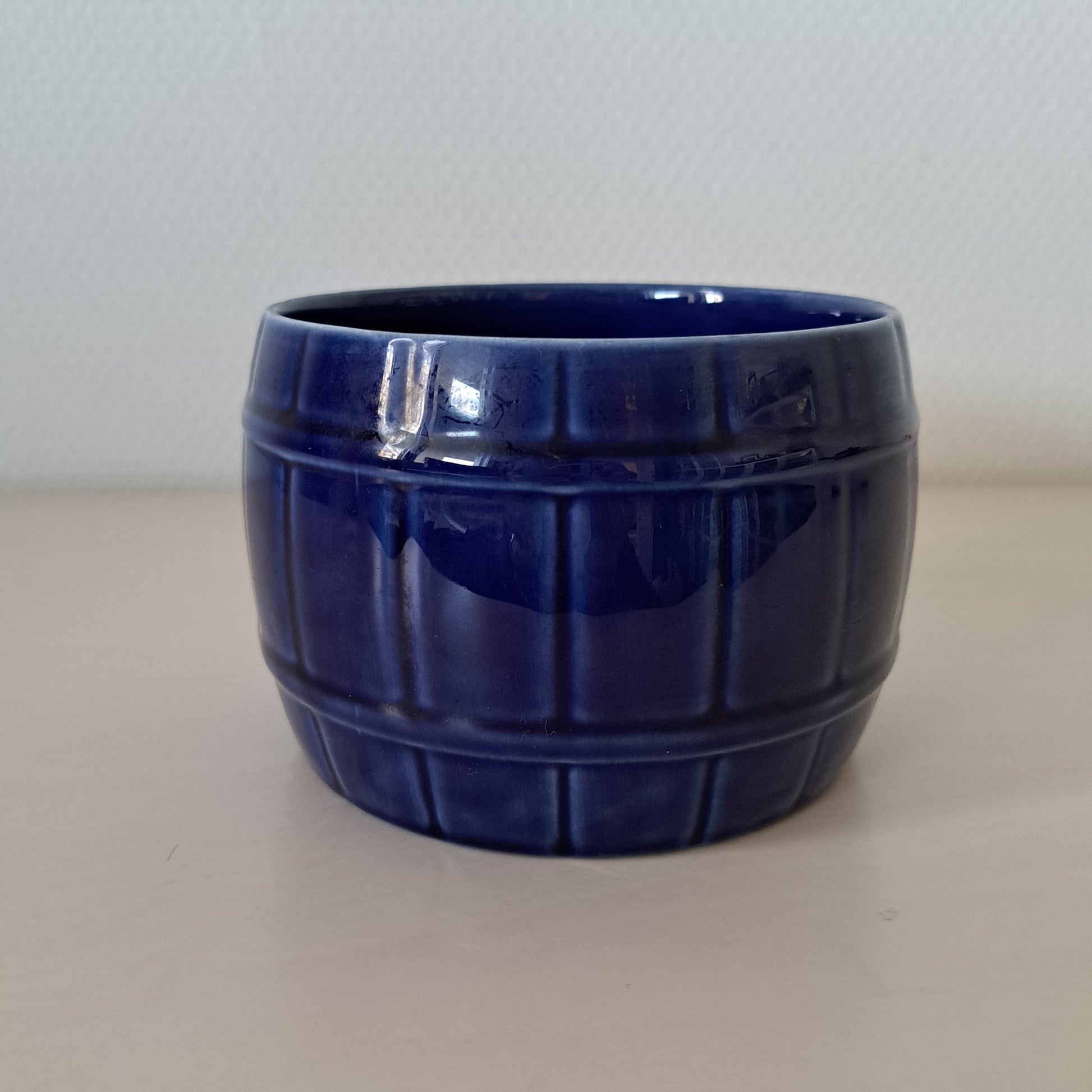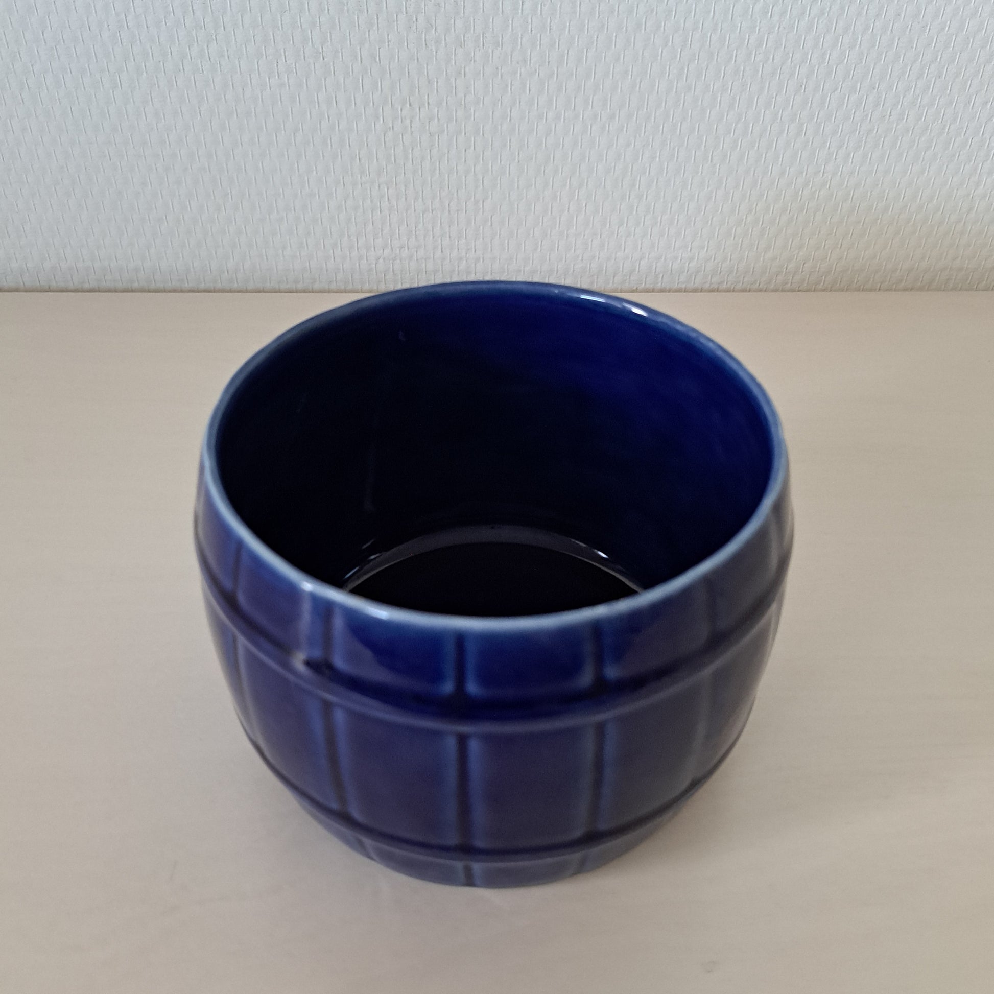 Kupittaan saven linjakas tynnyrimäinen kulho, joka on väriltään kauniin tummansininen.