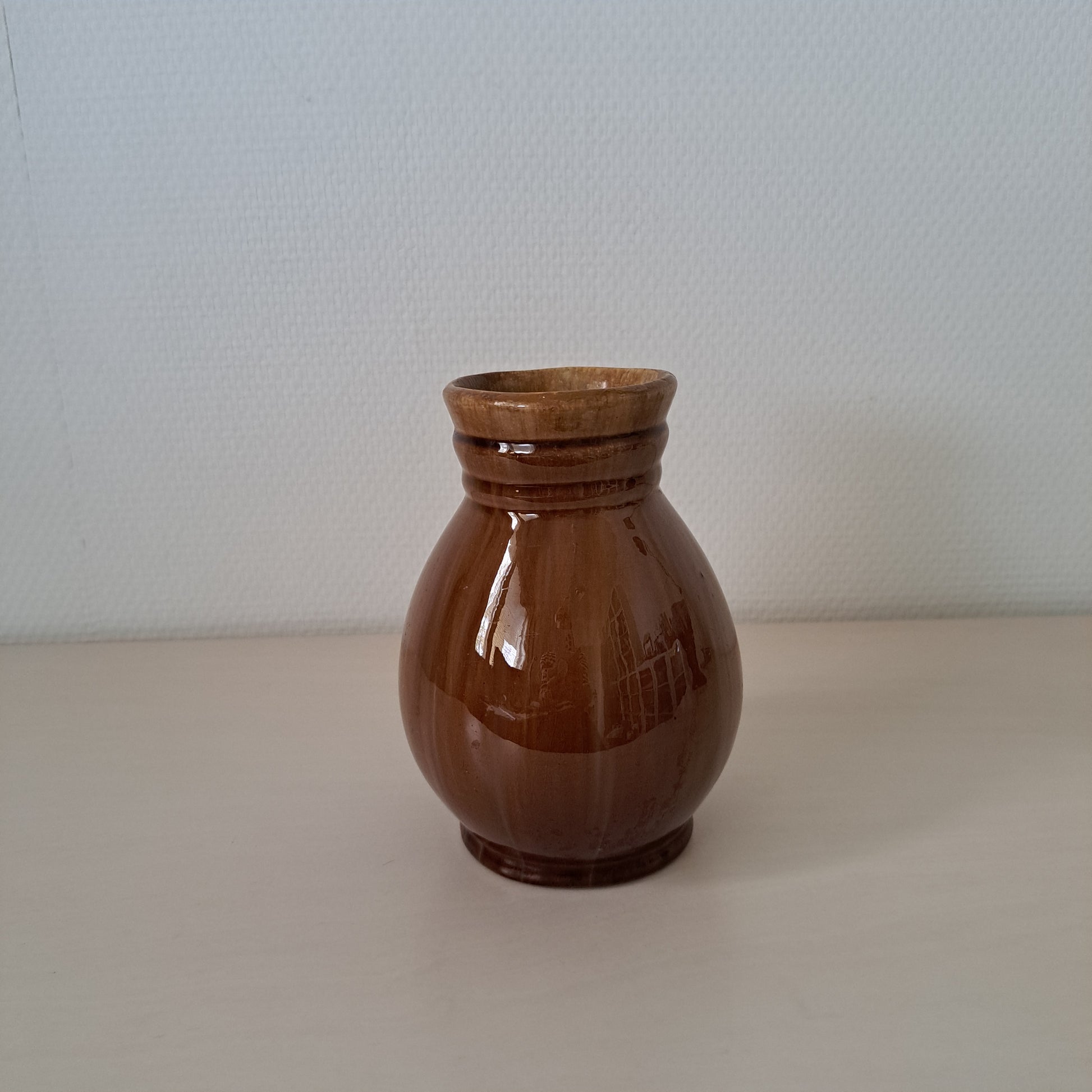 Kupittaan saven pyöreät muodot omaava maljakko, joka on väriltään ruskea. Maljakon pinnassa pientä krakelotumista.