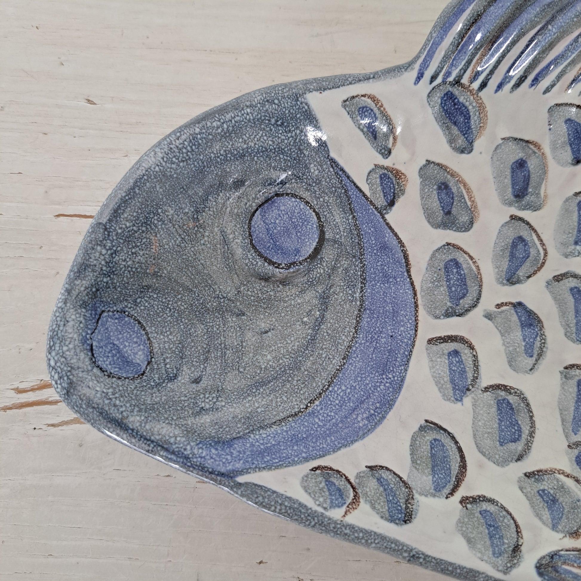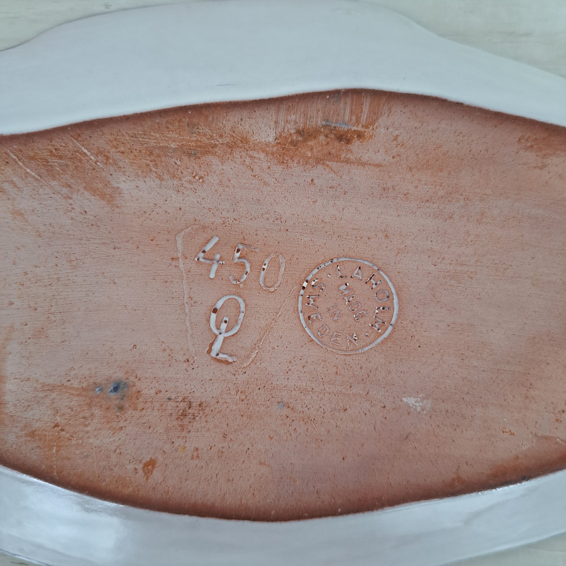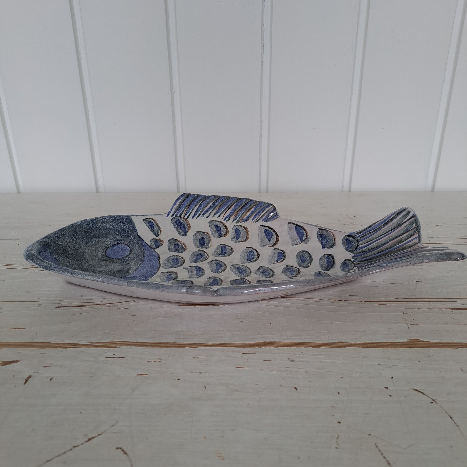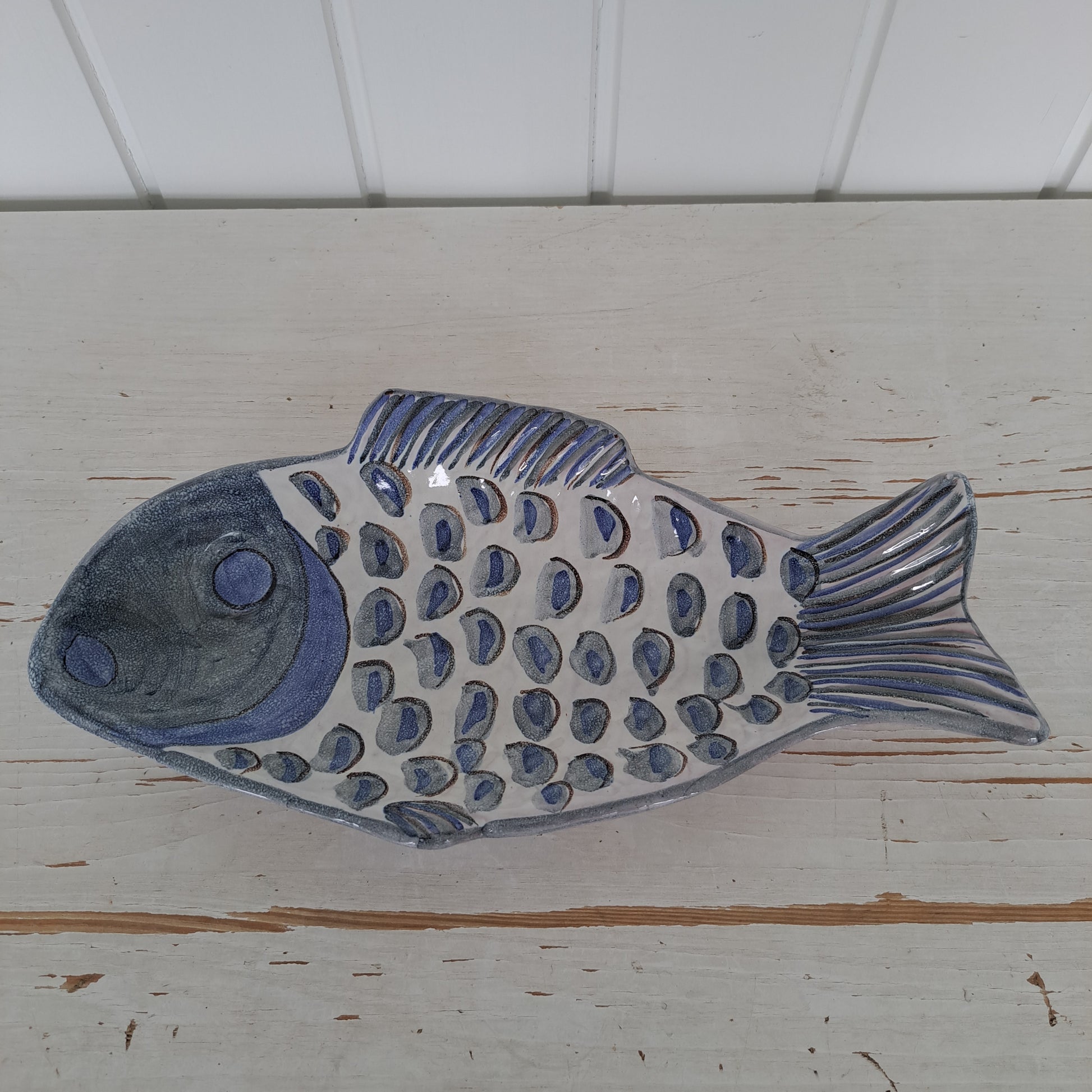 Ruotsalaisen Laholms Keramikin valmistama ja Olof Larssonin suunnittelema viehättävä sini-harmaa kalavati. Laholms Keramik perustettiin 1897 ja sen toiminta jatkui aina vuoteen 2000. Tämä vati on lasitettua keramiikkaa, uuninkestävä astia.