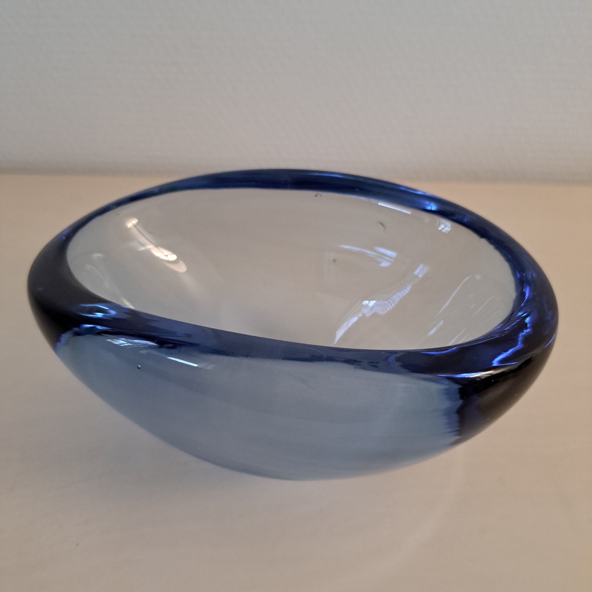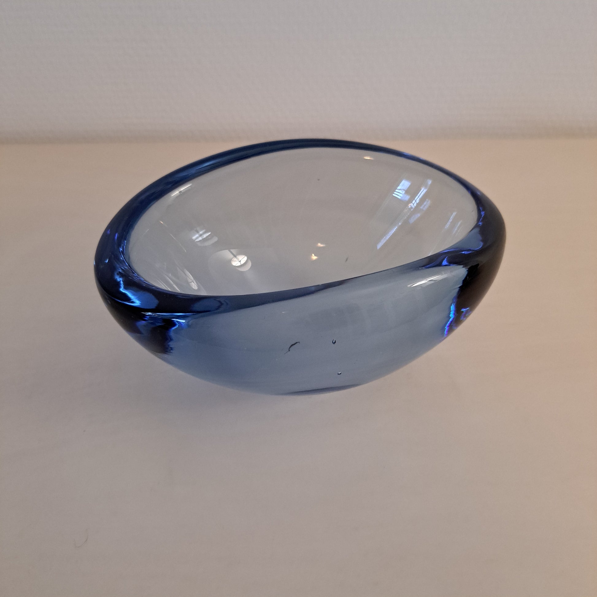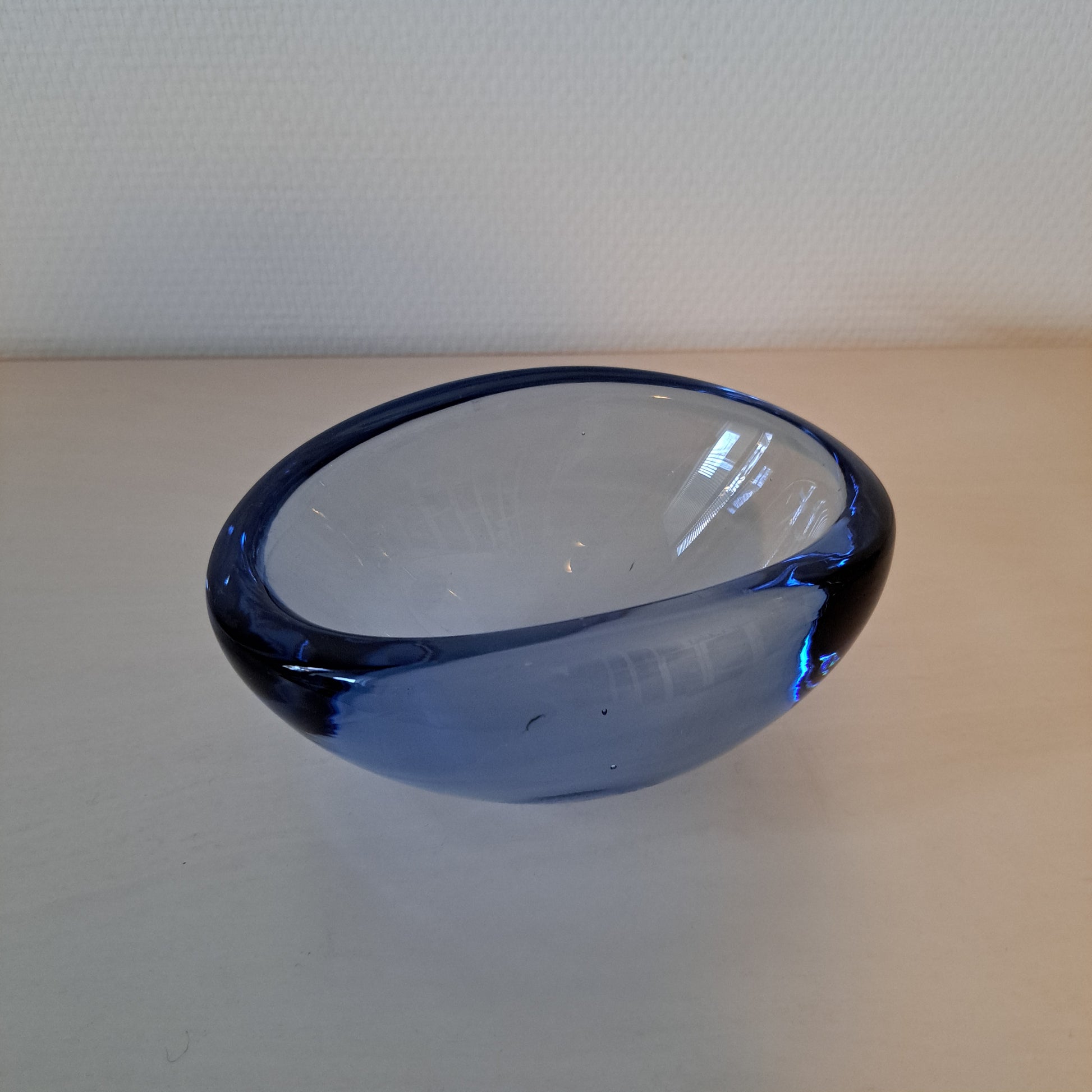 Tyylikäs, sinisävyinen lasikulho. Kulho on muodoltaan soikea ja se on valmistettu paksusta lasista.