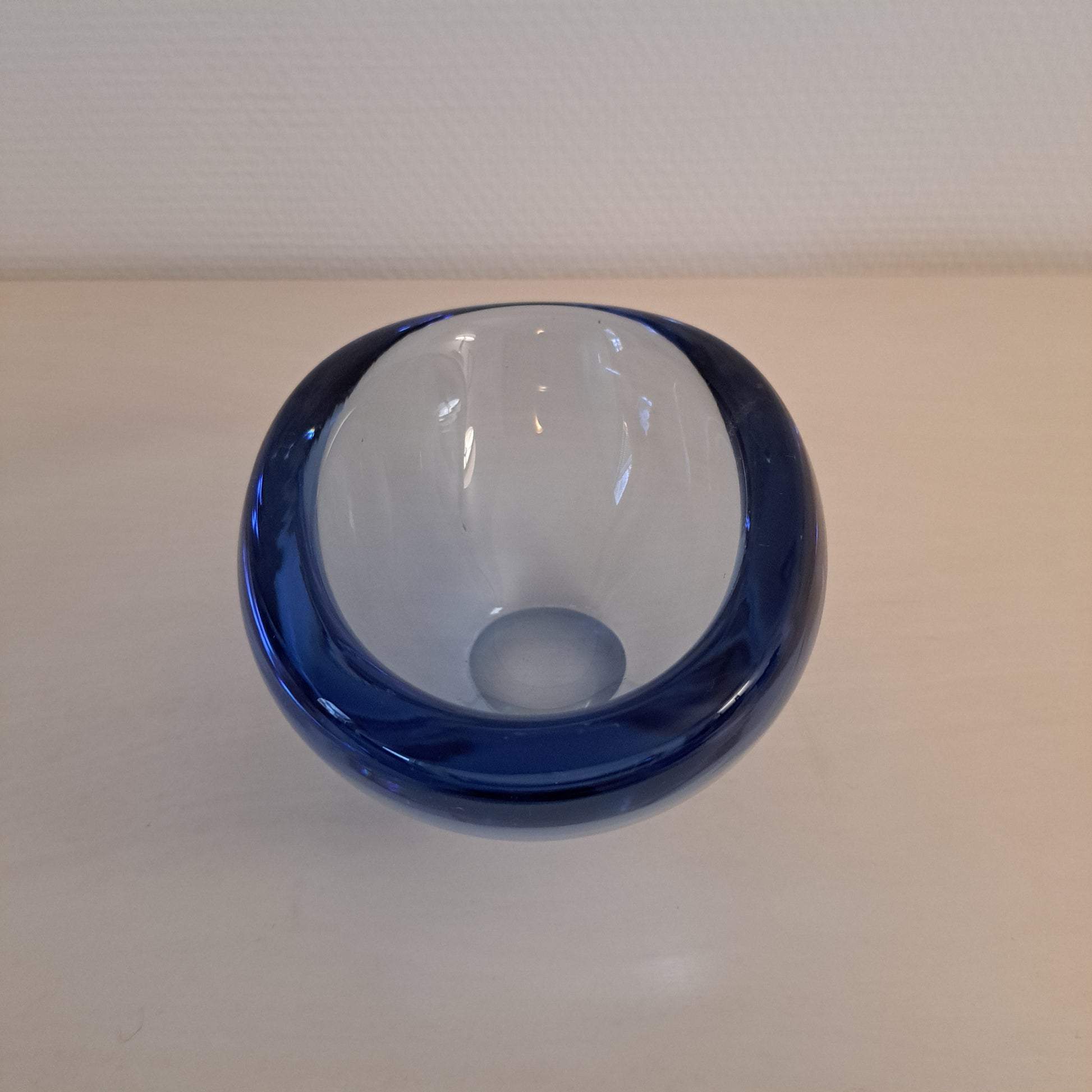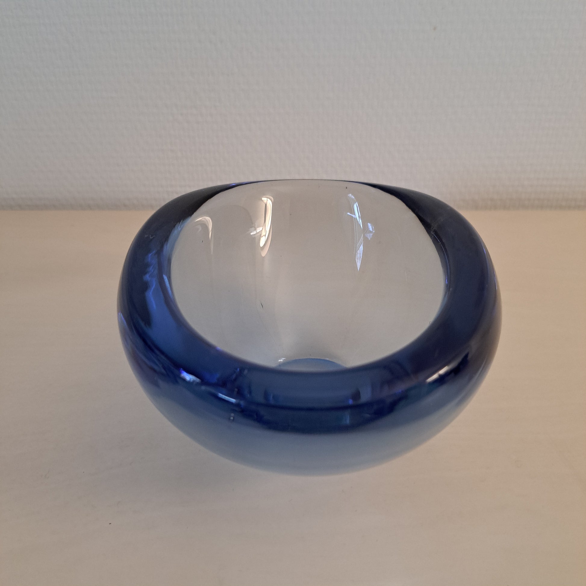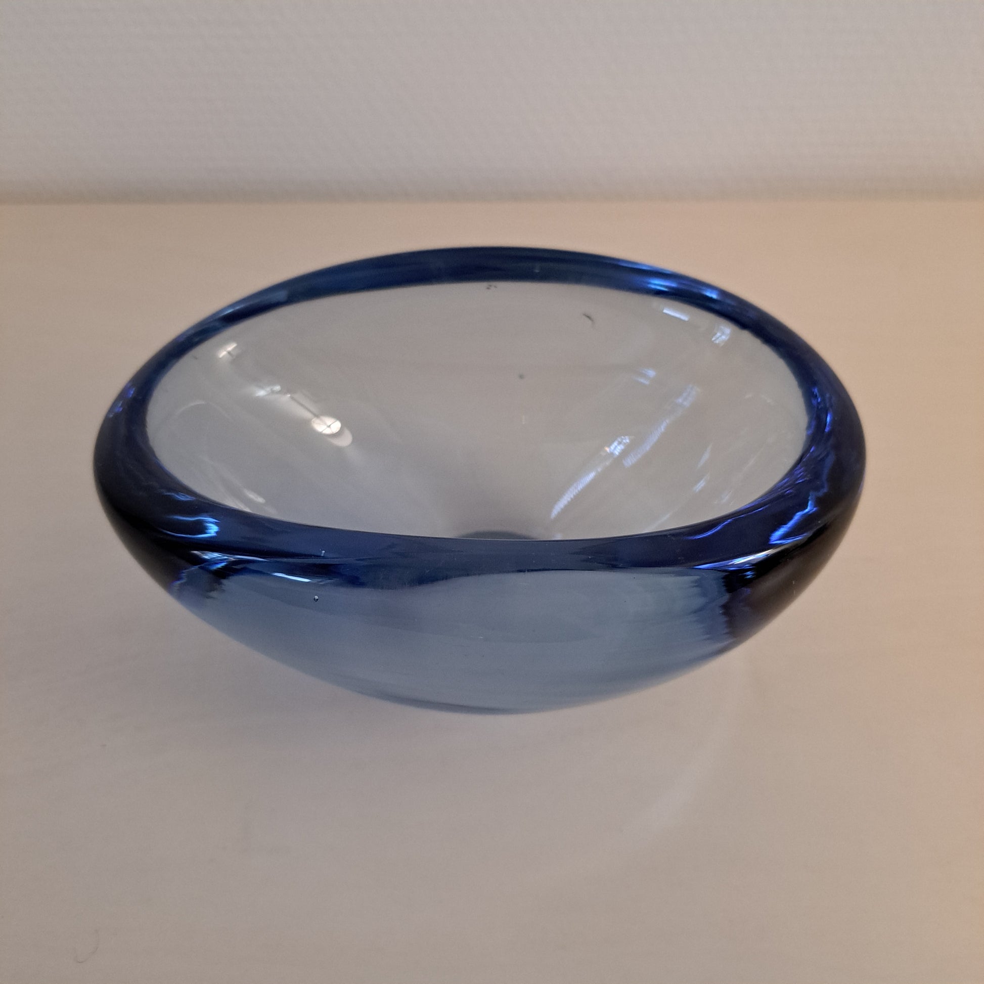 Tyylikäs, sinisävyinen lasikulho. Kulho on muodoltaan soikea ja se on valmistettu paksusta lasista.