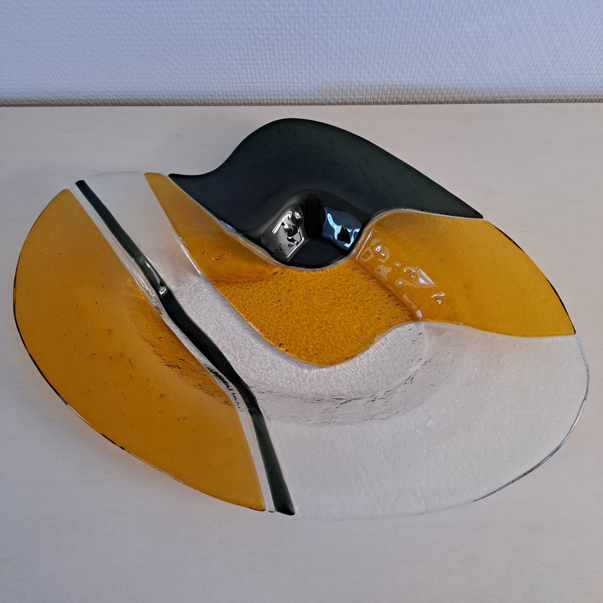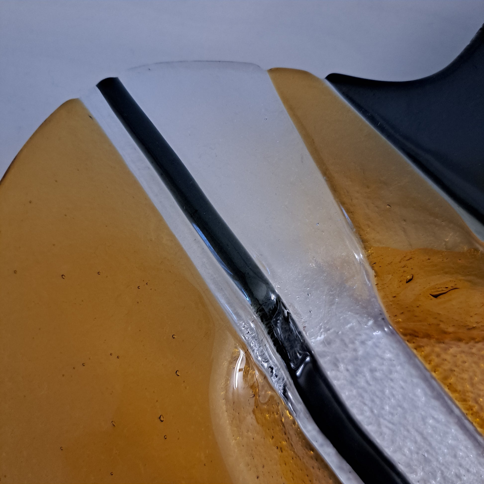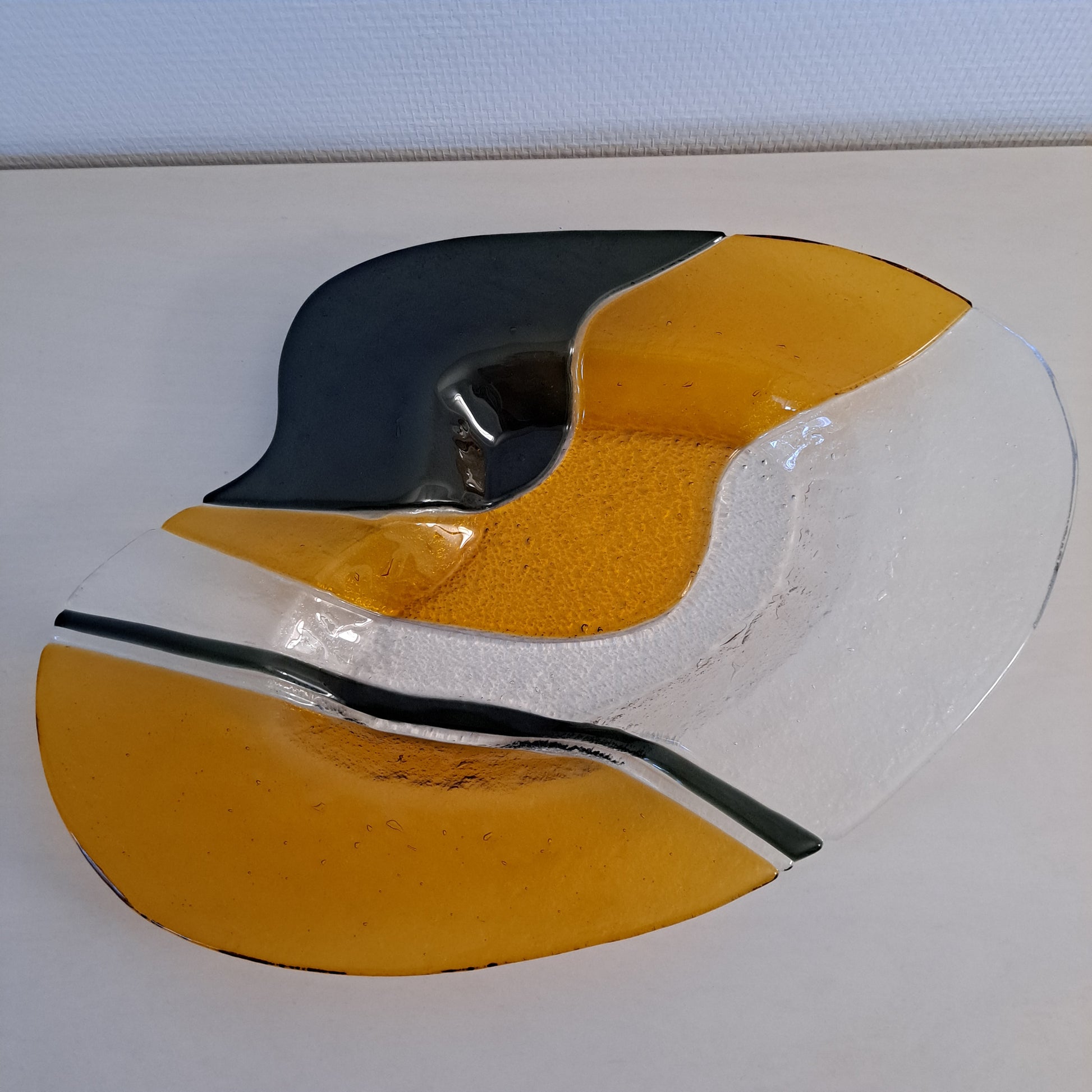 Upea lasilautanen on monikäyttöinen, ihastuttava arkikäytössä tai sitten sisustuselementtinä. Värit ovat vahvat ja voimakkaat: musta, keltainen ja kirkas lasi. Muotoilultaan lautanen muistuttaa taiteilijan väripalettia.2,5