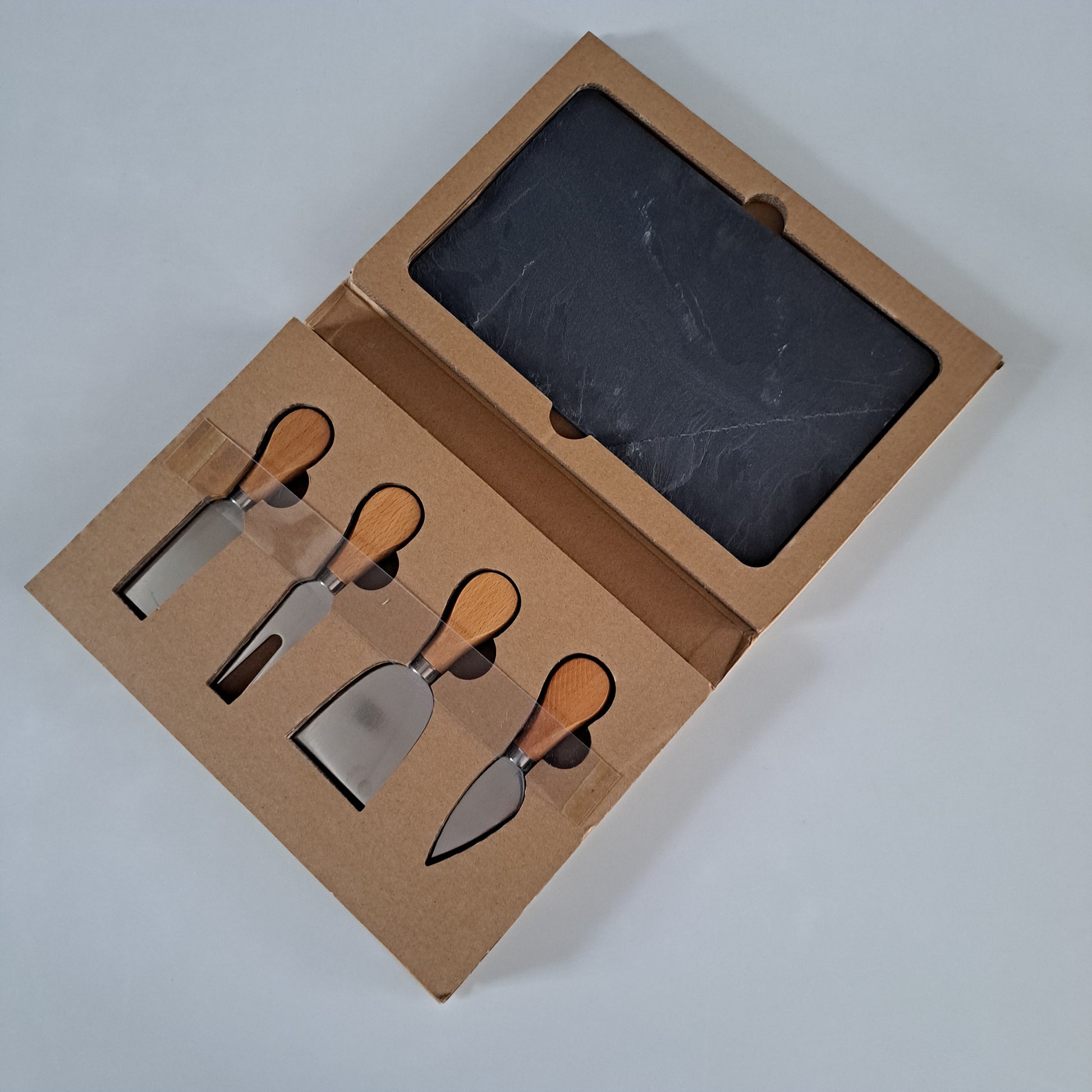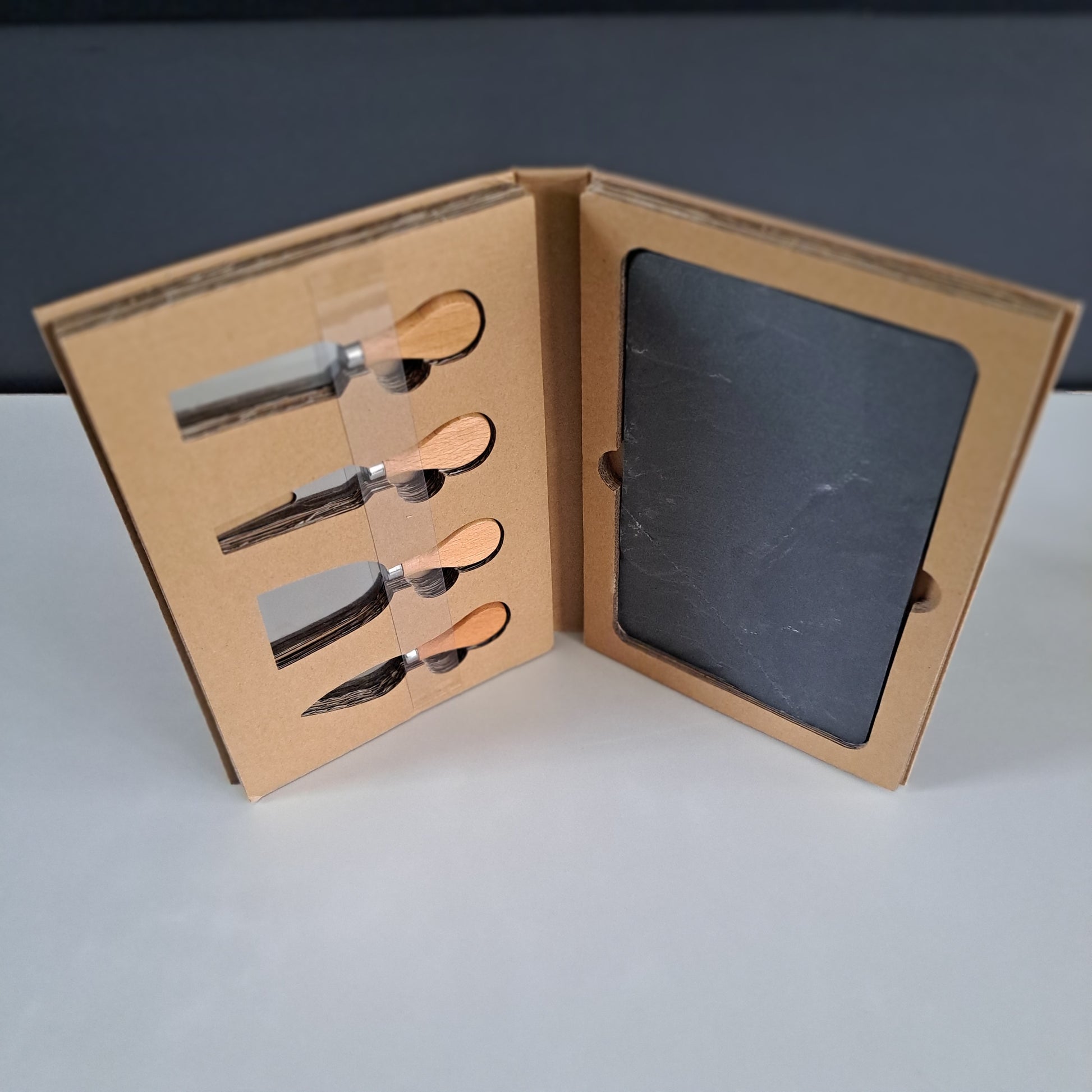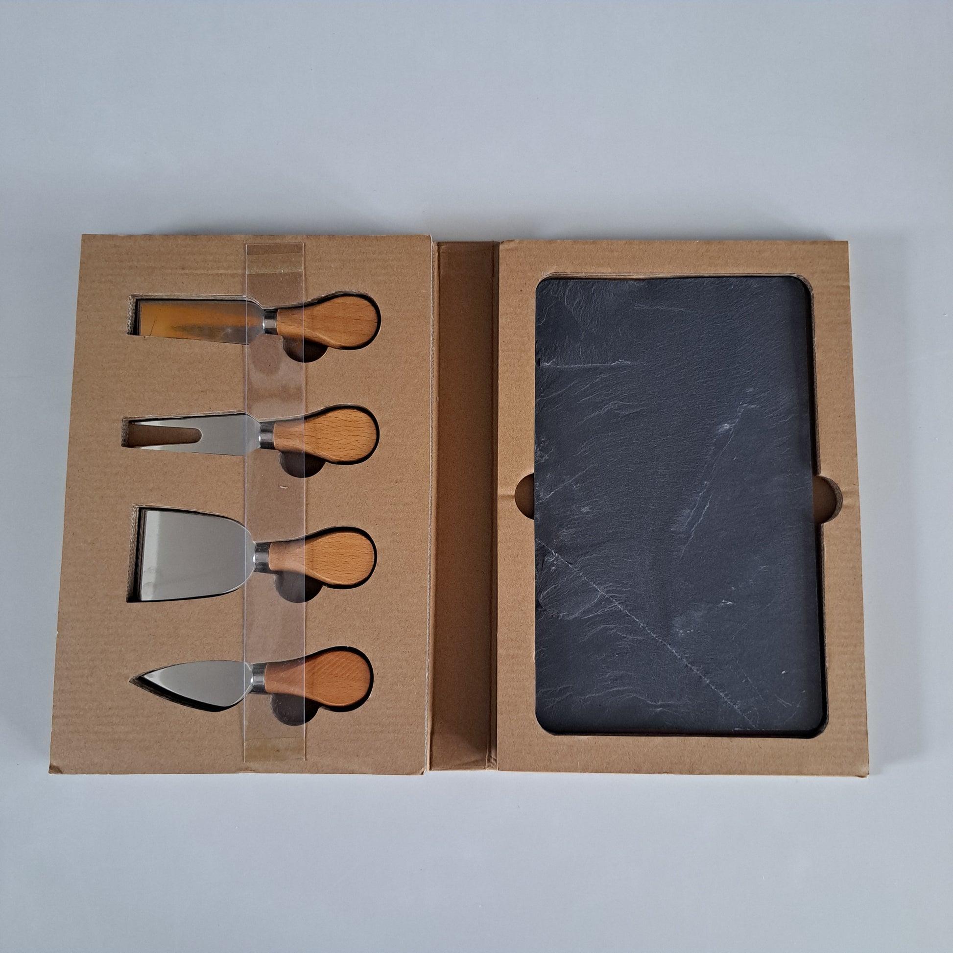 Upea ja tällä kertaa täysin käyttämätön liuskekivialusta juustoveitsineen. Koko setti on pakattu hauskasti "kirjan kansiin", jossa niitä on näppärä säilyttää myös käytön jälkeen. Veitsien terät ovat ruostumatonta terästä ja kahvat pyökkiä.