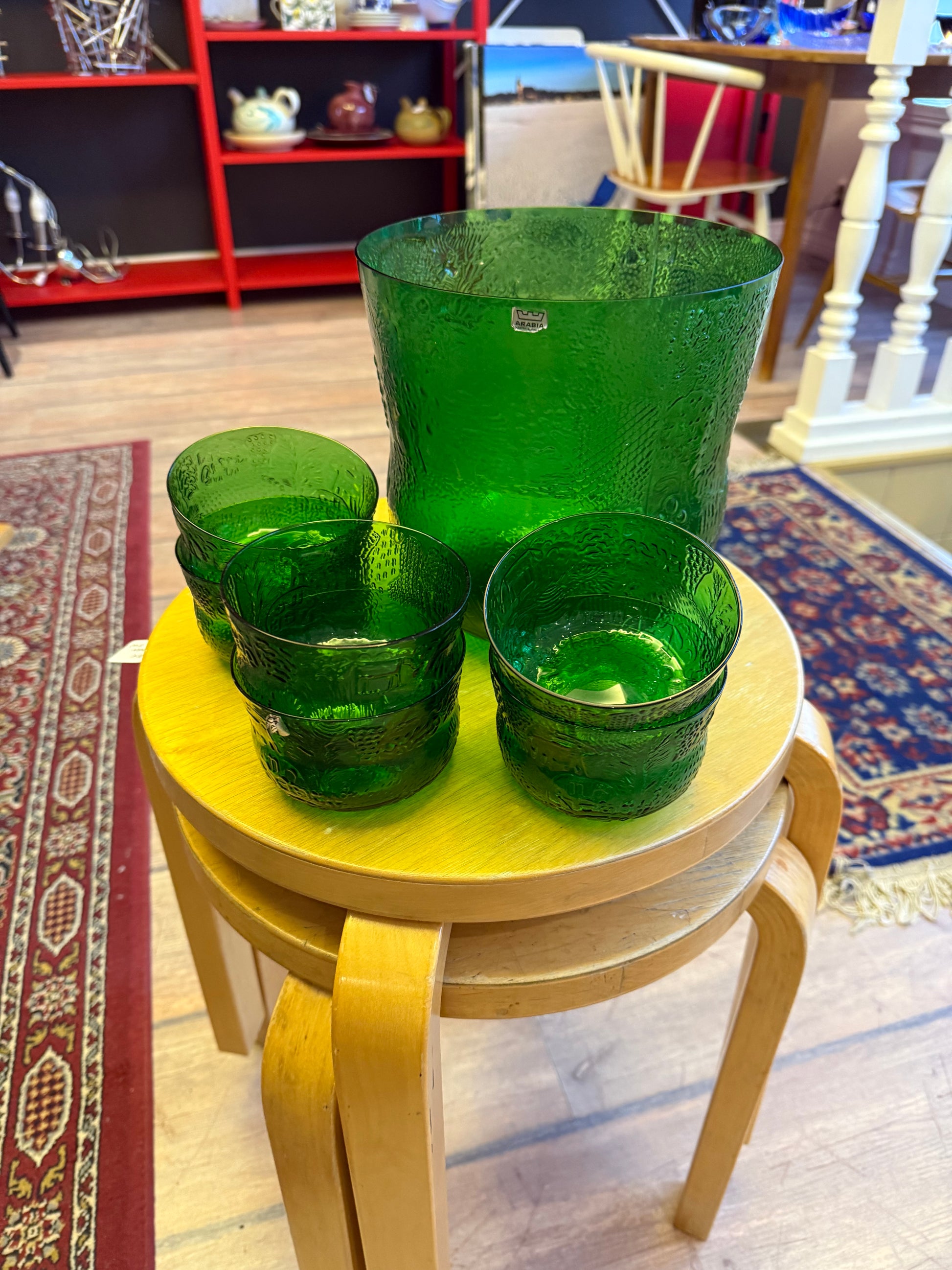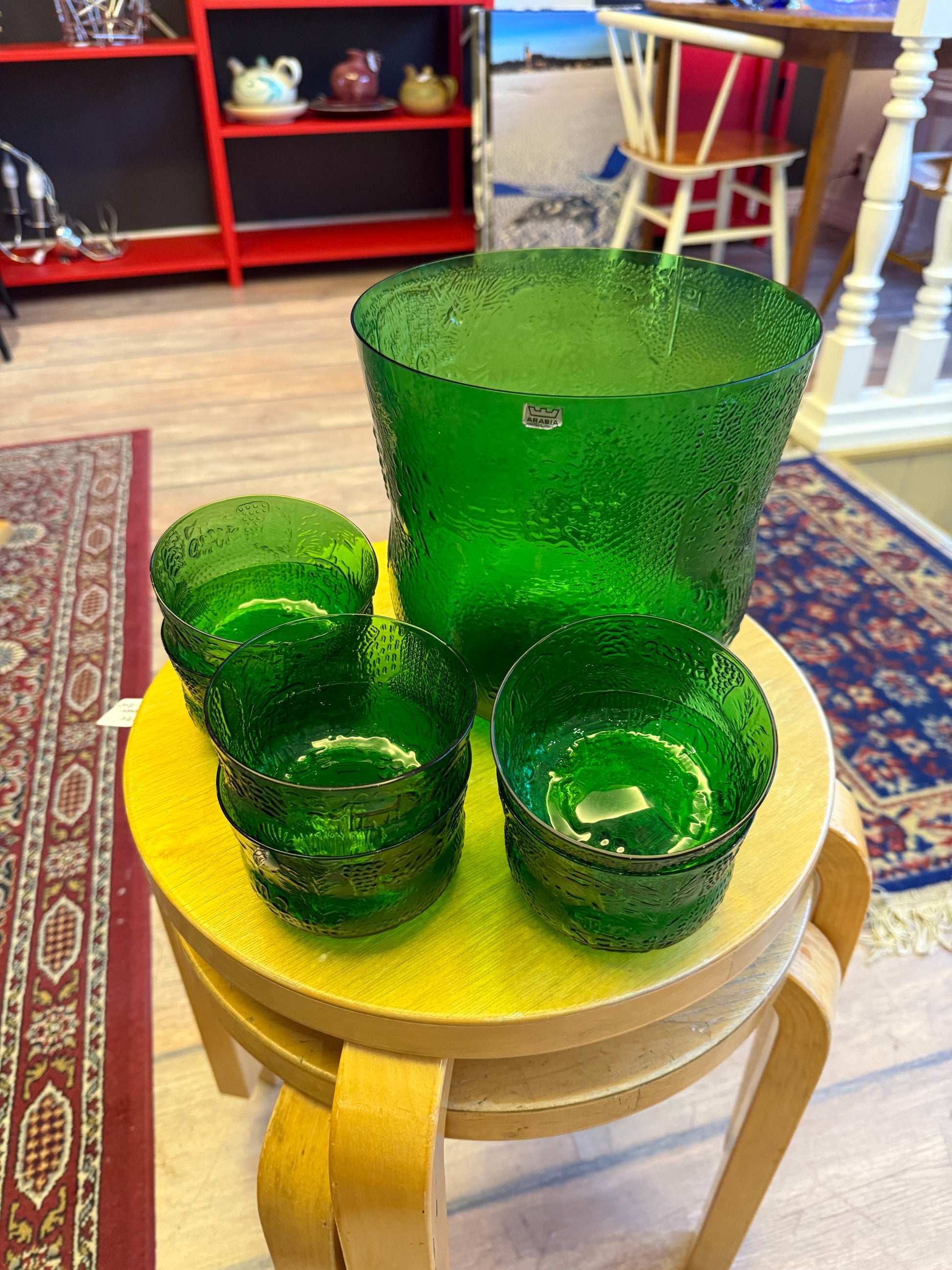 Myynnissä on iso kulho, joka on ns. boolikulho ja tilavuudeltaan neljä litraa. Kokonaisuuteen kuuluu myös kuusi kappaletta jälkiruokakulhoja'. Kaunis ja toimiva kokonaisuus vaikka joulunajan herkkujen tarjoiluun