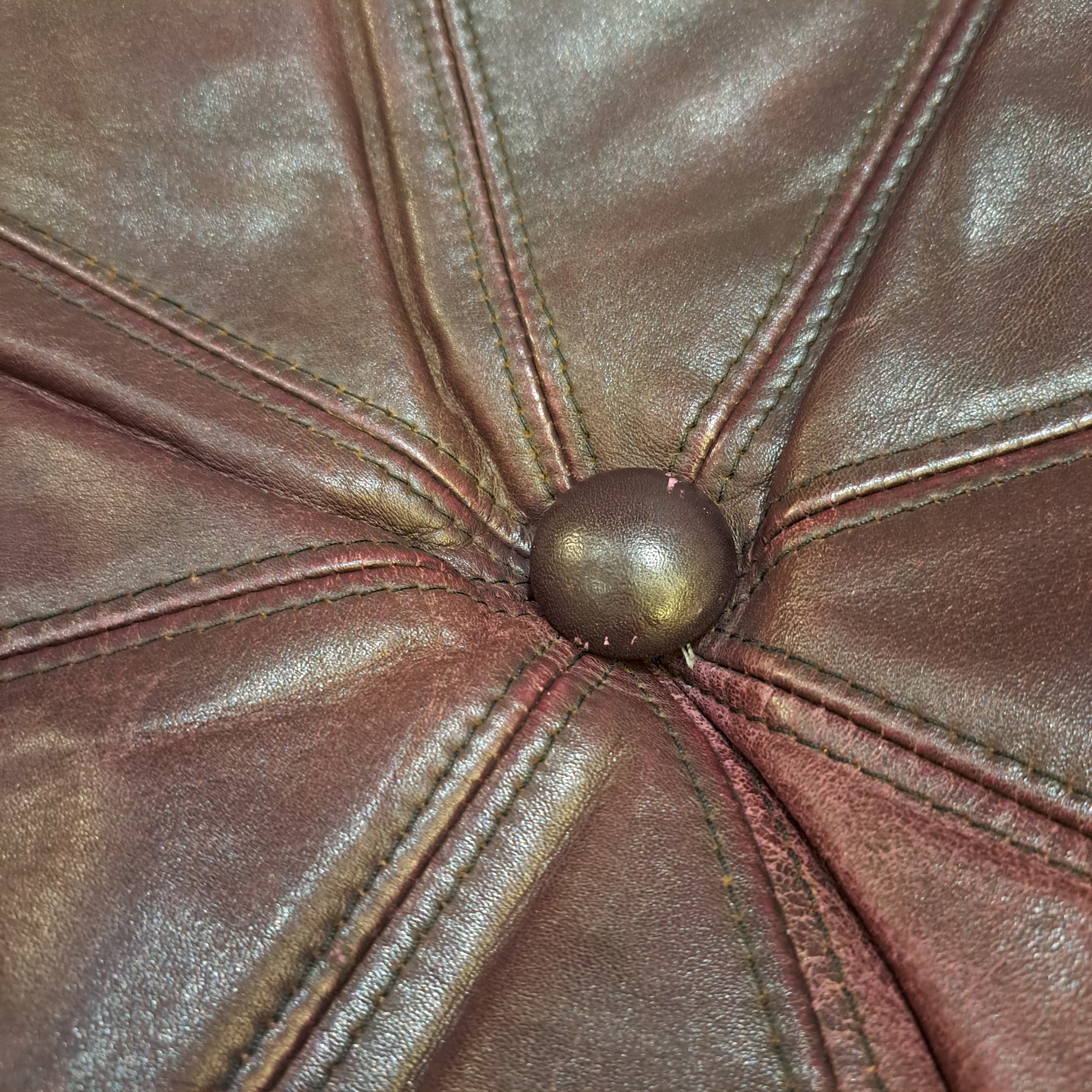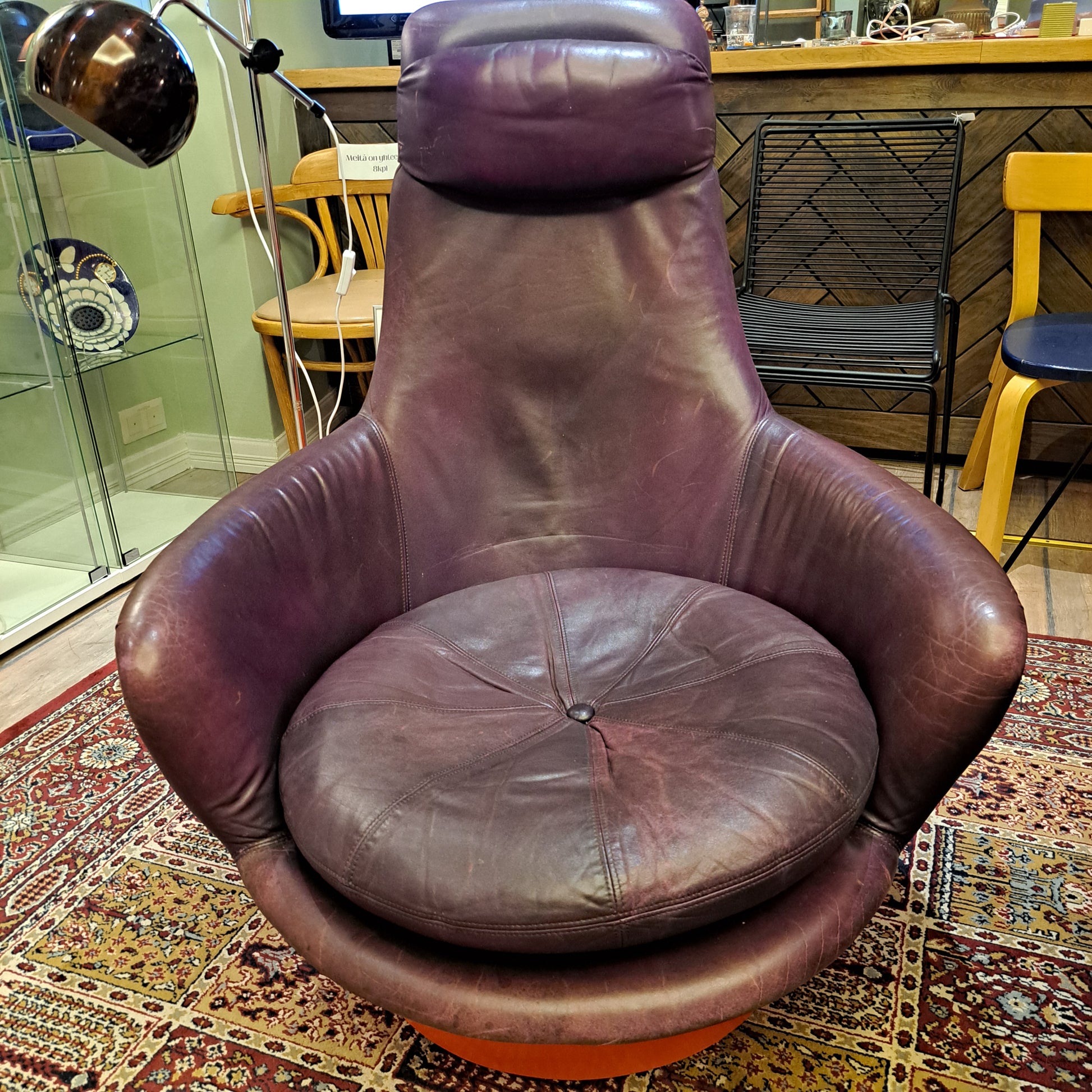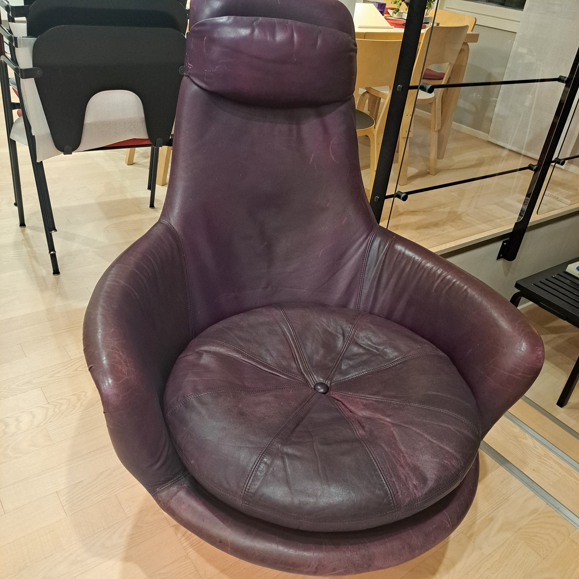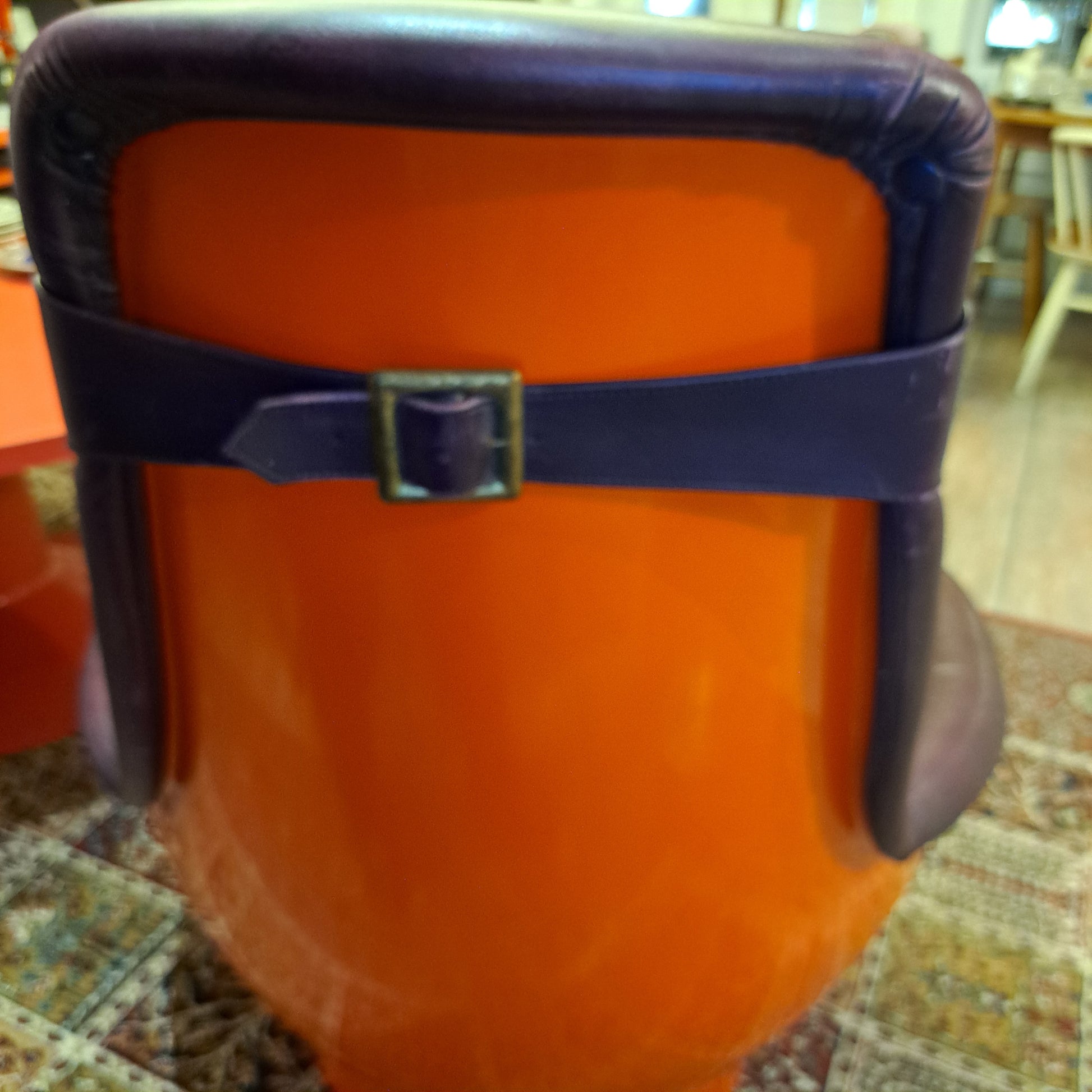 Vintagea suomalaisen Peem Oy:n valmistama ja Risto Halmeen ( 1934-1921) suunnittelema uniikki ja upea "Tina" nojatuoli 1970-luvulta! Nojatuolin runko on valmistettu oranssisesta lasikuidusta ja tuolin verhoilu on tumman luumunpunaista, pehmeää nahkaa. Runko on ehjä, vaikka pientä kulumaa on havaittavissa. Verhoilu on ehjä ja hyvässä kunnossa. Istuimen kaltevuus on säädettävissä ja nahkainen istuintyyny on irallinen.