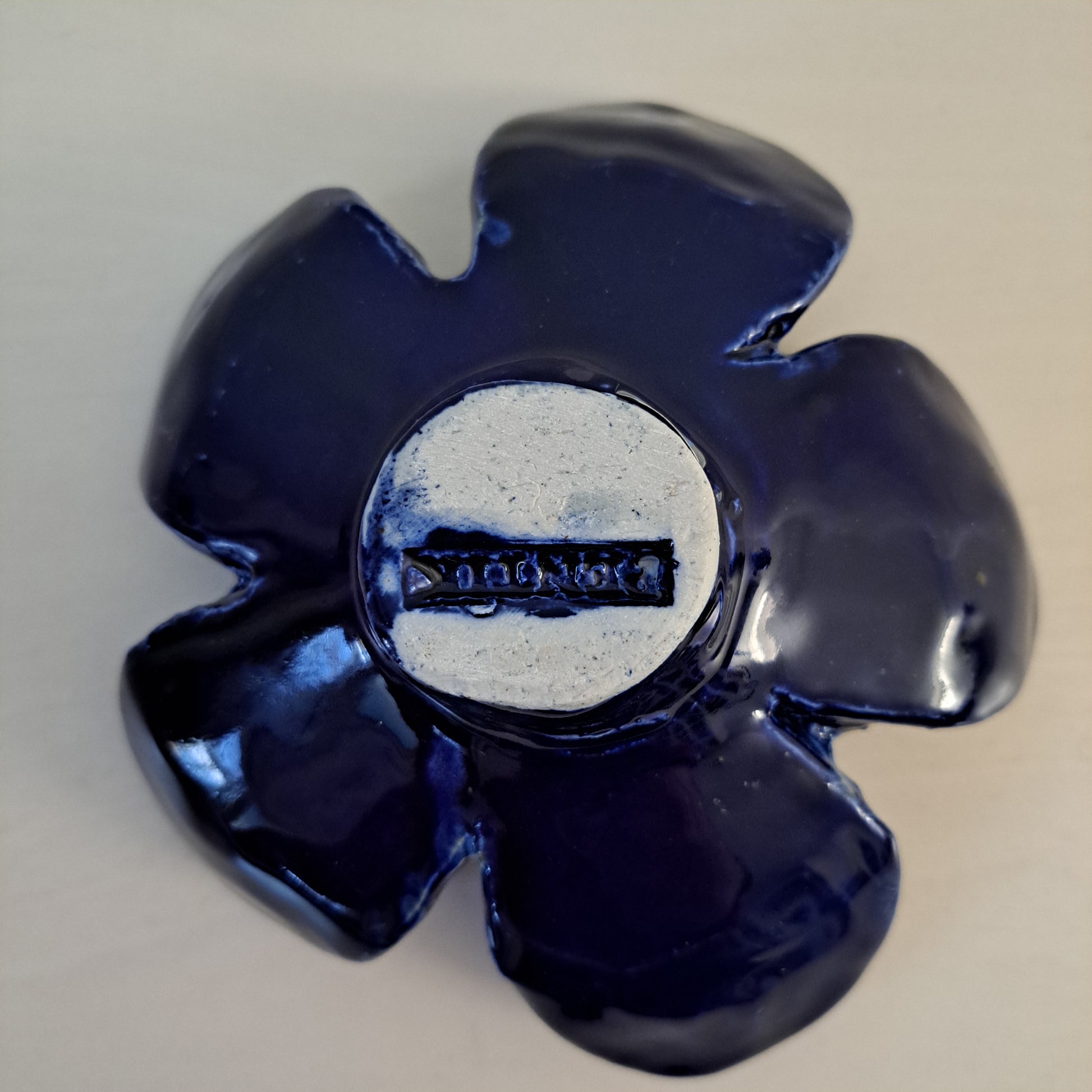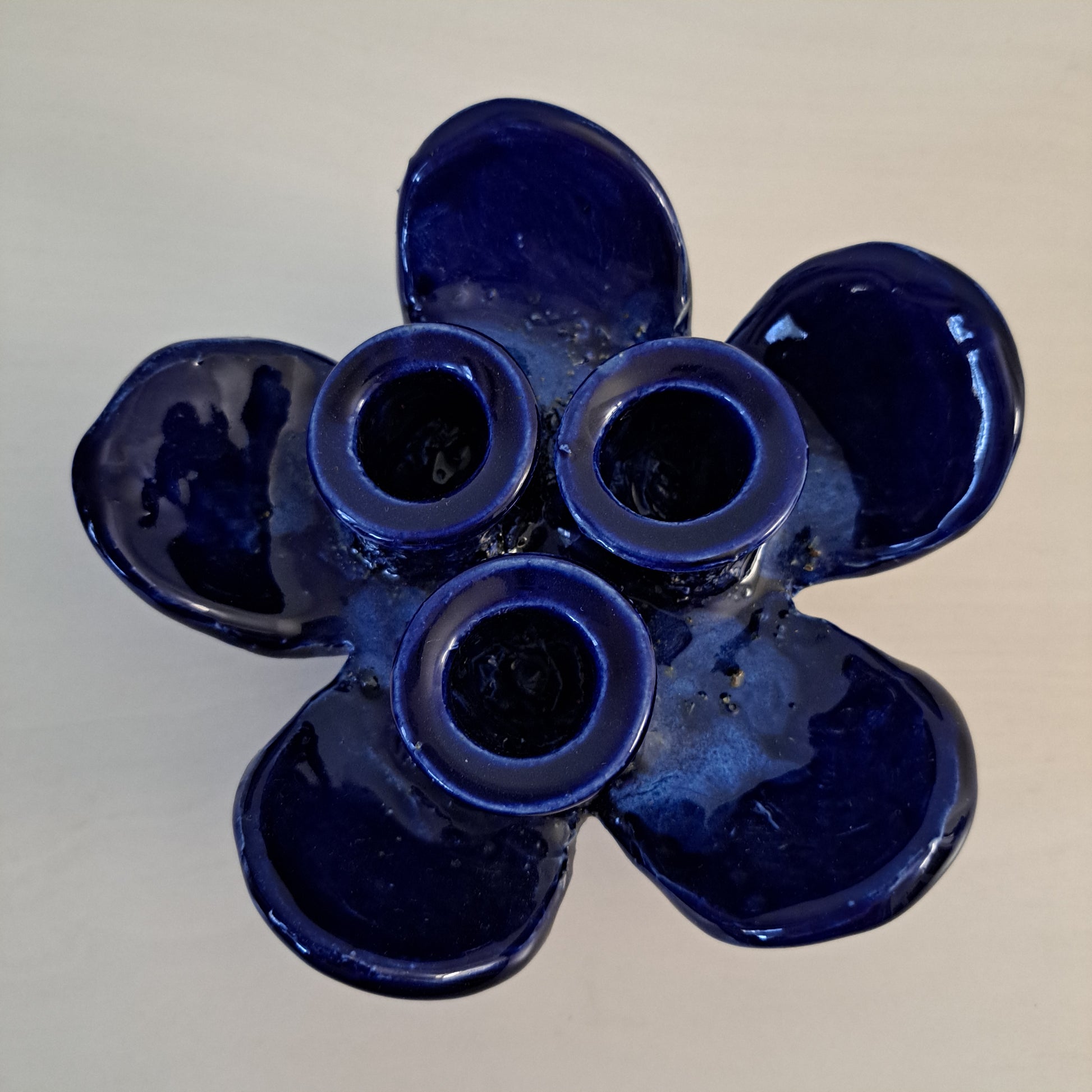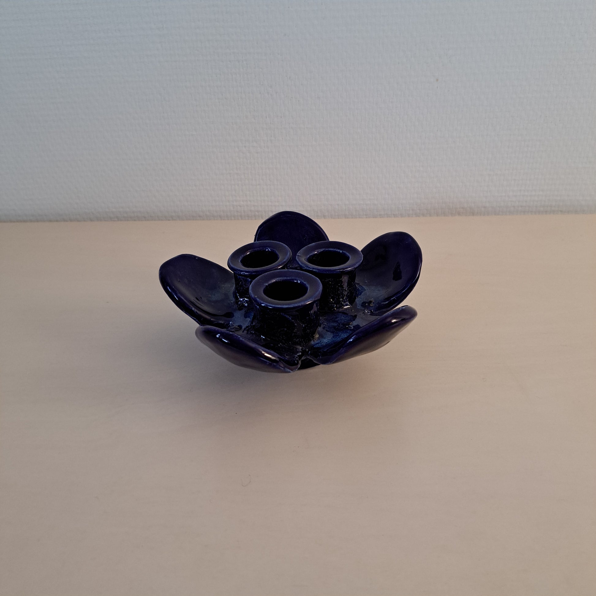 Pentikin kynttilänjalka kolmelle kynttilälle tummansinisestä keramiikasta. Kynttilänjalka on 1970-luvulta, alkuperätarra tallella.