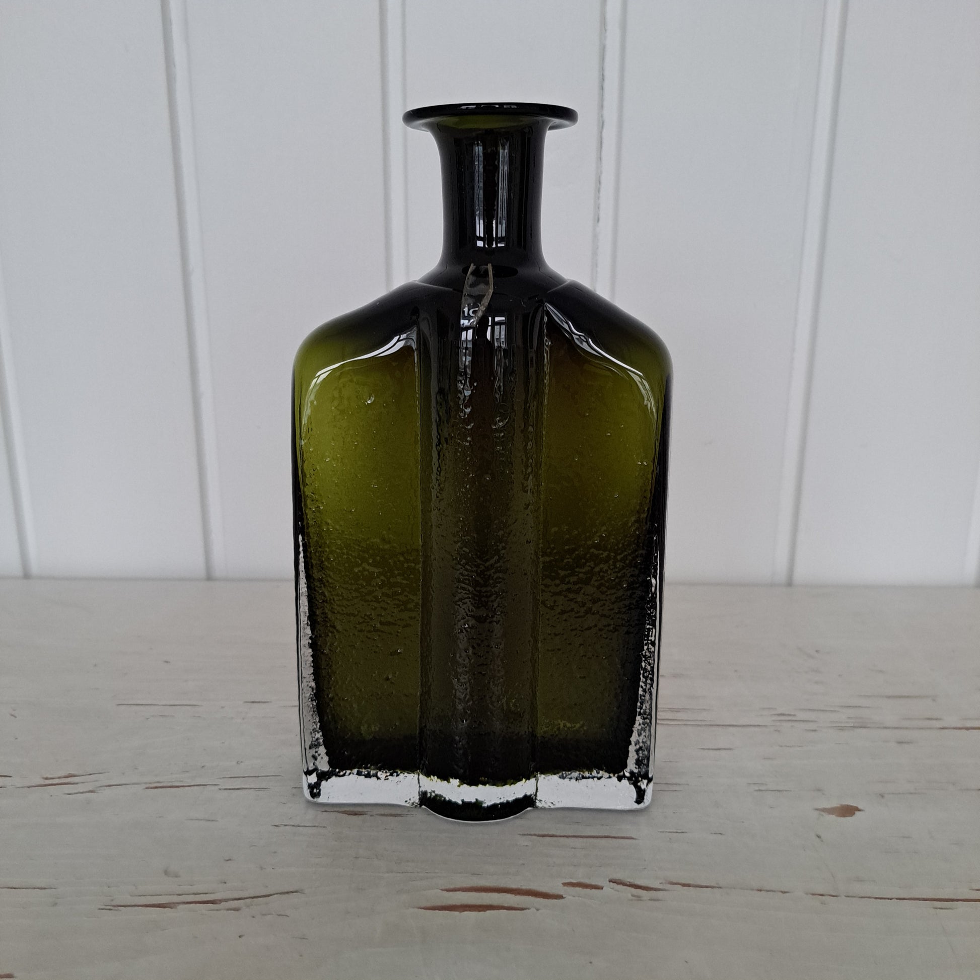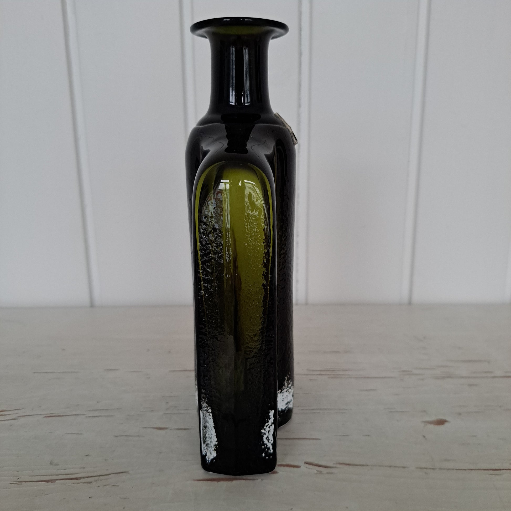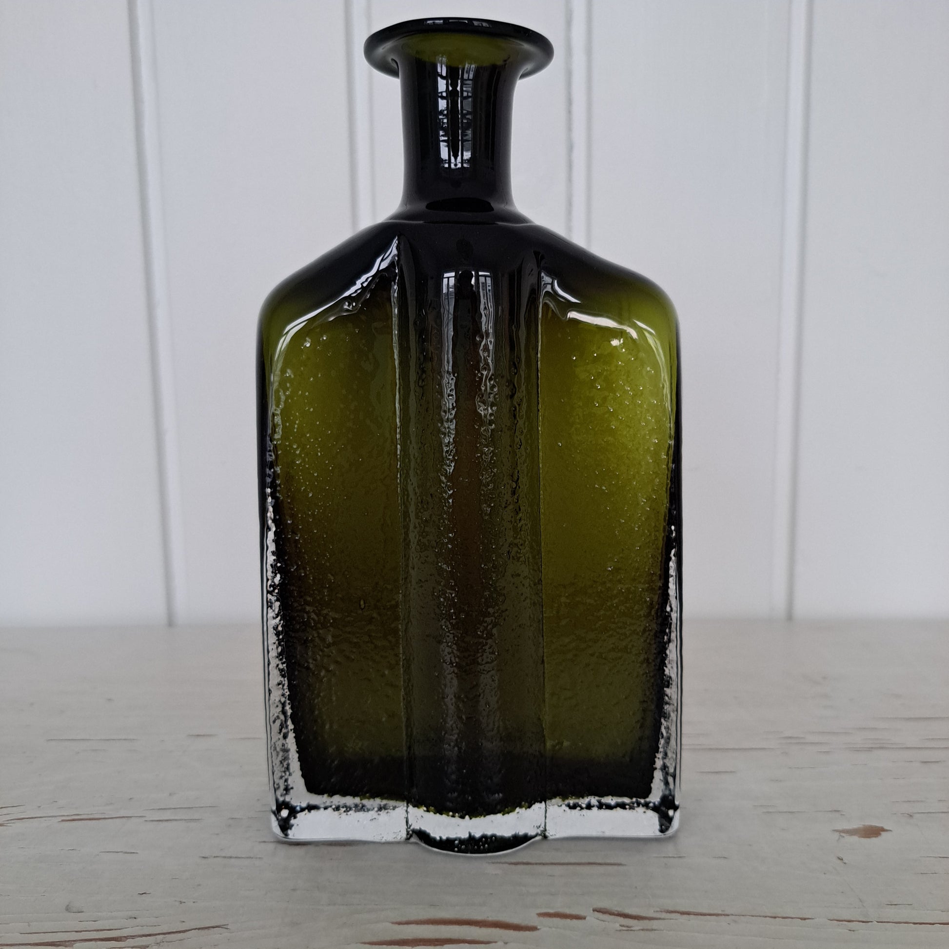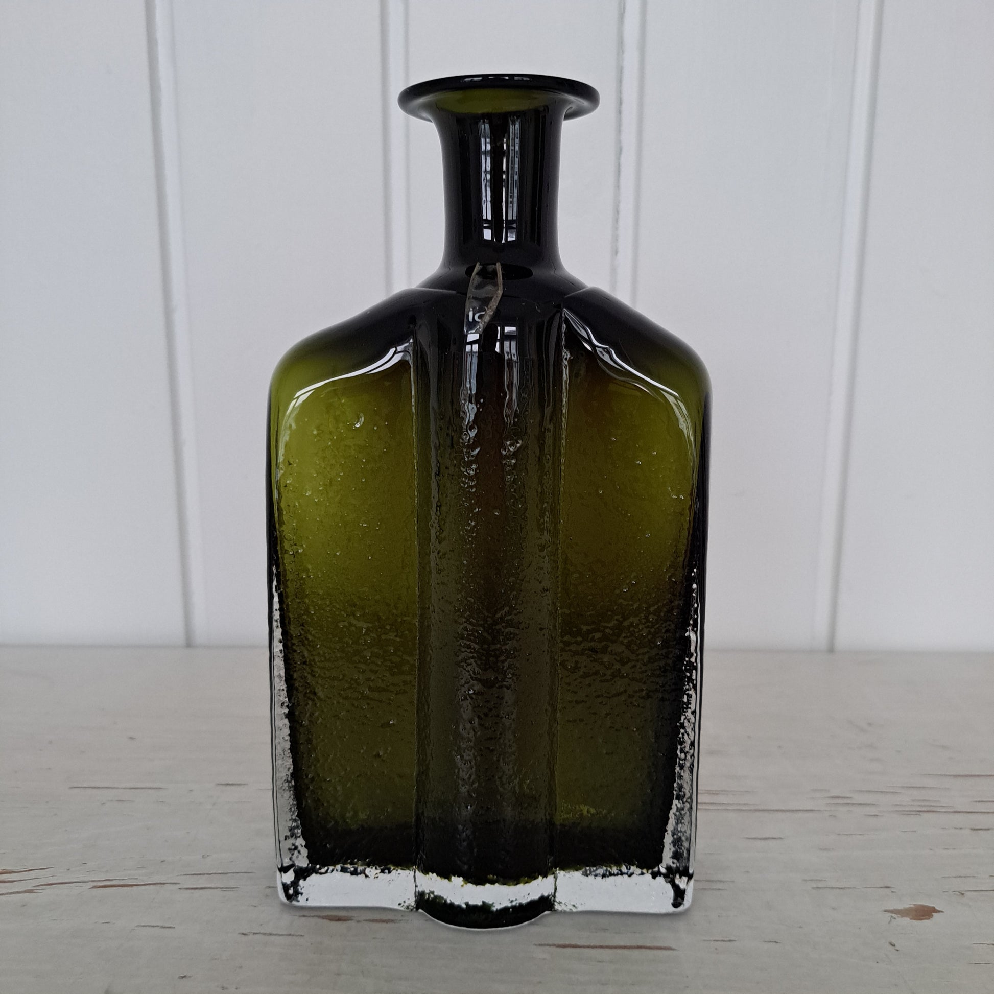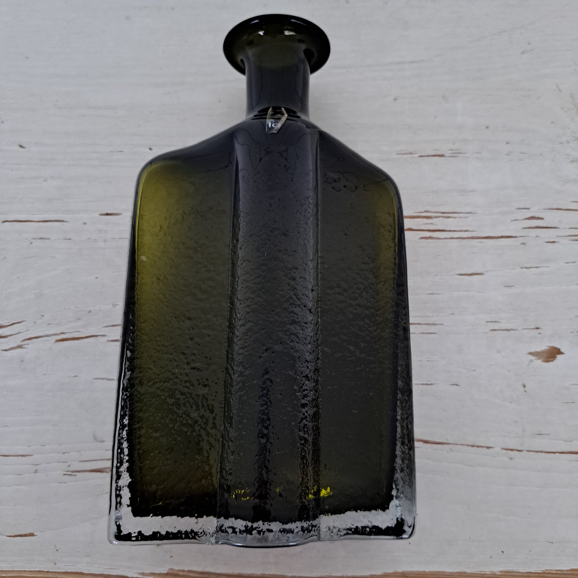 Riihimäen lasin valmistama ja Nanny Stillin suunnittelema jykevä ja ryhdikäs Railo koristepullo. Pullo on tummanvihreä ja väritys muuttuu pohjan kirkkaan vihreästä yläosan tumman vihreäksi.