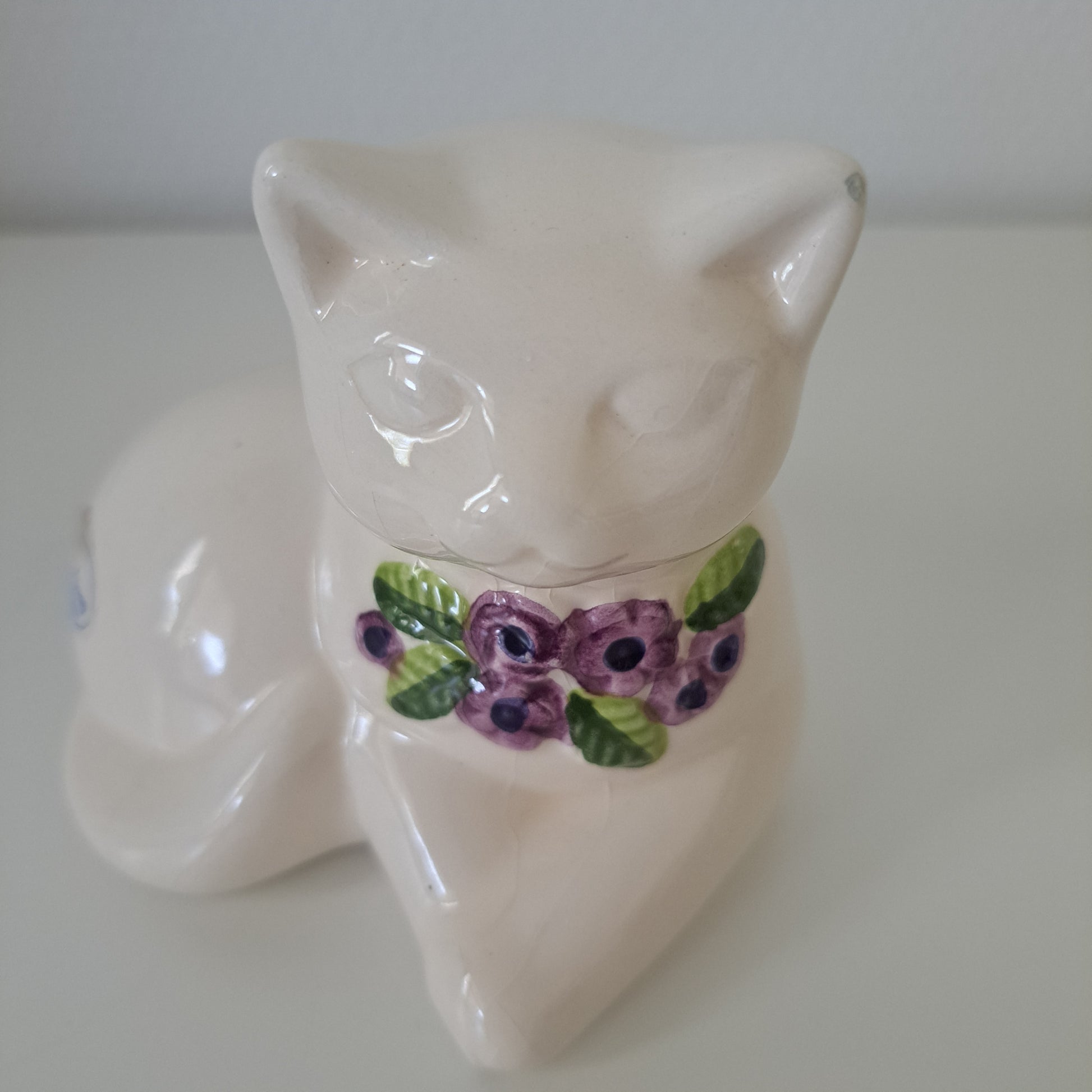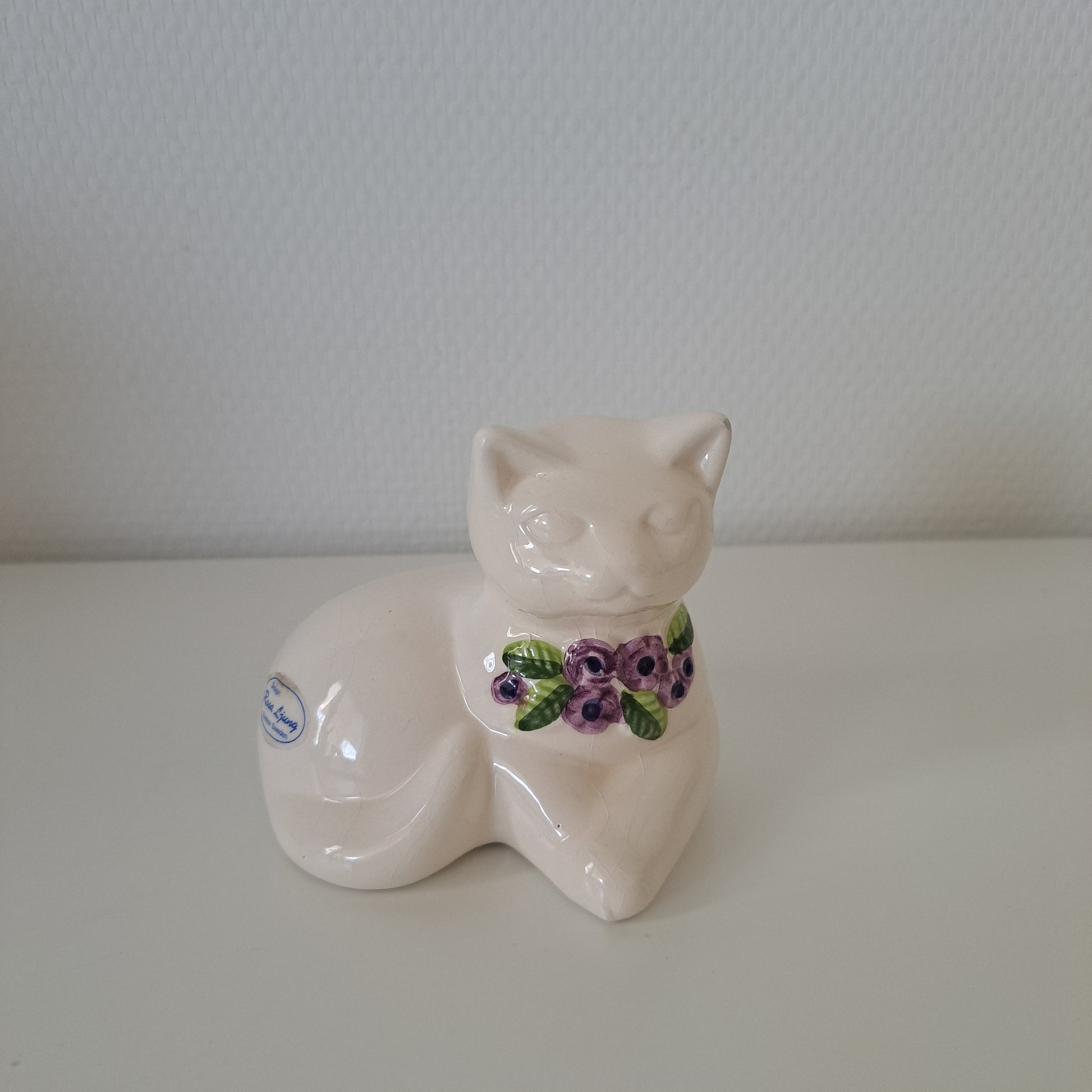 Ruotsalaisen Rosa Ljungin suunnittelema viehättävä vintage kissafiguuri. Kissalla tutut, sinililat, käsinmaalatut kukkakuviota. Valmistajana Deco Keramik, Helsingborg.