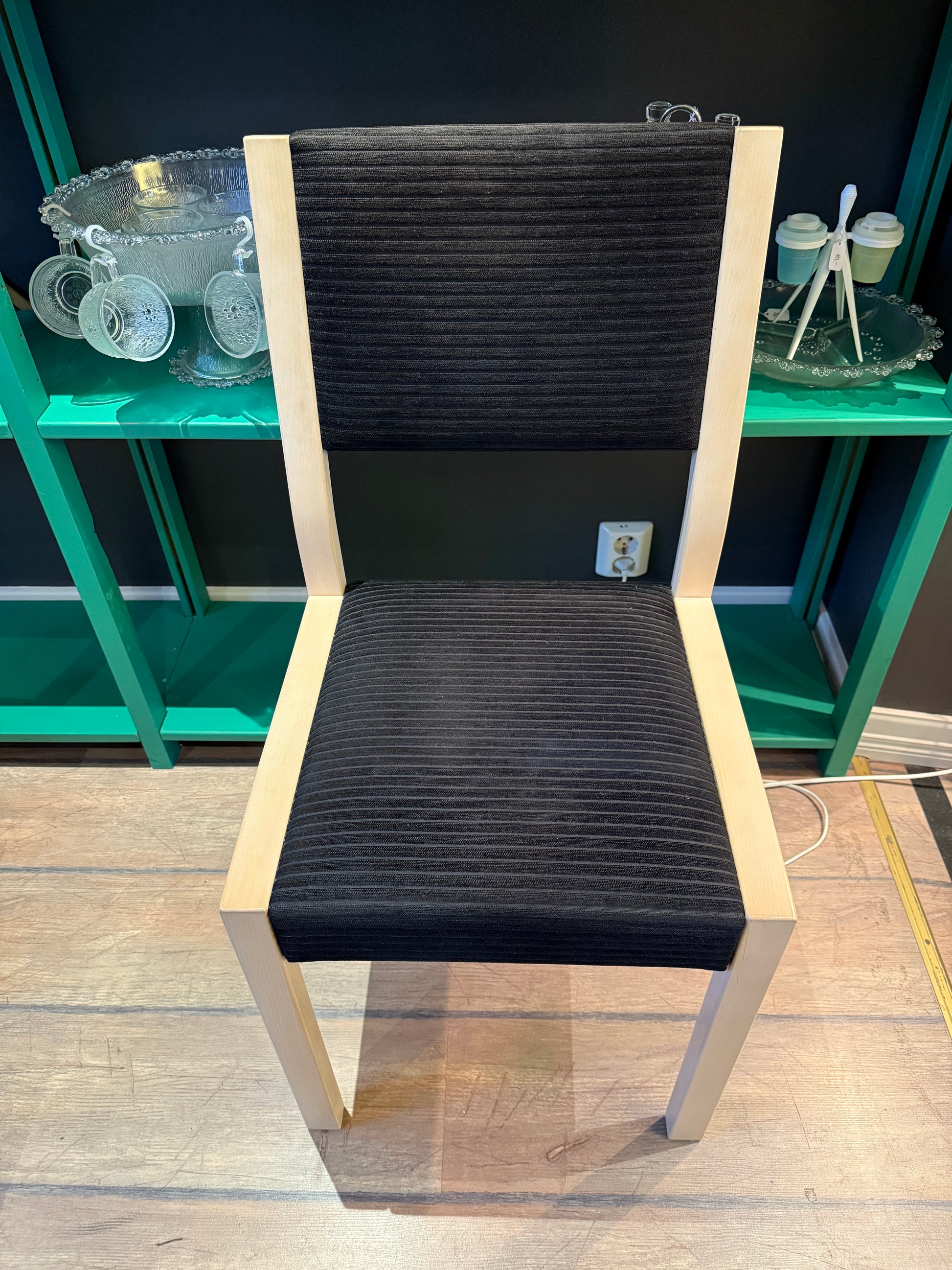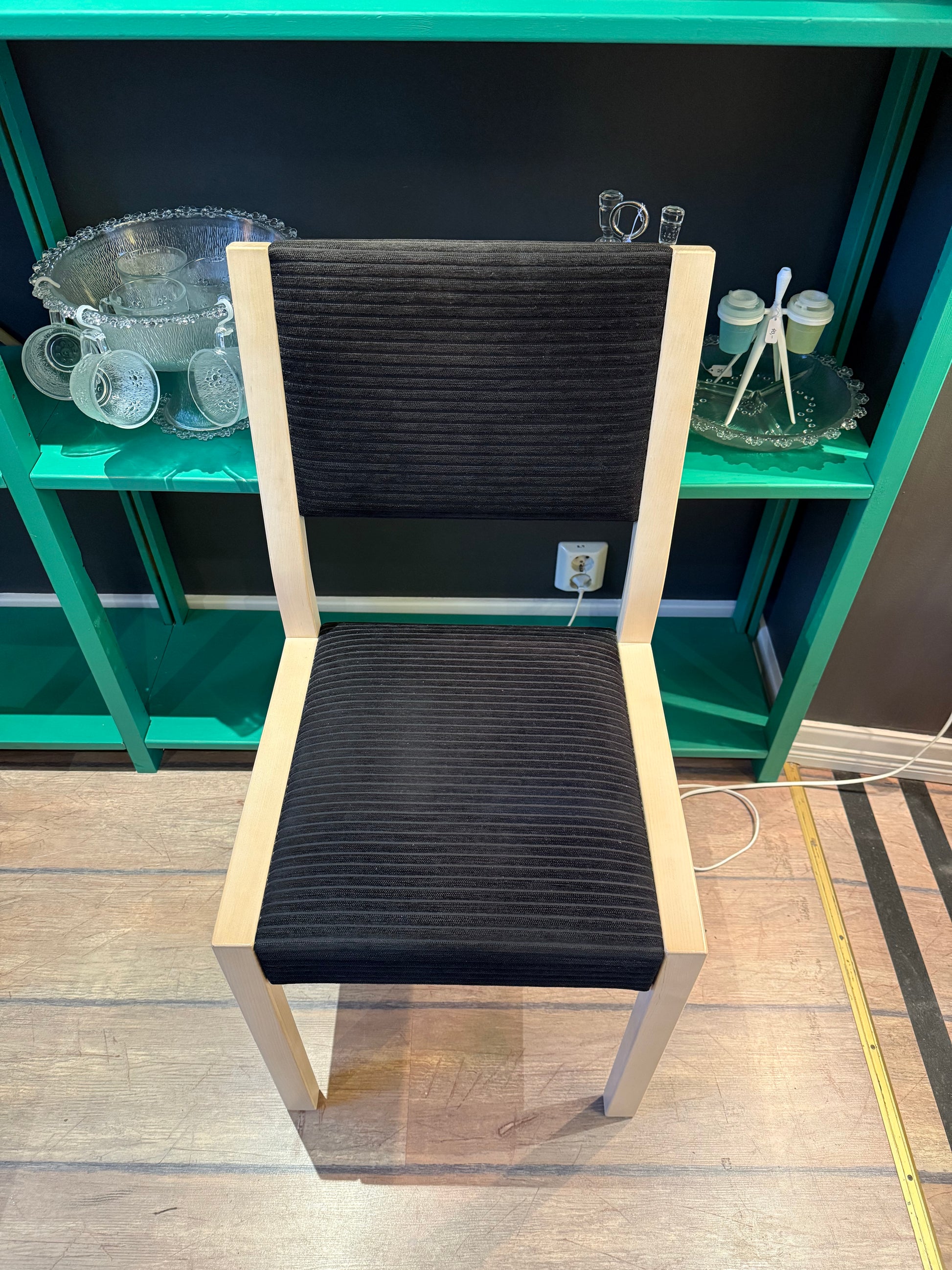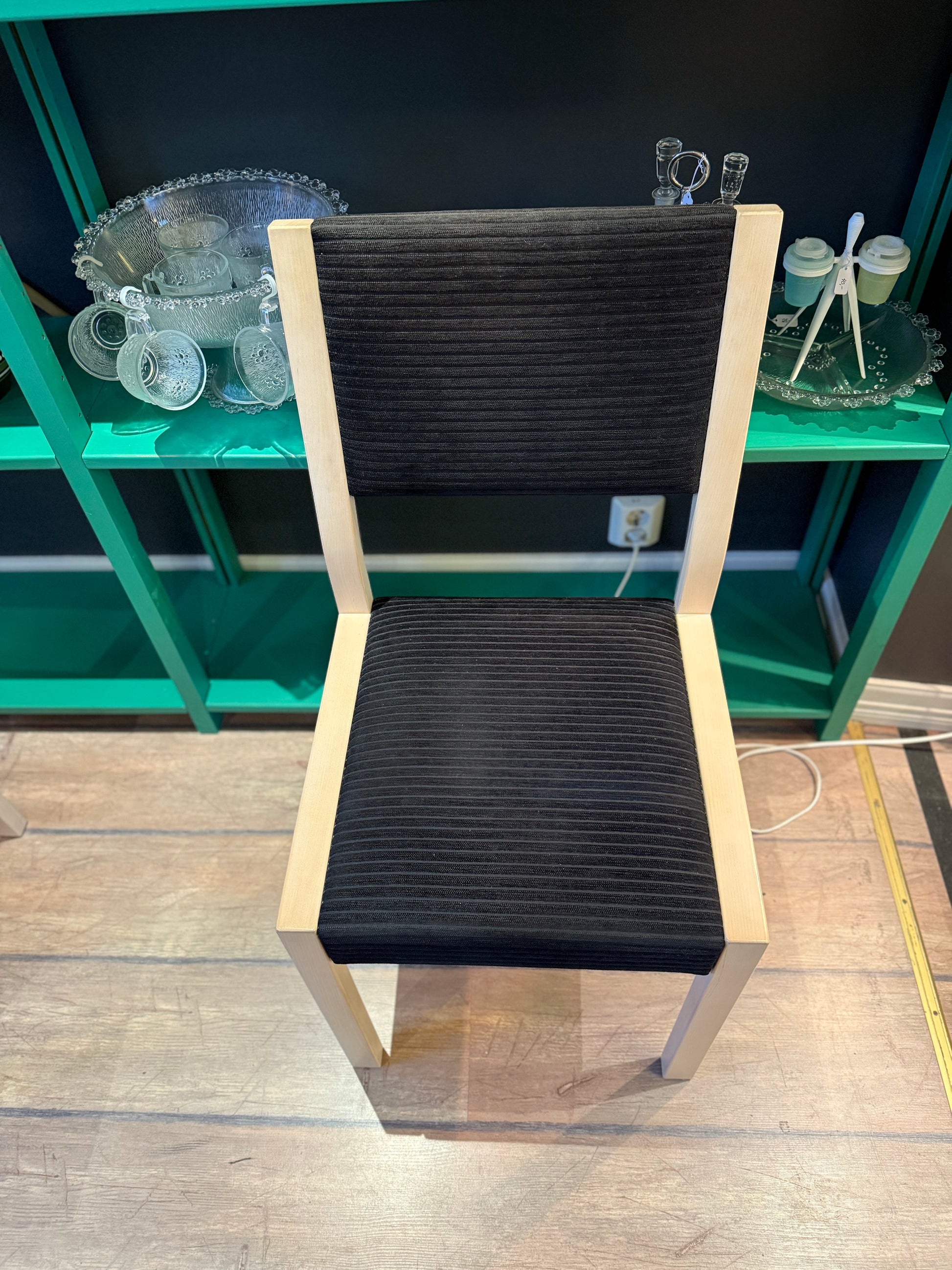 Upeat ja ryhdikkäät, Artek-tyyliset ruokapöydän tuolit. Verhoilu on tyylikäs, musta sametti, jossa on vaakaraidoitus. Puuosat ovat vaaleat.