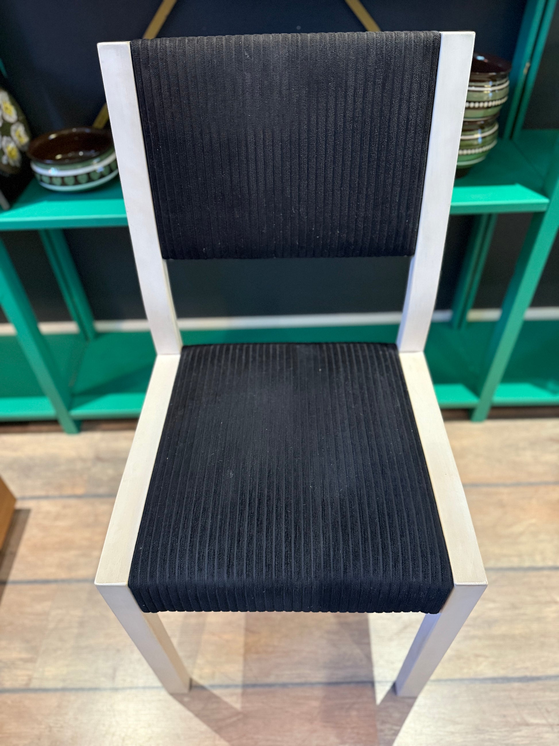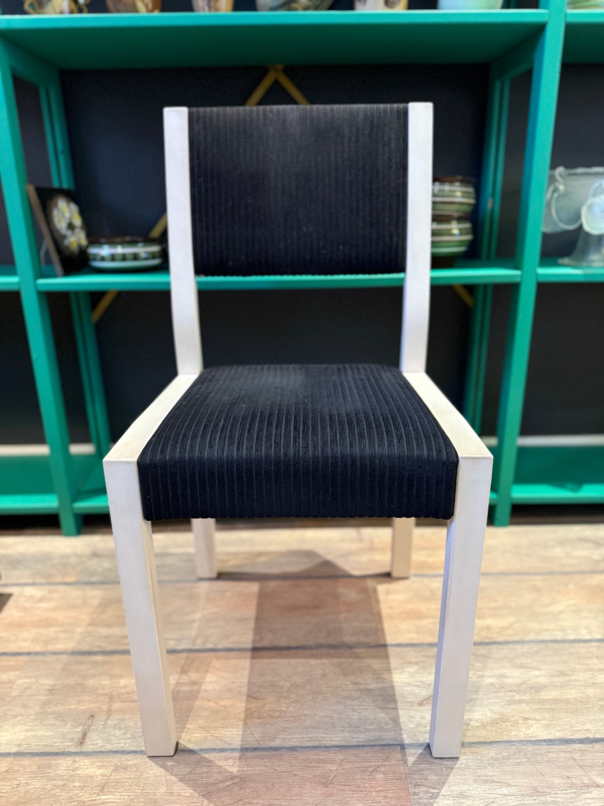 Upeat ja ryhdikkäät, Artek-tyyliset ruokapöydän tuolit. Verhoilu on tyylikäs, musta sametti, jossa on pystyraidoitus. Puuosat ovat vaaleat!