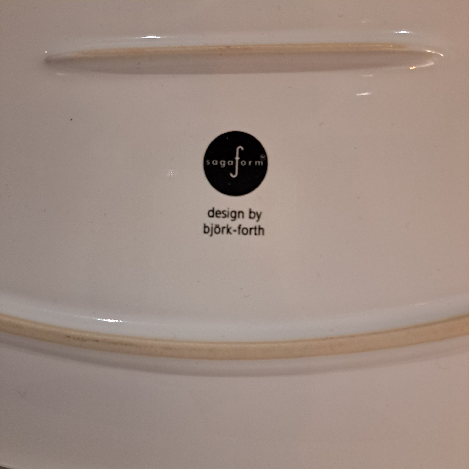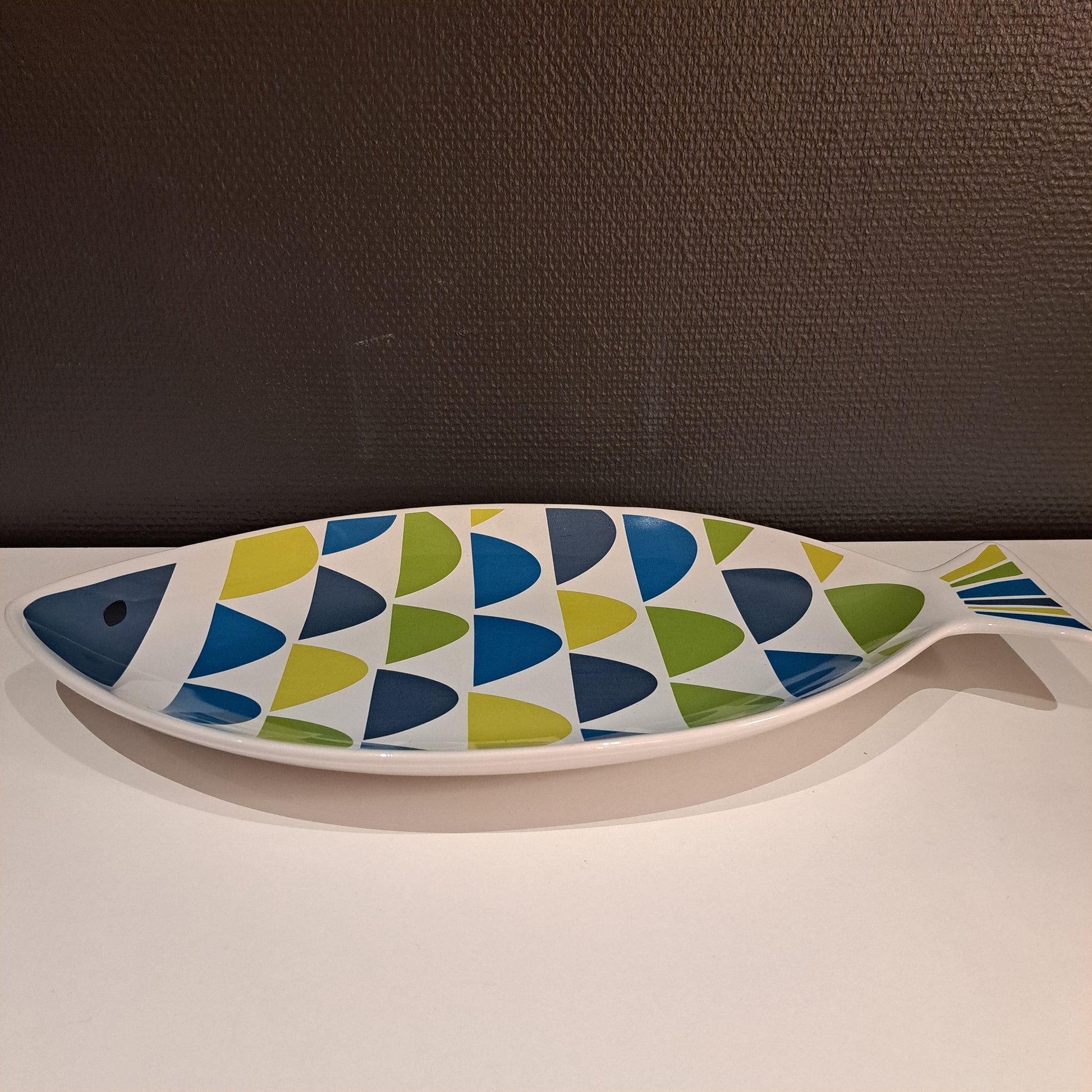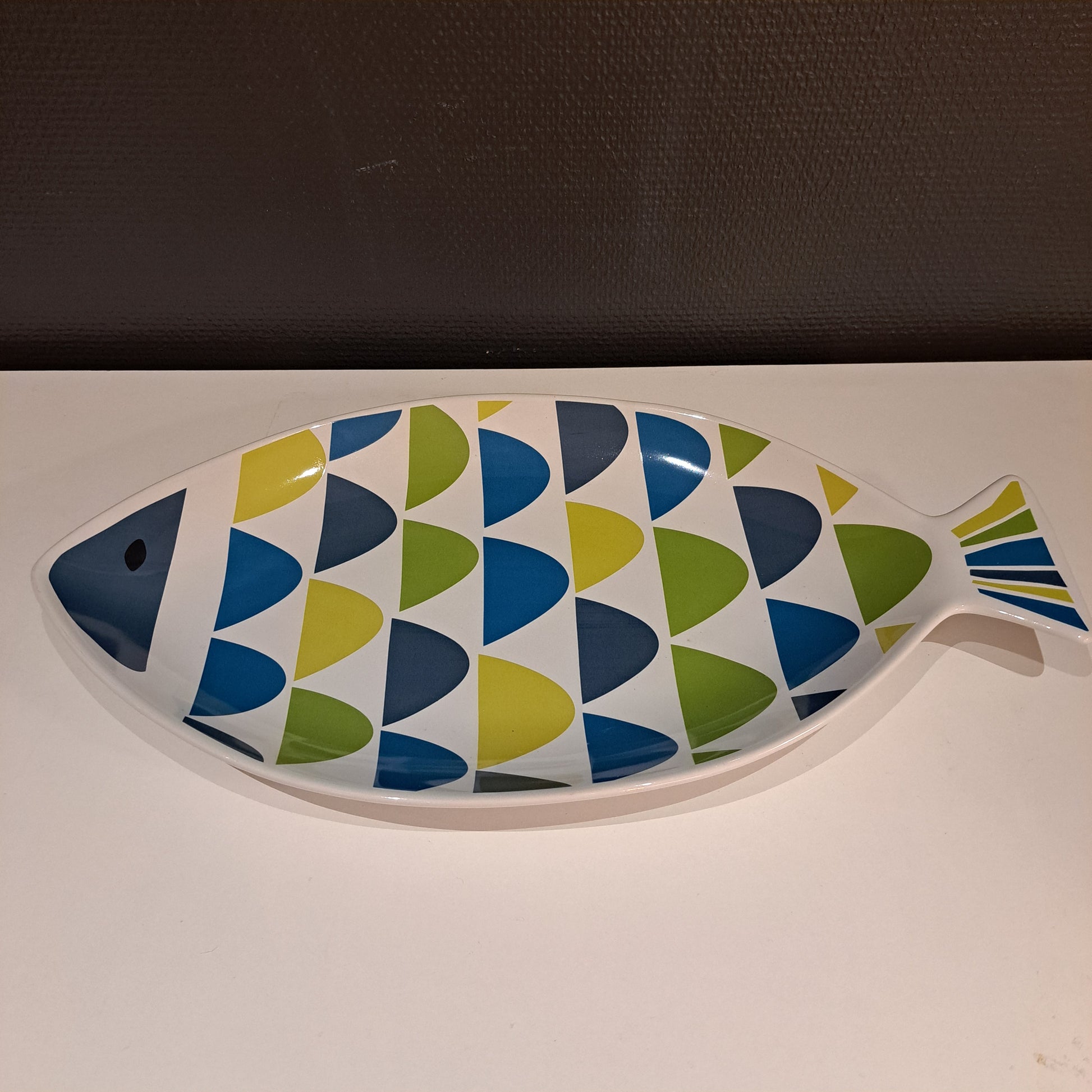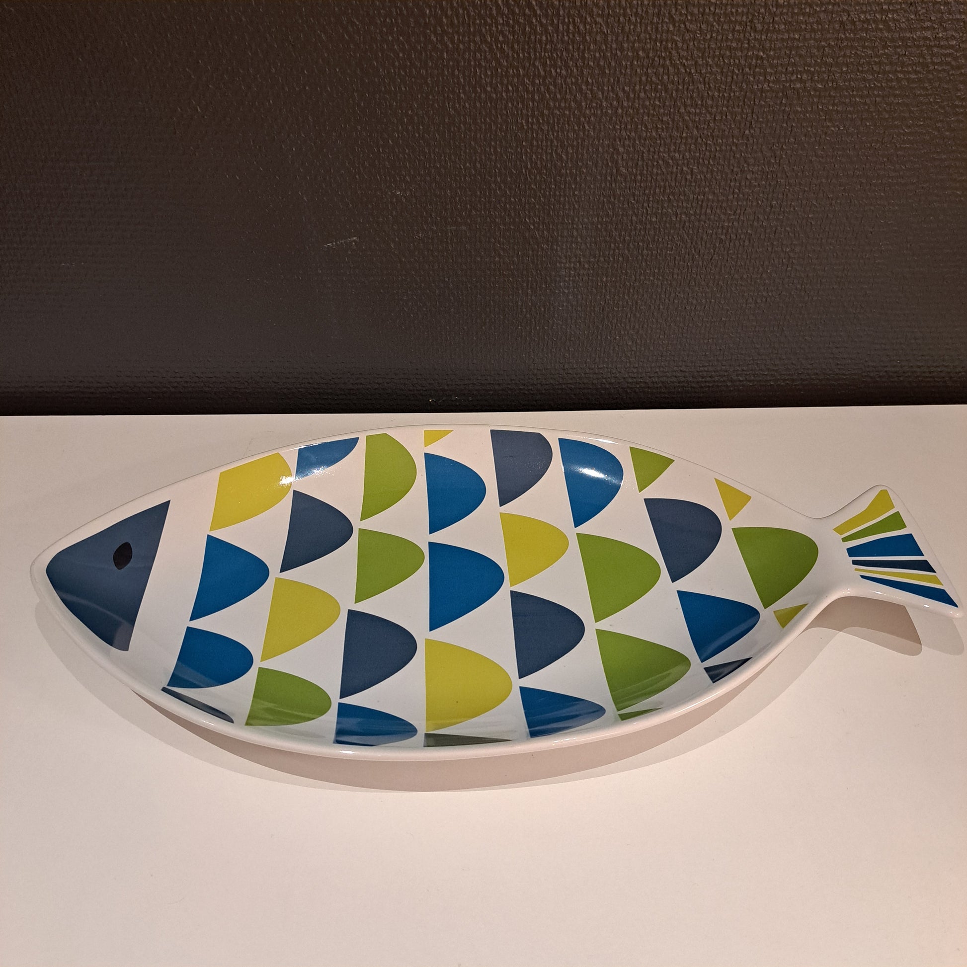Kalan muotoinen, kaunis tarjoiluastia, joka on väriltään valkoinen, sisäpuolella on geometrinen kuviointi sinisen, vihreän ja keltaisen sävyissä, muistuttaen kalansuomuja. Suunnitelija Björk-Forth.