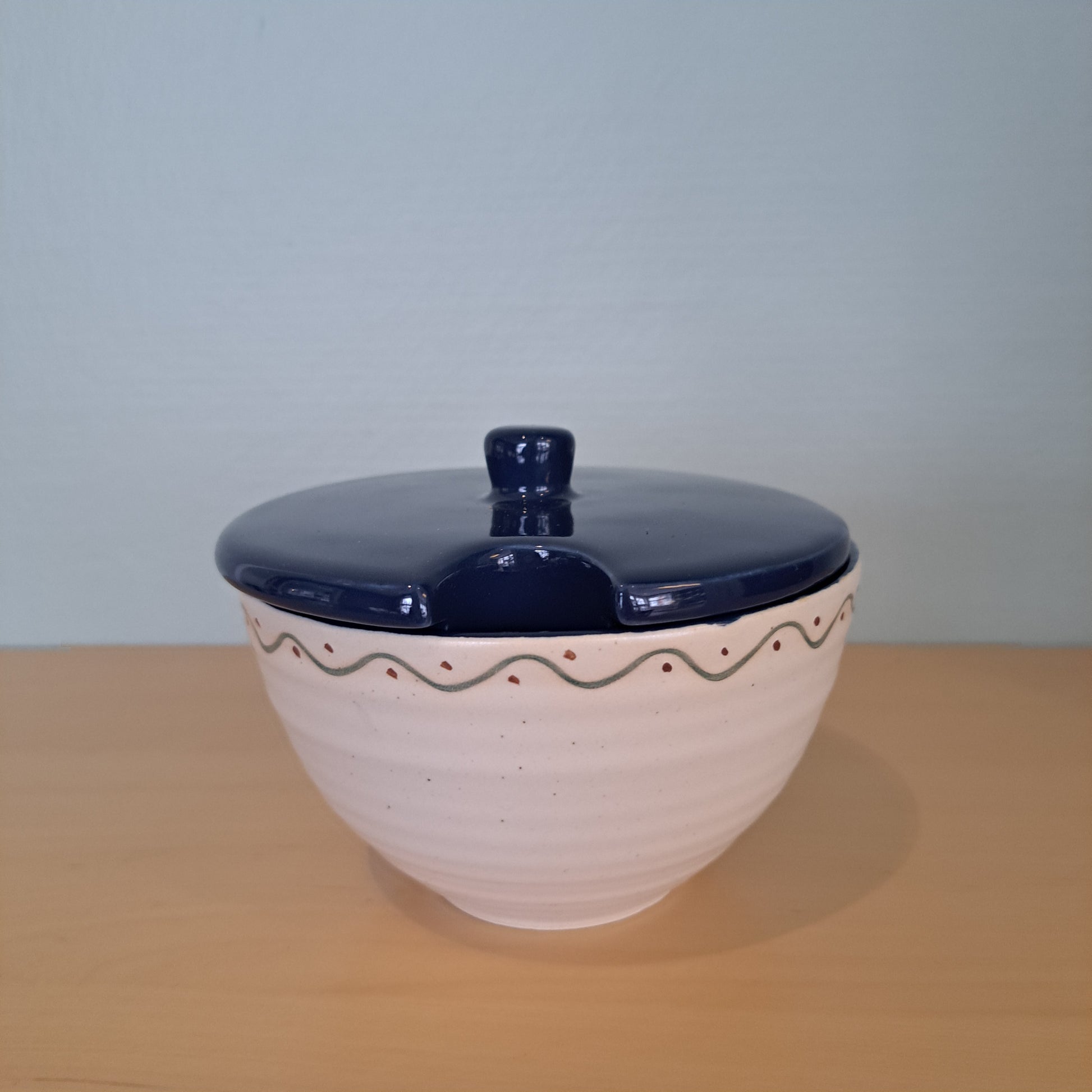 Ruotsalaisen Sagaformin raikas, kannellinen purnukka. Purnukan ulkopinta on valkoinen ja kansi sekä sisäpinta ovat tummansinisiä. Kiva purnukka esim. hillojen tarjoiluun.