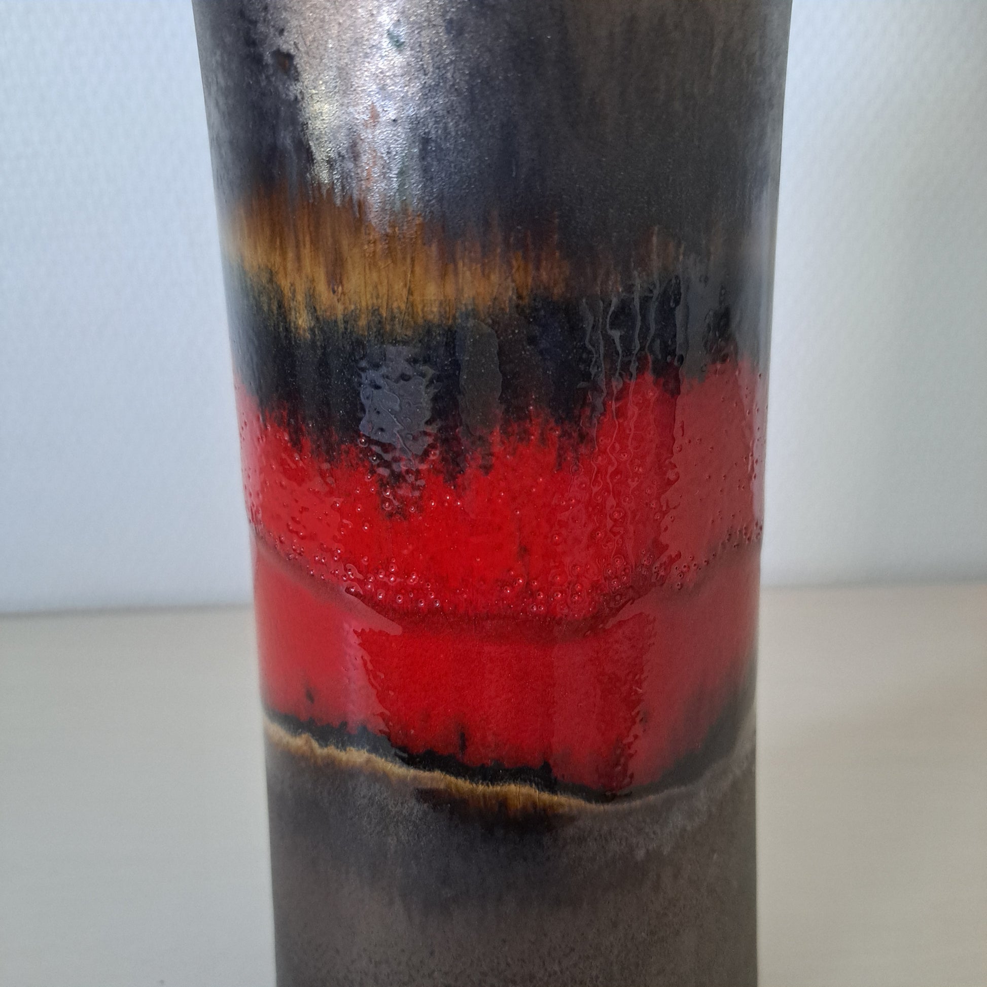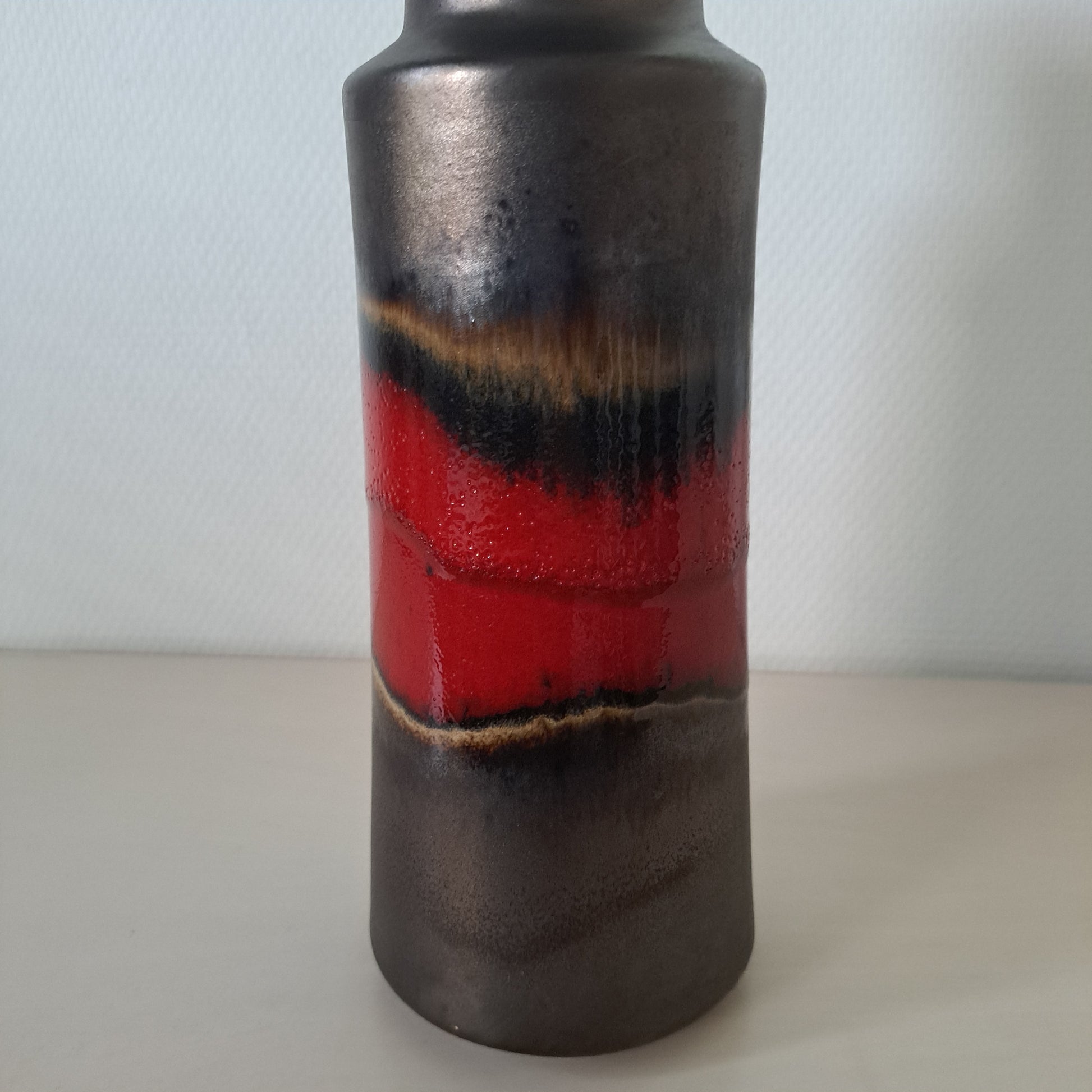 Saksalaisen Scheurich Keramikin 1960-luvulla valmistama upea lattiavaasi, jonka väritys tuo mieleen revontulet. Tummalla pohjalla leiskuvat punaiset, aaltomaiset raidat, joiden lasitus välkehtii valonsäteen niihin osuessa.