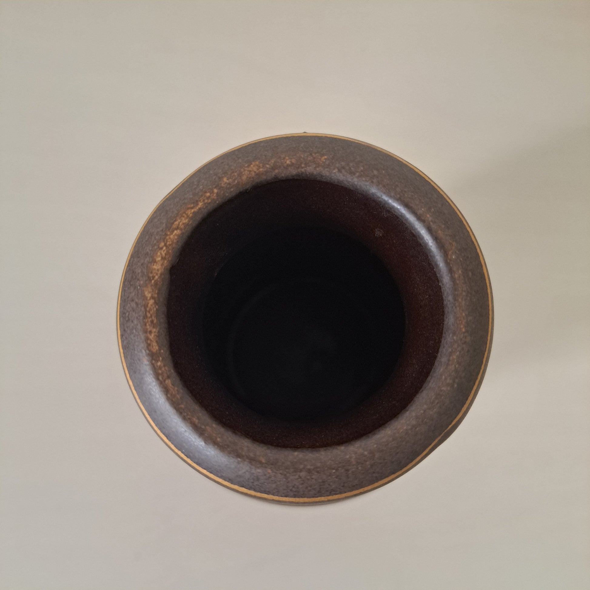 Saksalaisen Scheurich Keramikin 1980-luvulla valmistama tyylikkään hienostunut maljakko, jossa tumman ruskealle pohjalle on maalattu kultaisen puun ääriviivat.