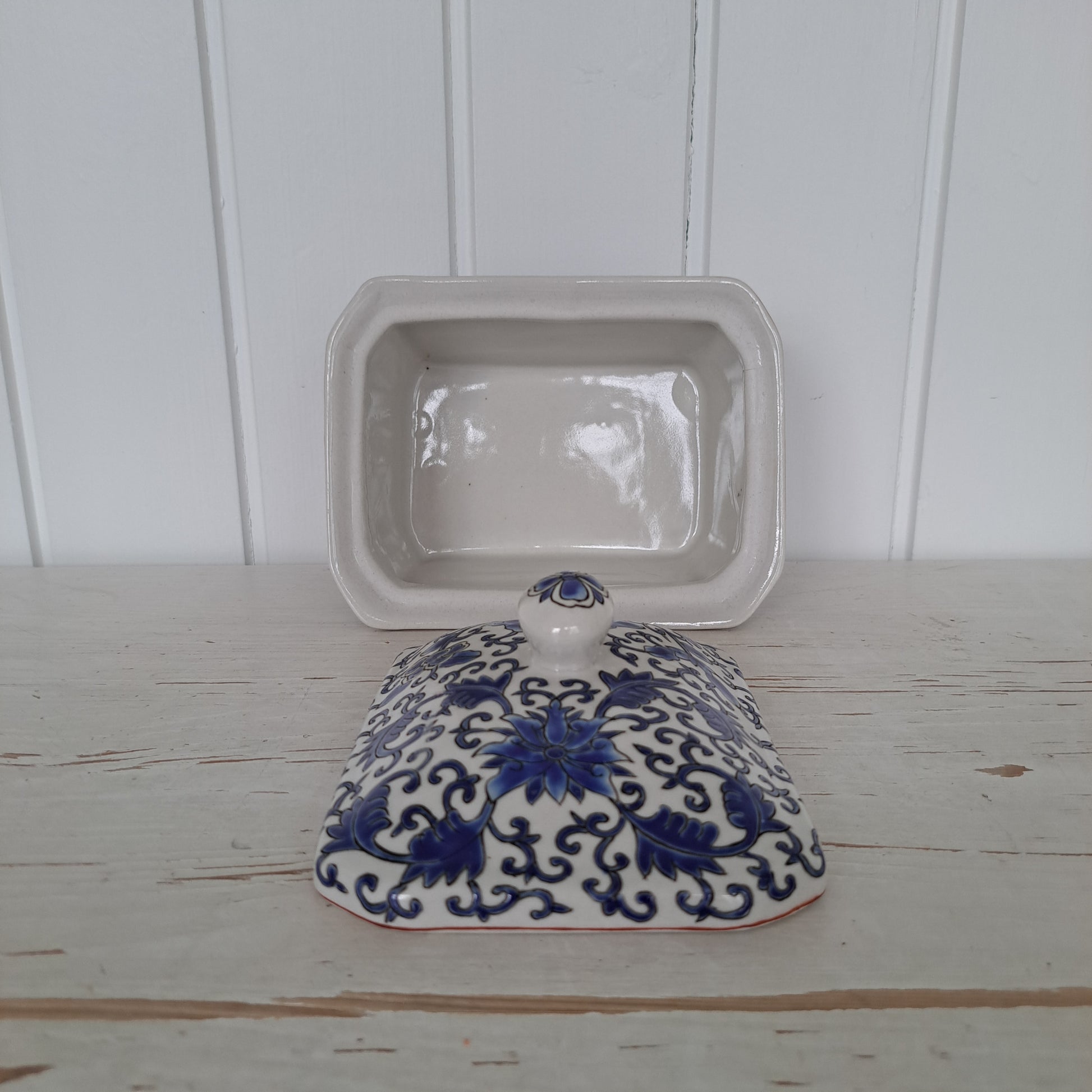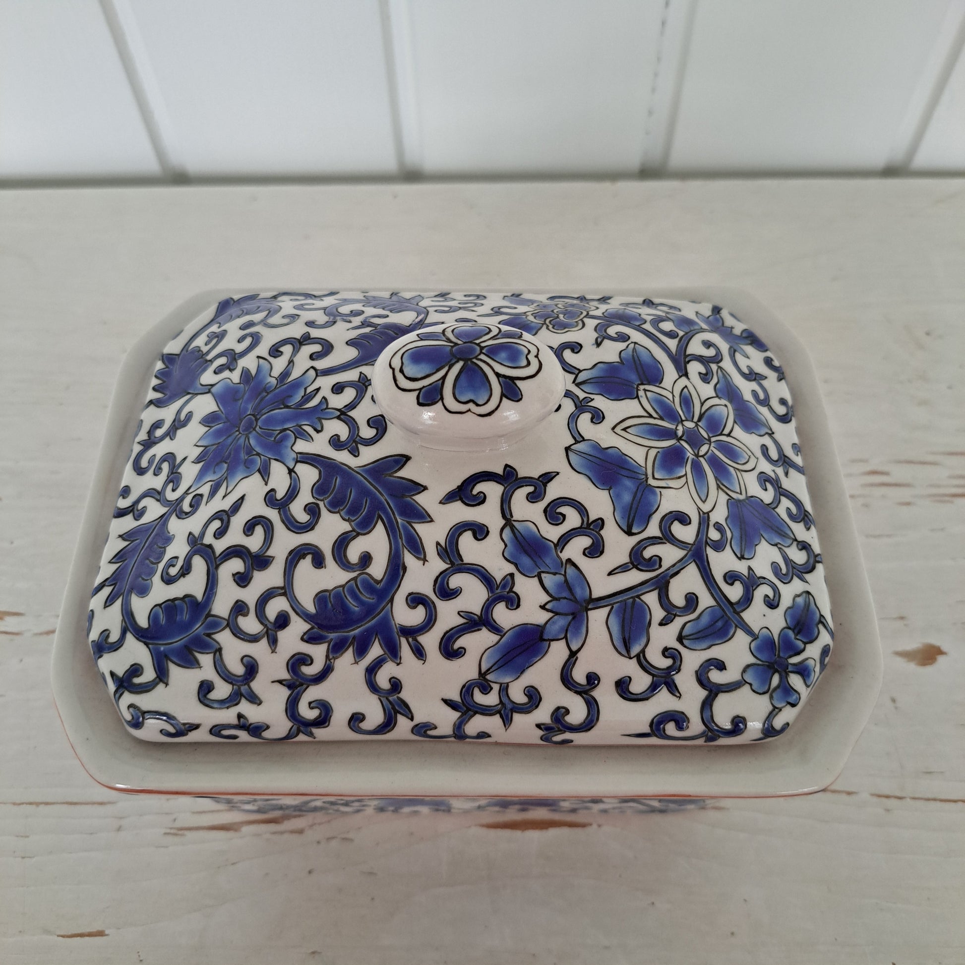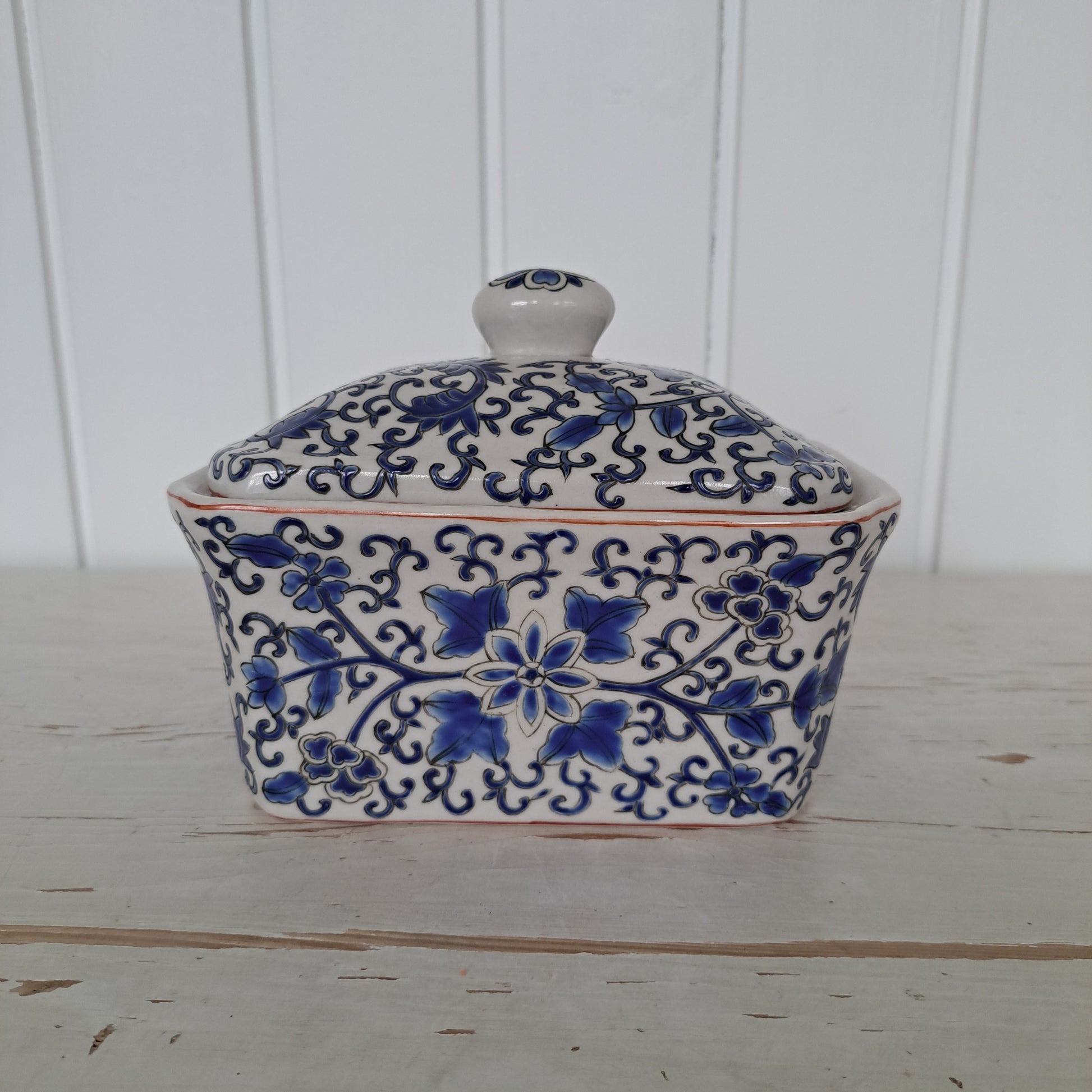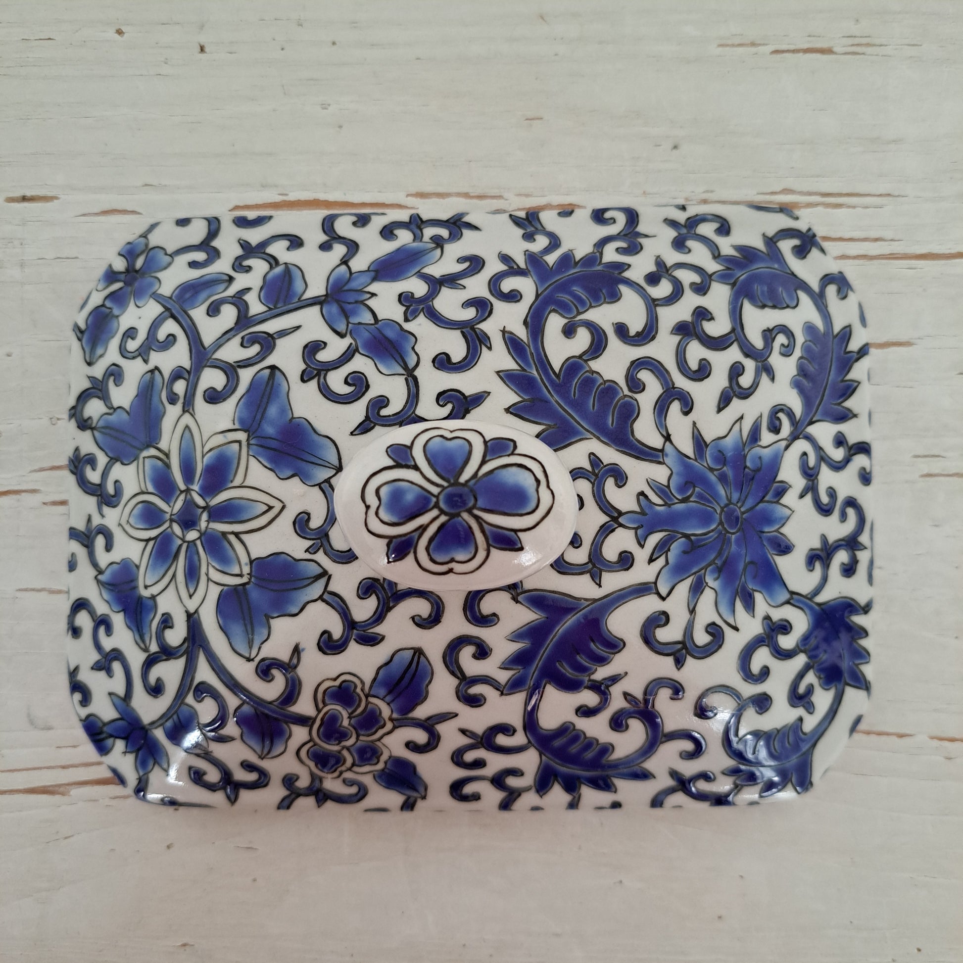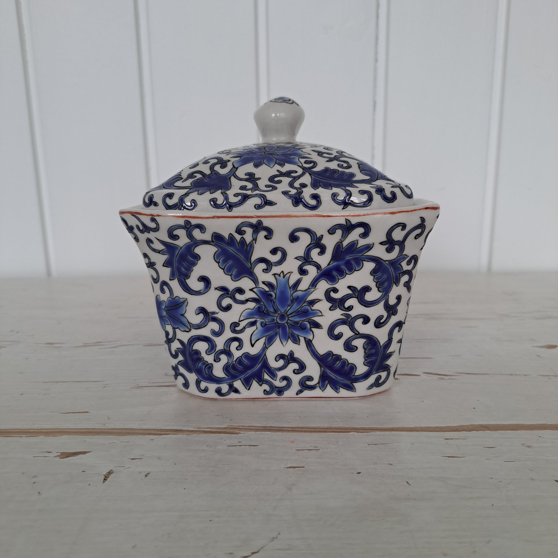 Upea ja ylellisen näköinen kannellinen säilytyspurkki, "potiche". Purkissa on sinisävyinen kukkakuviointija se on valmistettu posliinista.