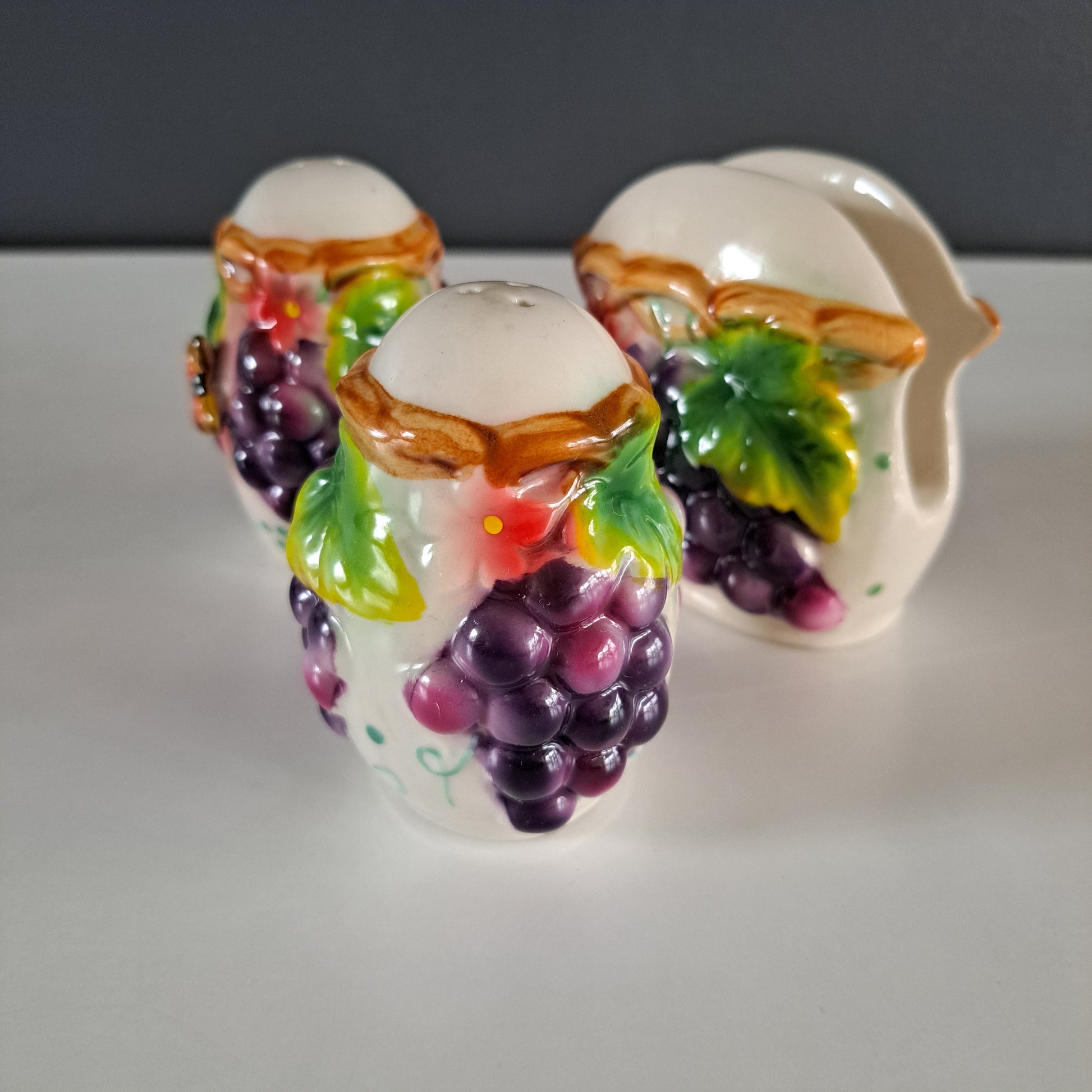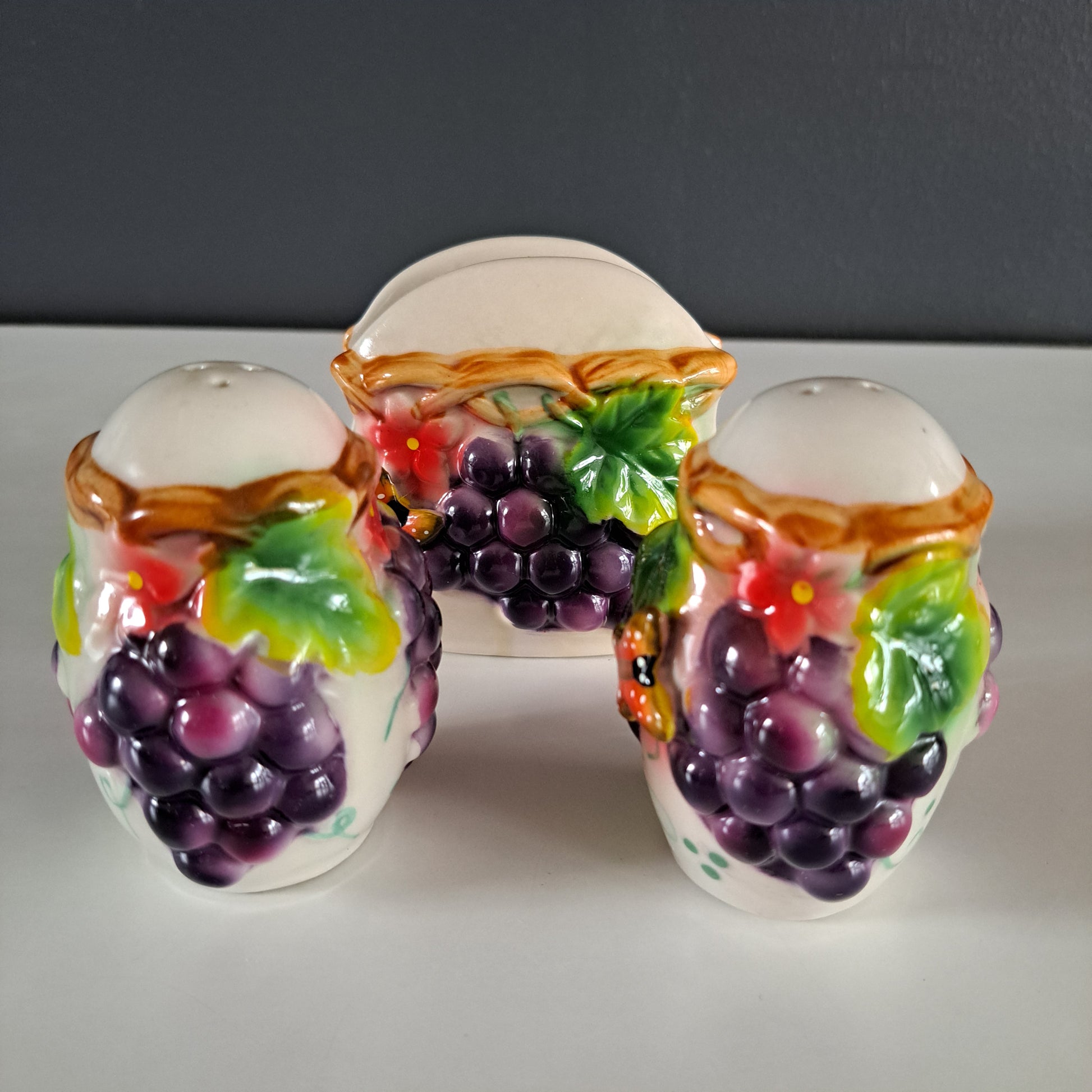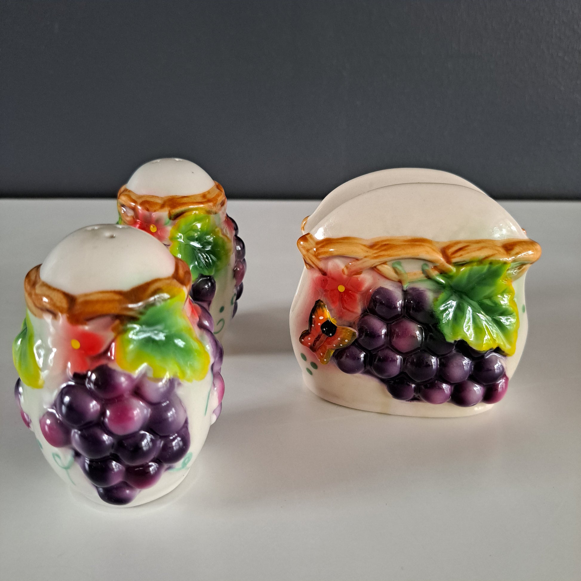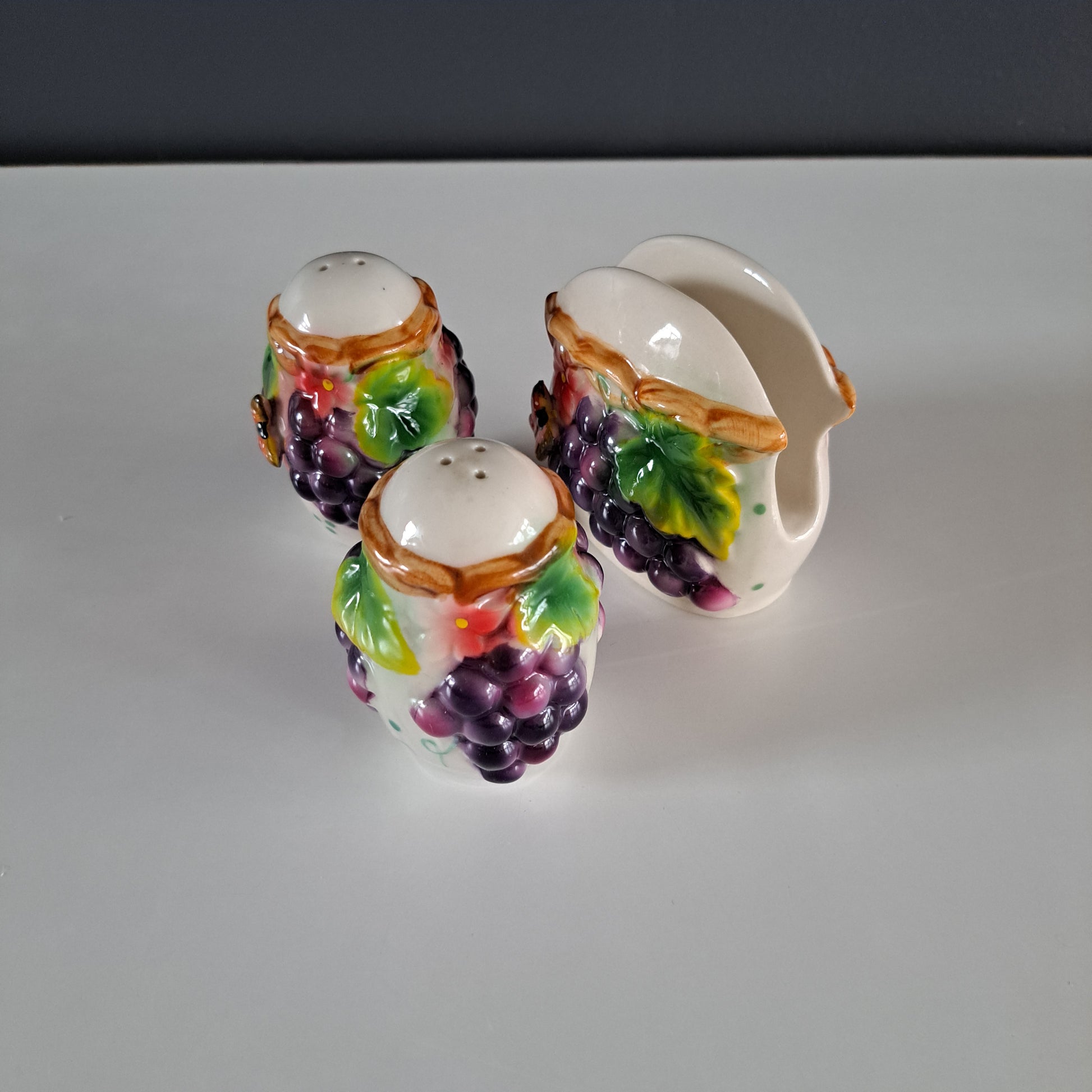 Ihana ja muheva setti, joka koostuu suola- ja pippurisirottimista sekä serviettitelineestä. Yhdistävänä tekijänä on muhevat viinirypäleet, jotka koristavat jokaista tuotetta. Sirottimien muotoilu on erittäin onnistunut; ne istuvat käteen kuin hansikas!