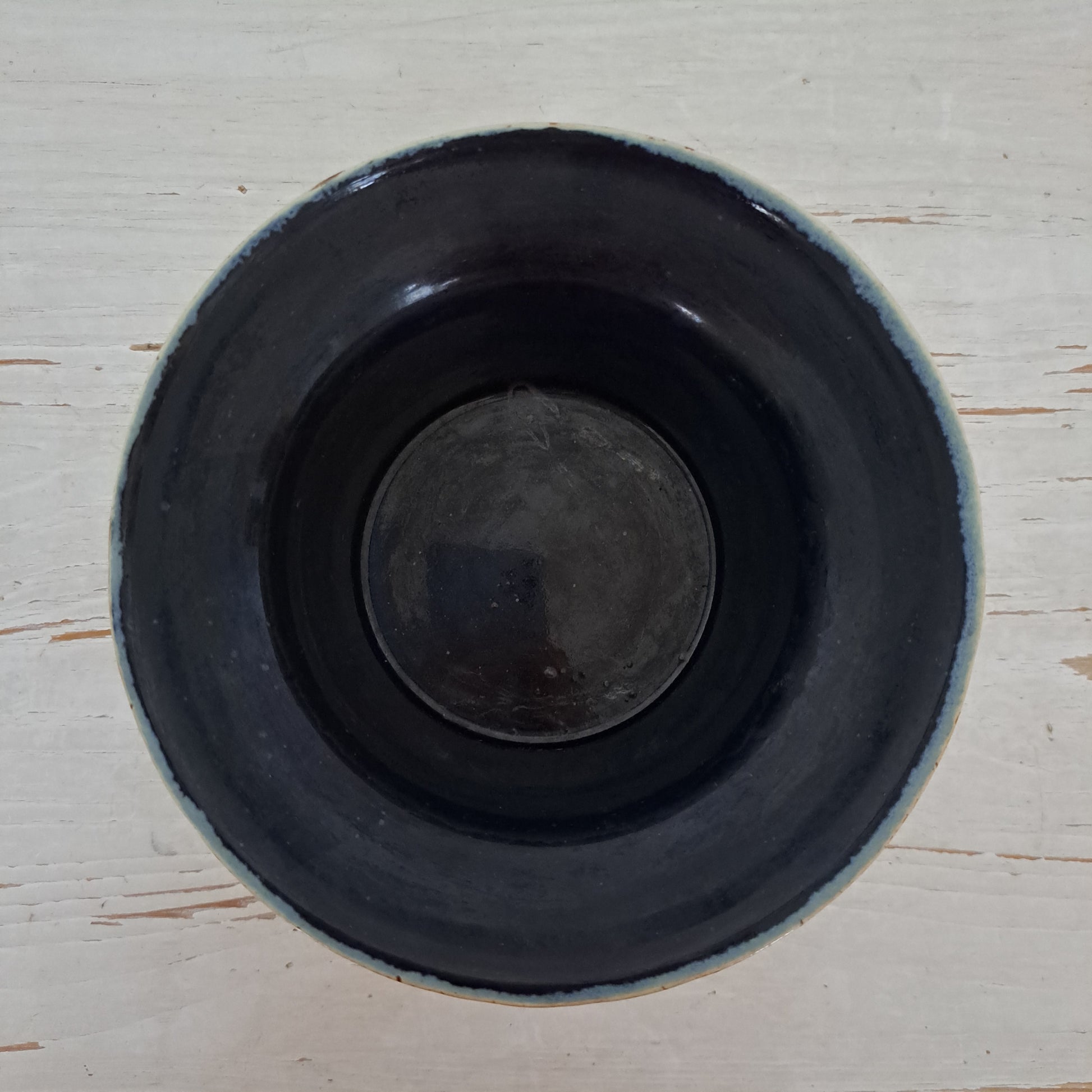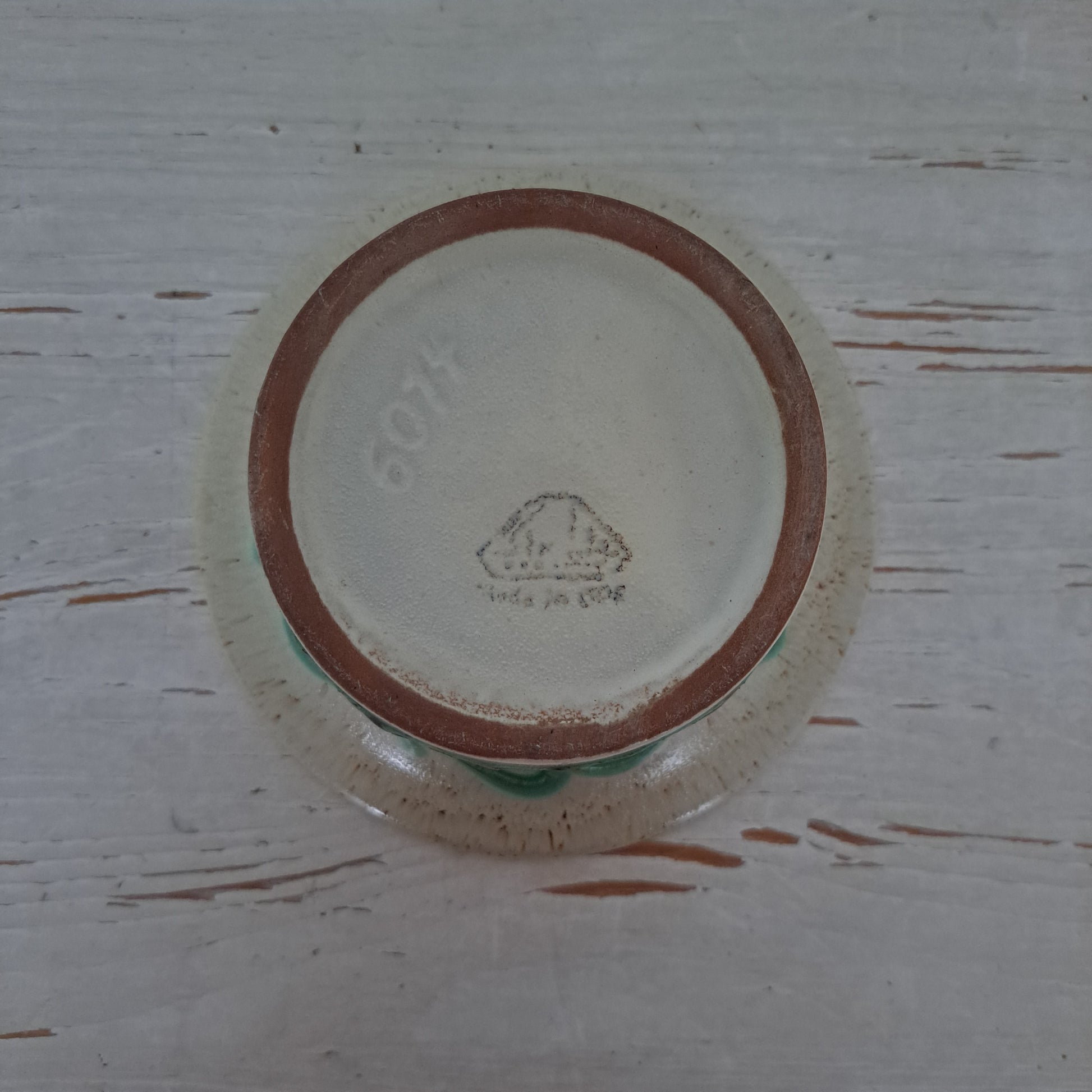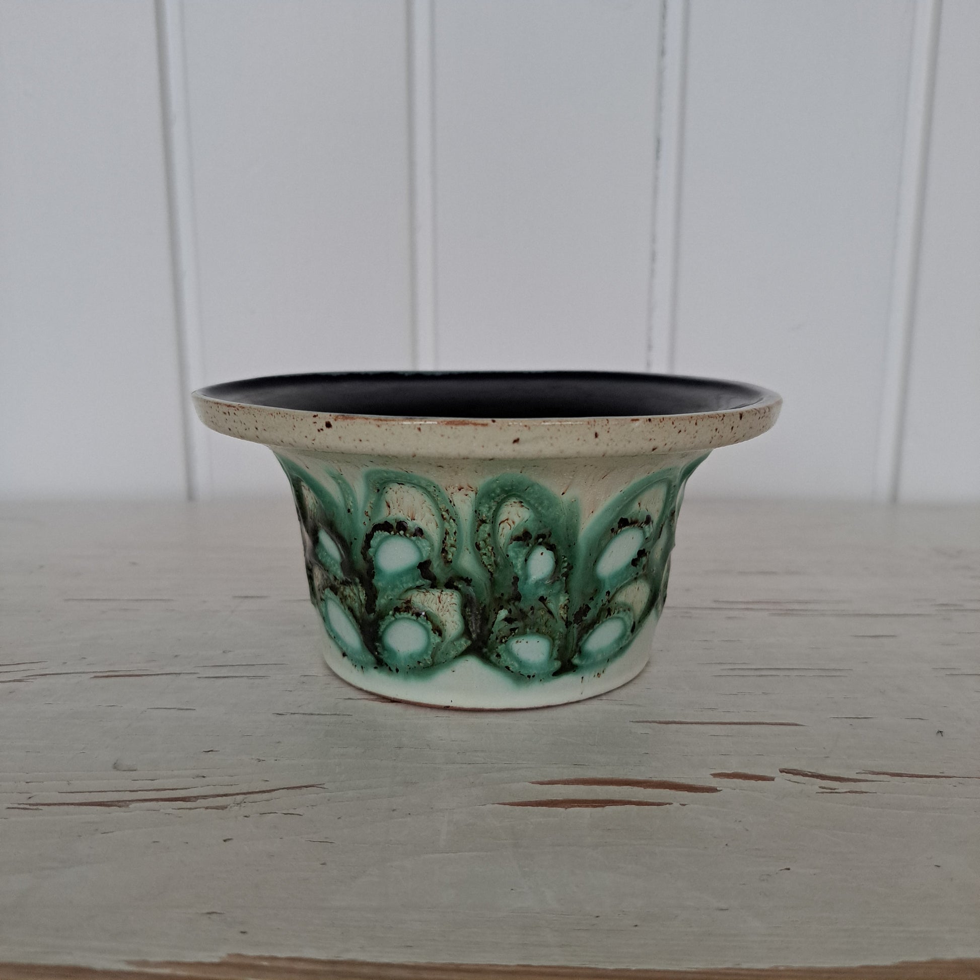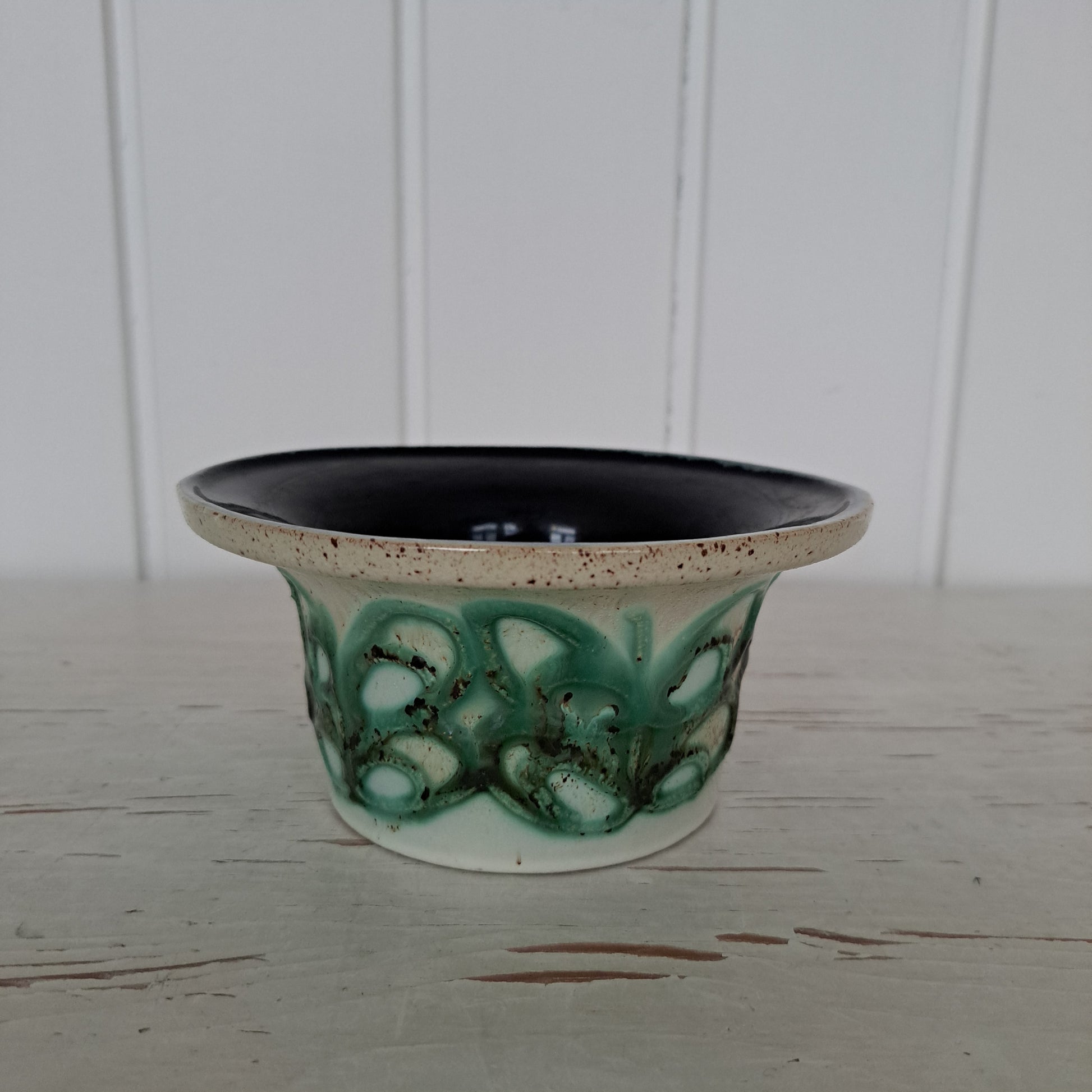 Saksalaisen Strehla Keramikin valmistama tyylikäs kulho 1970-luvulta. Kulho on ulkopuolelta maalattu ruskean, vaalean ja vihreän eri sävyin ja sisäosa on väriltään musta.