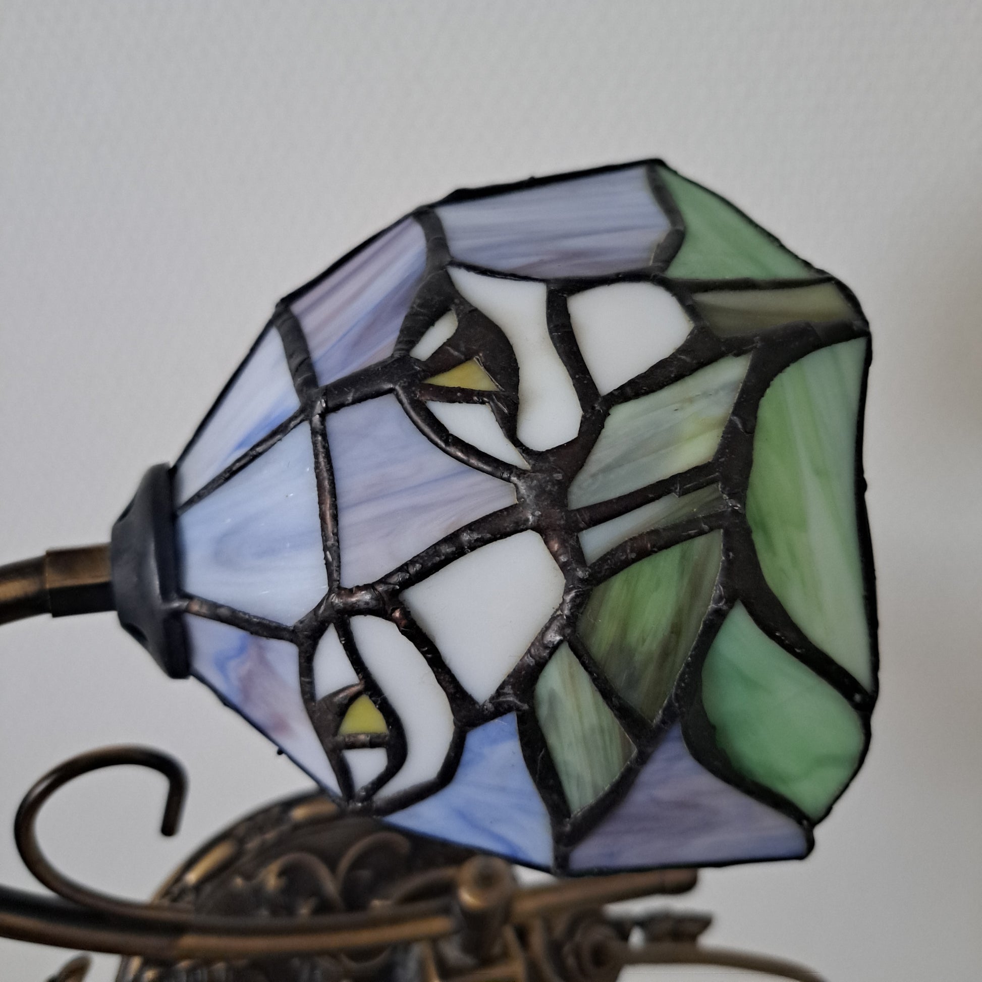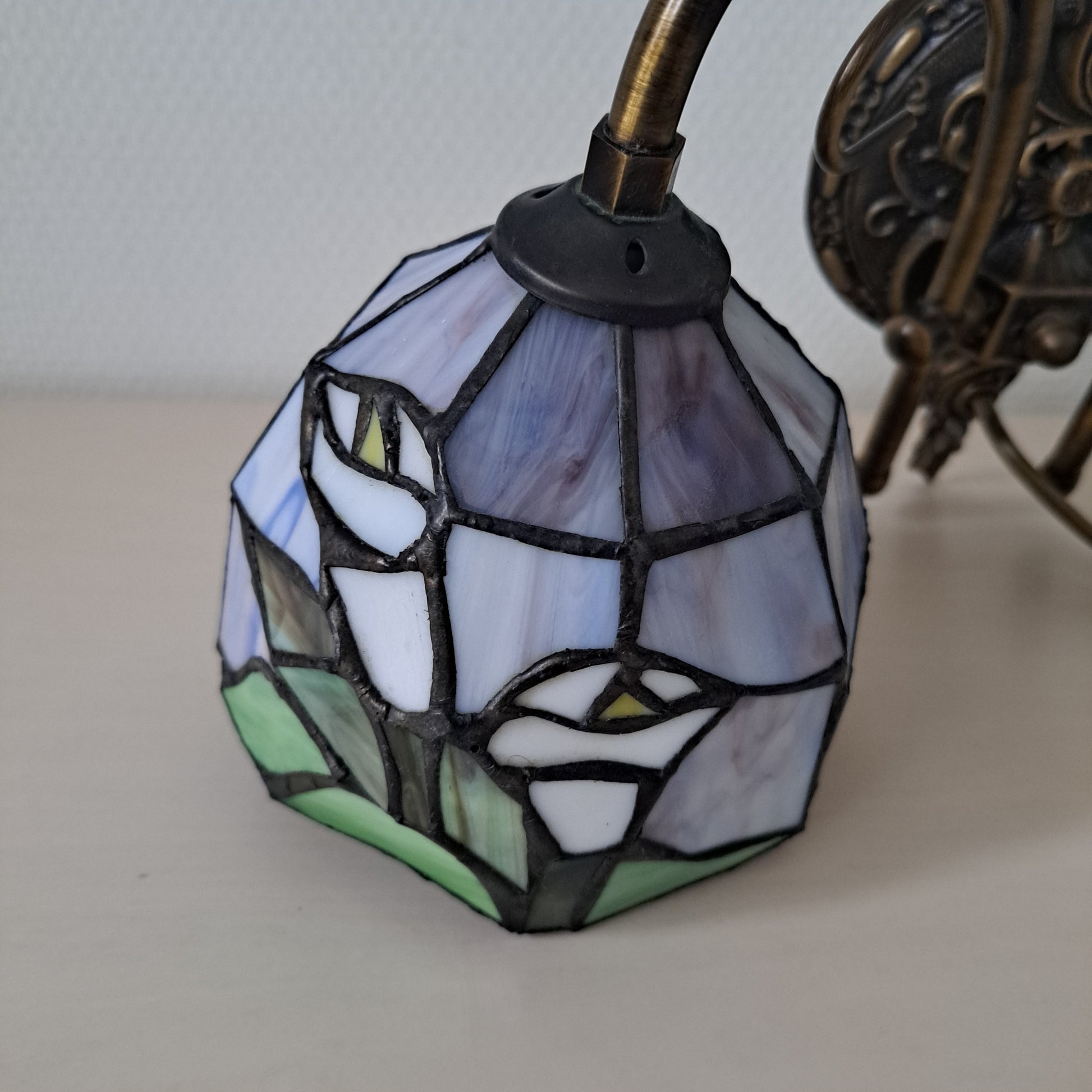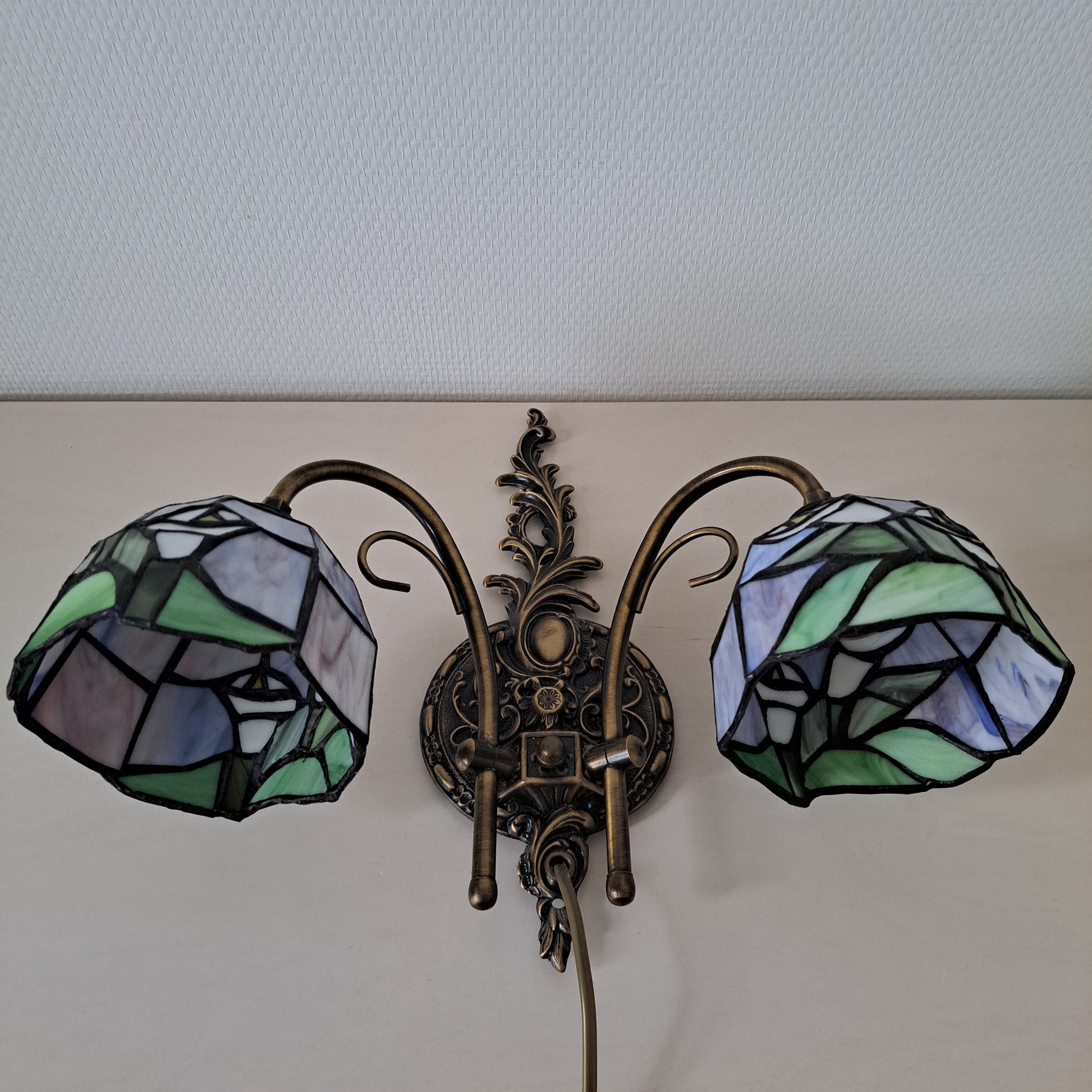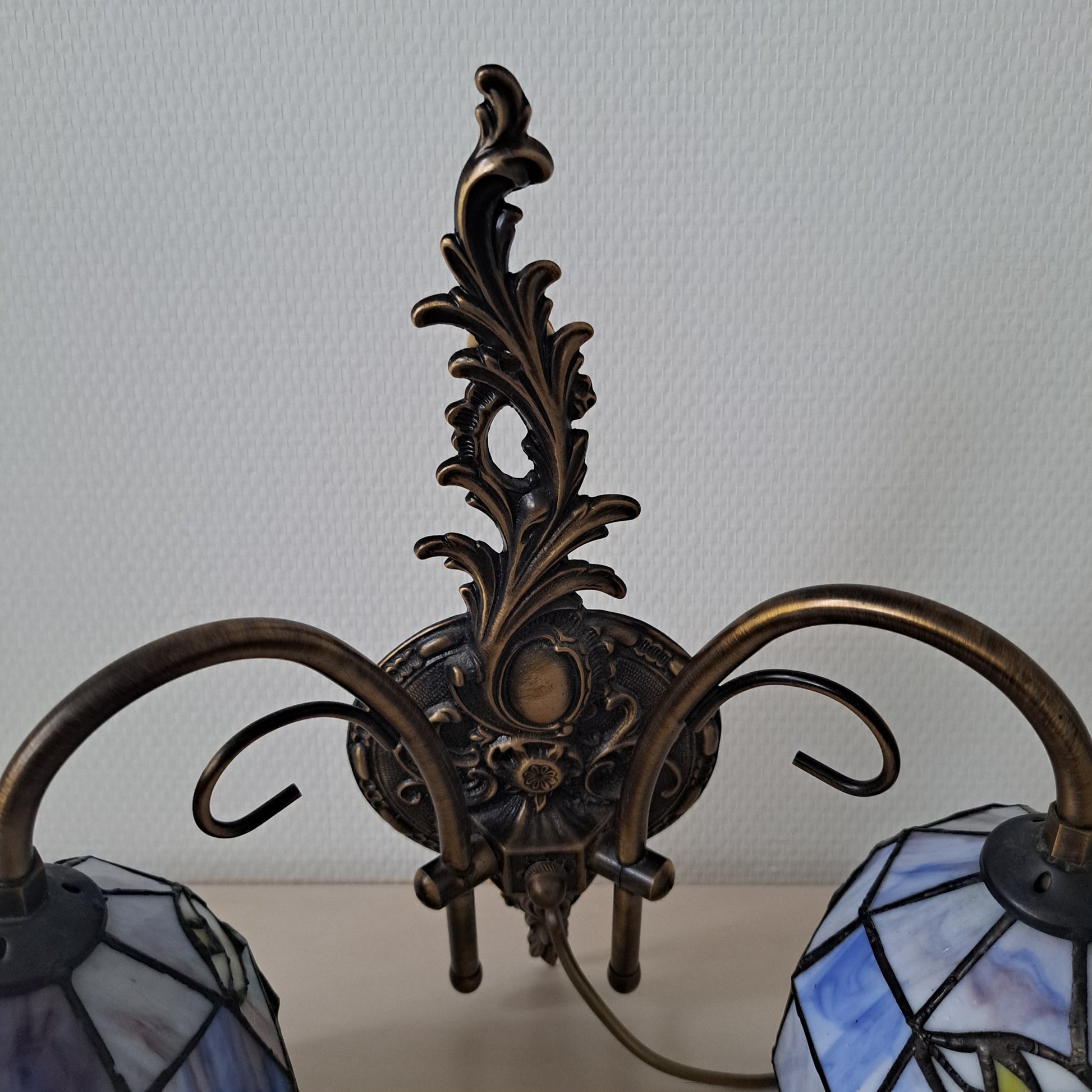 Ihastuttava seinälampetti, jossa on metallinen, koristeellinen runko sekä kaksi Tiffany henkistä lasikupua!